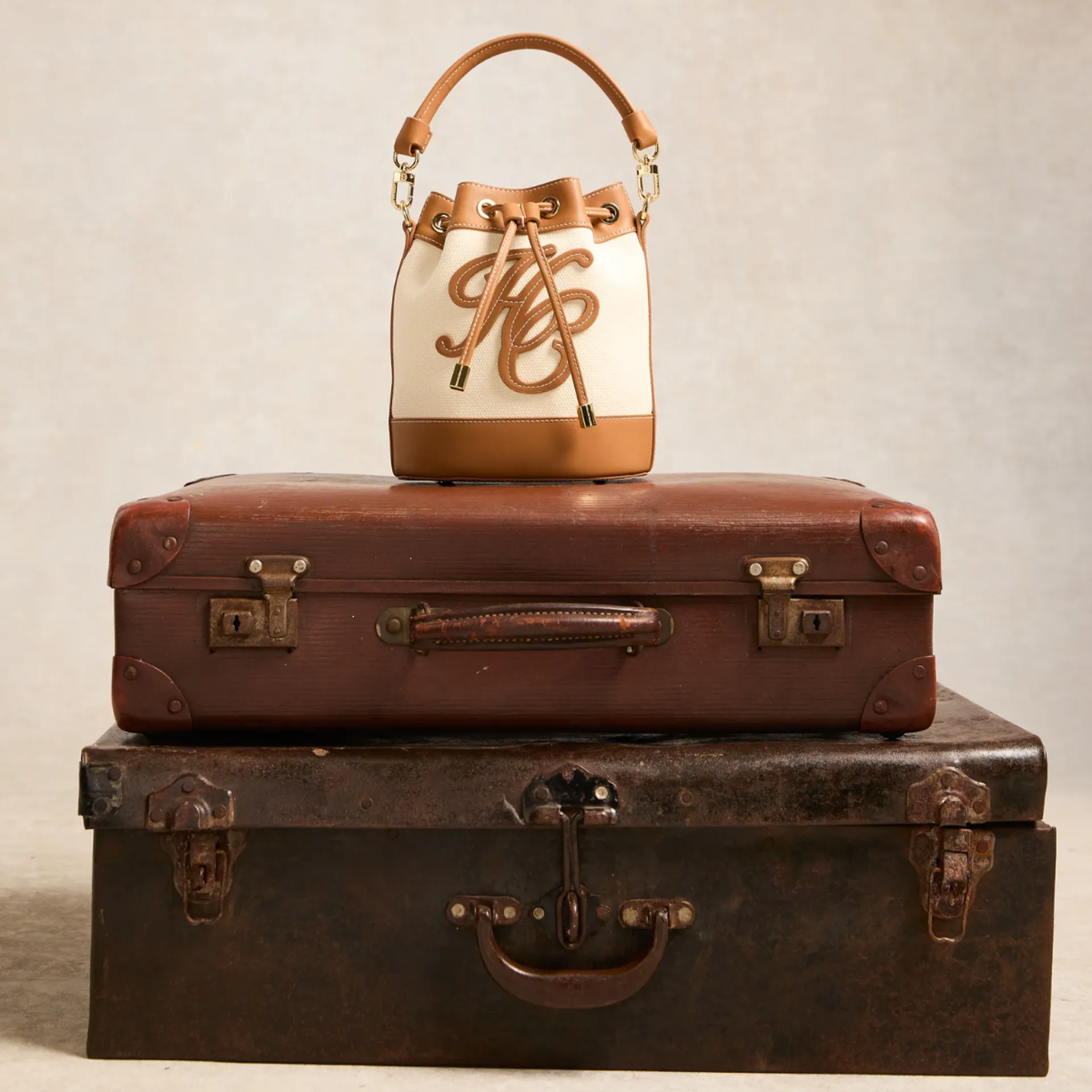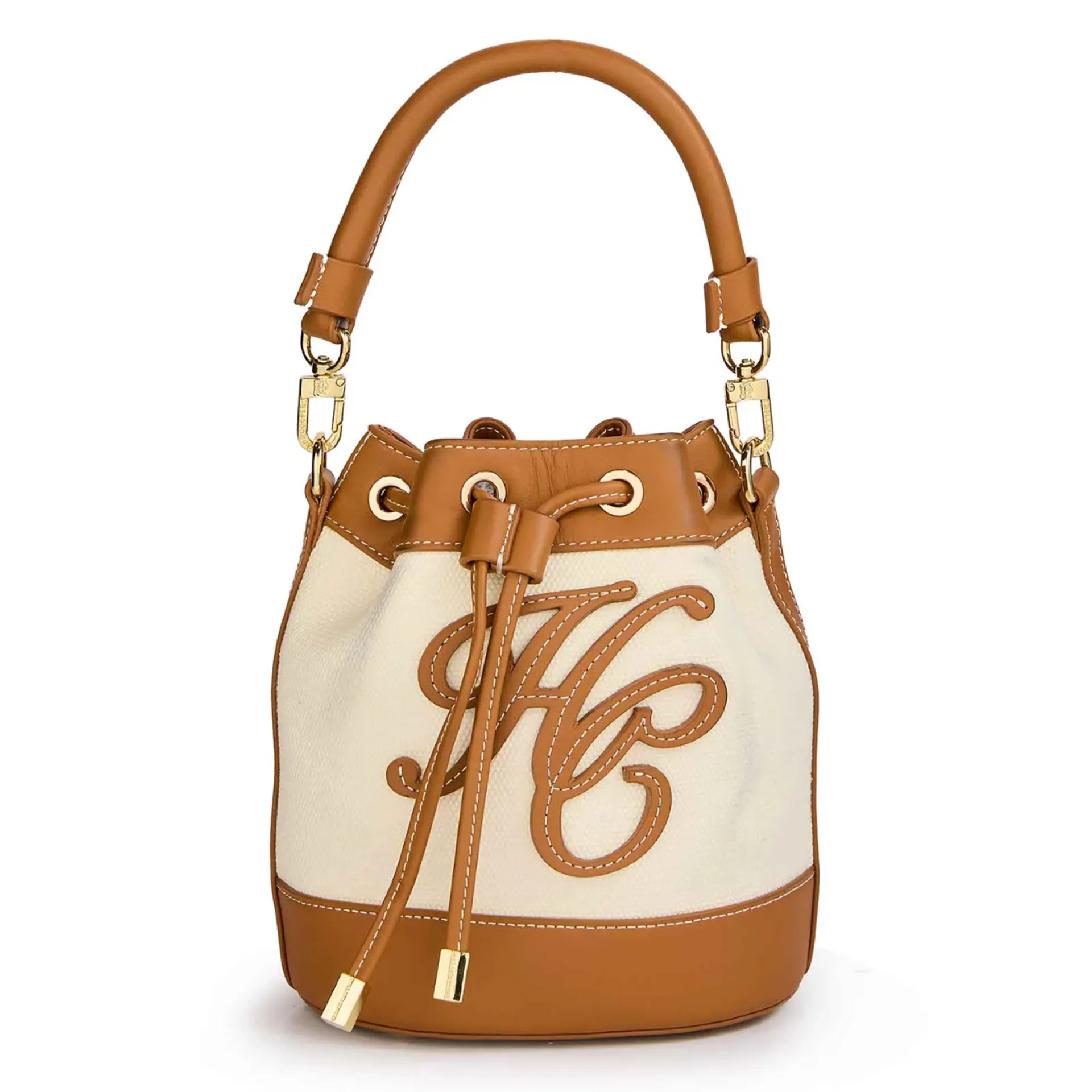 The Amalfi Bucket Bag embodies effortless sophistication, crafted from premium canvas with luxurious tan leather trim. This miniature masterpiece showcases our signature attention to detail with chunky contrast stitching and our distinctive leather patch. The fully adjustable strap features our iconic gold-toned hardware and aglets, elevating this everyday essential.