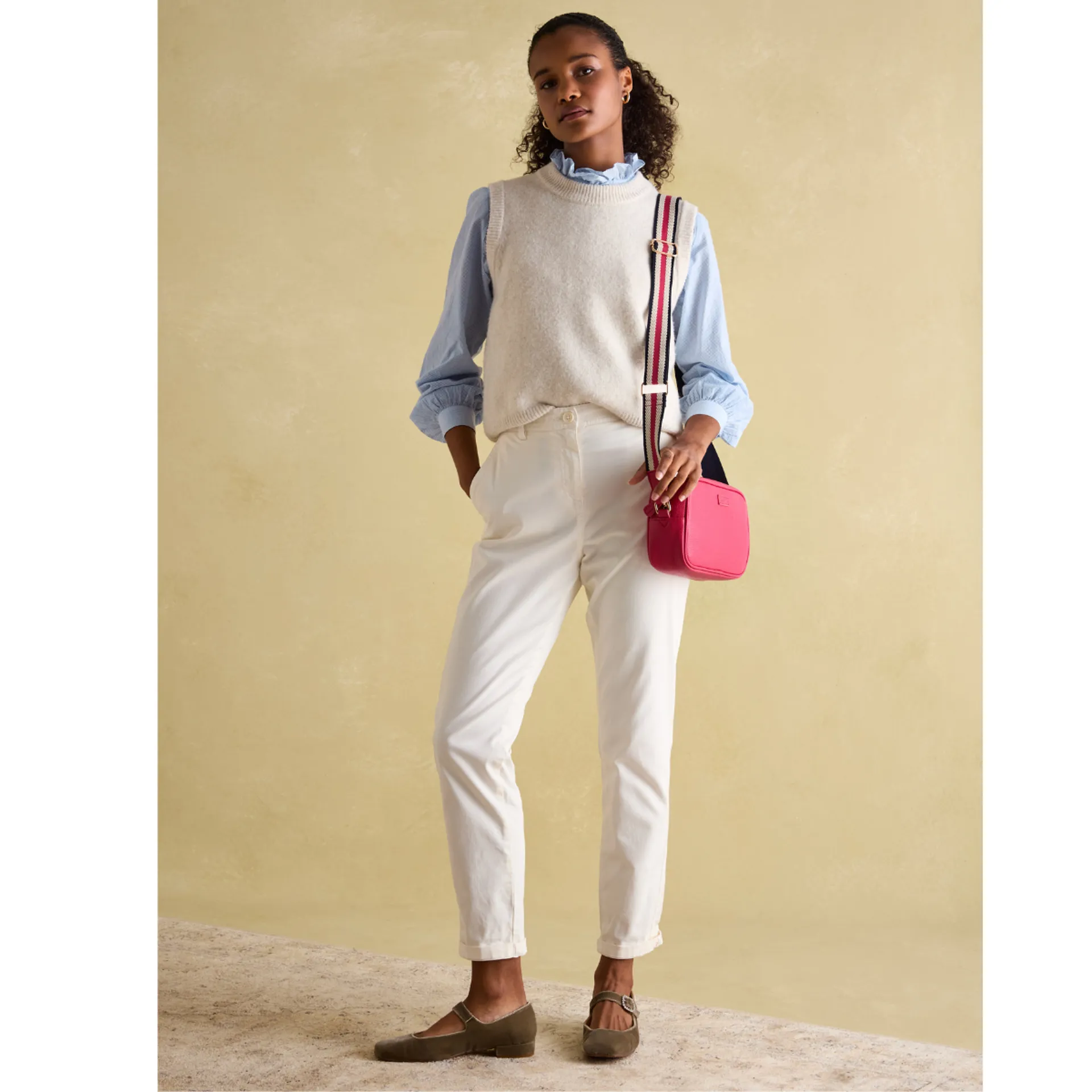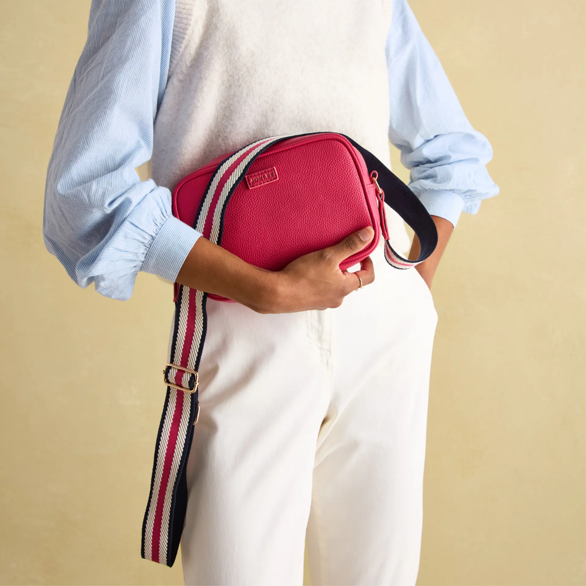 The contrasting webbing cross-body strap is adjustable so you can tailor the length and is fixed by two metal loops. Inside there's plenty of space for your essentials along with a slip-in pocket to separate smaller items. It's finished with Joules branding to the front.