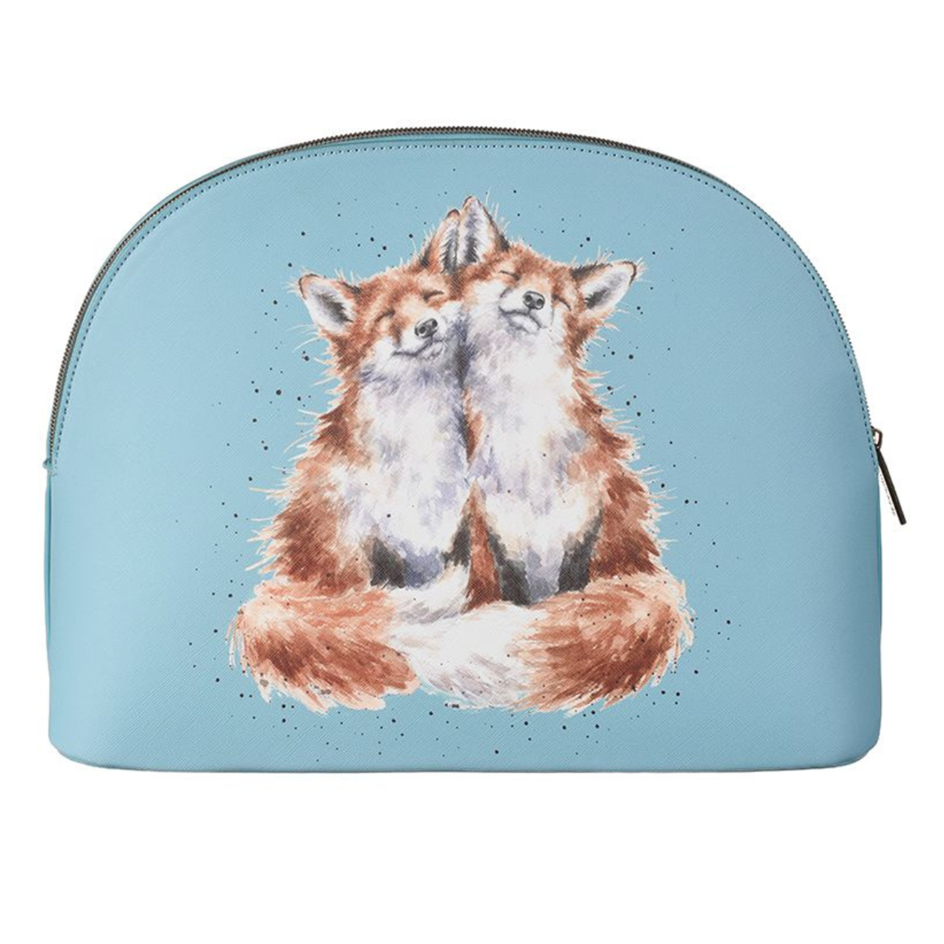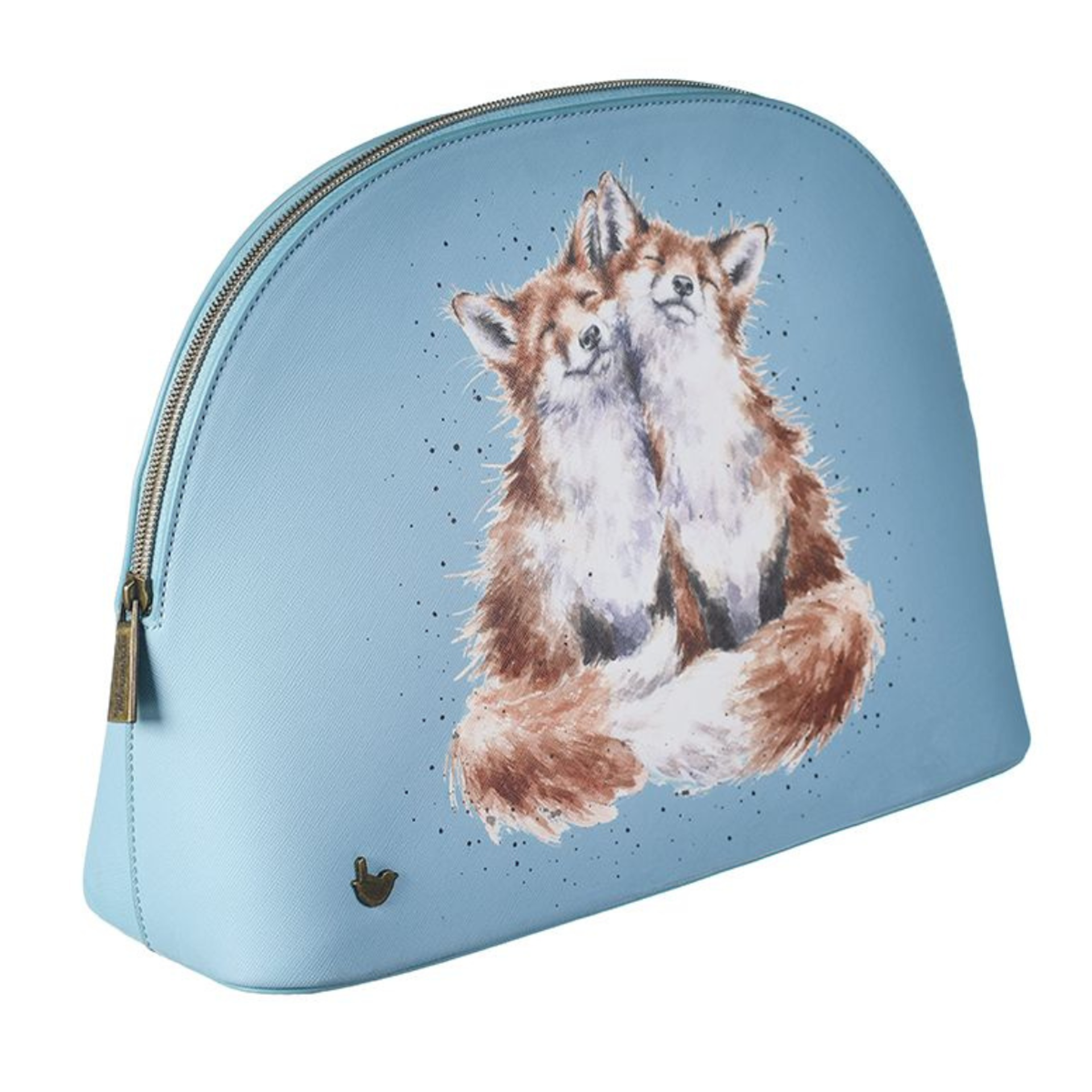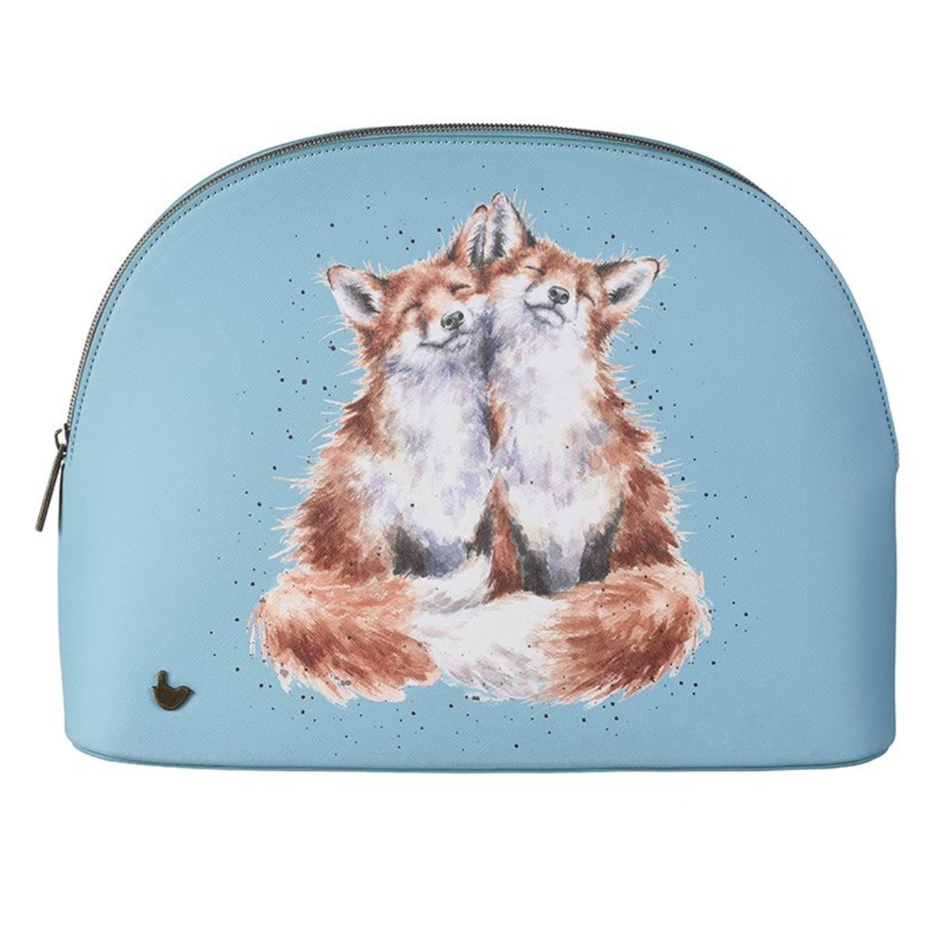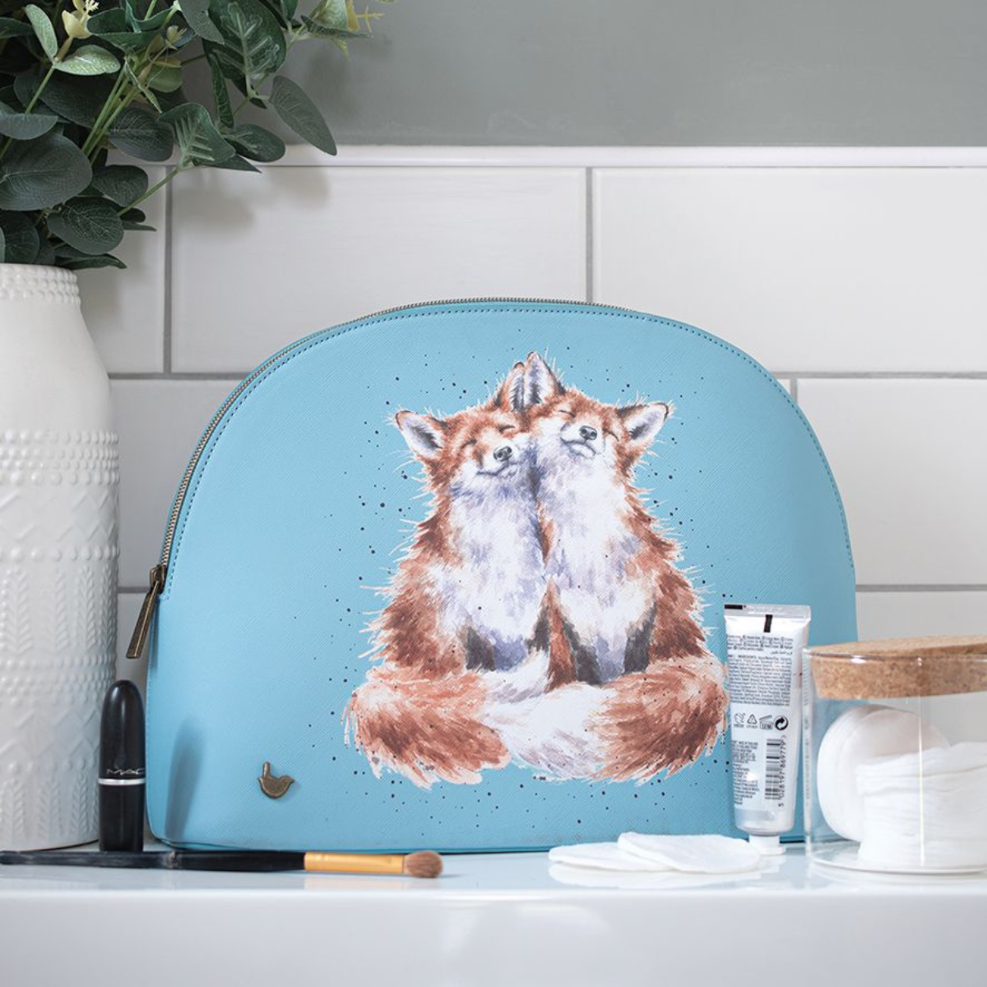 This beautiful large cosmetic bag featuring the 'Contentment' fox design is a great addition to anyone's Wrendale collection. With lots of space for make-up and all the essentials, a sturdy base, branded zip top fastening, antique brass wren stud and contrasting coloured interior this bag feels extra special and is a pleasure to use. 245mm x 330mm x 100mm. Made from textured vegan leather.
