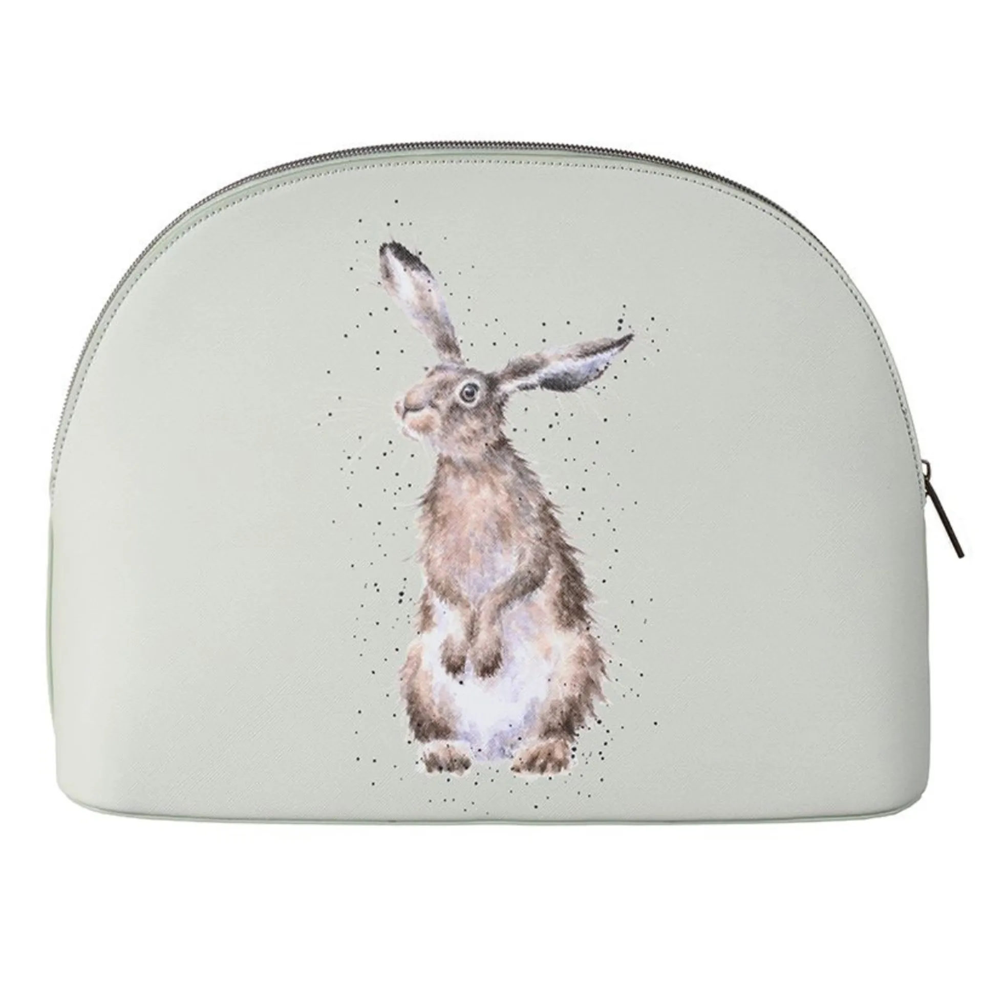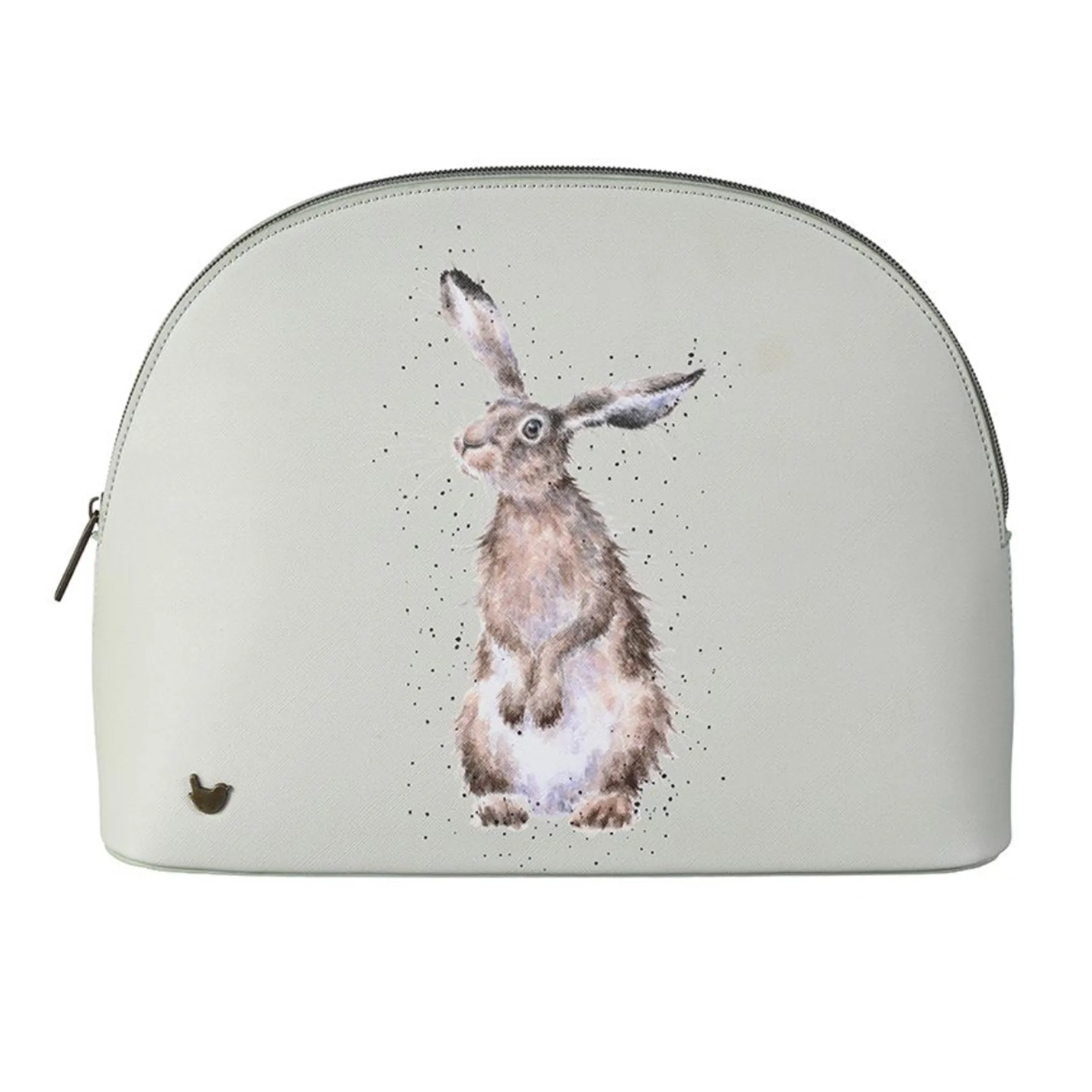 This beautiful large cosmetic bag featuring the 'Hare and the Bee' design is a great addition to anyone's Wrendale collection. With lots of space for make-up and all the essentials, a sturdy base, branded zip top fastening, antique brass wren stud and contrasting coloured interior this bag feels extra special and is a pleasure to use. 245mm x 330mm x 100mm. Made from textured vegan leather.