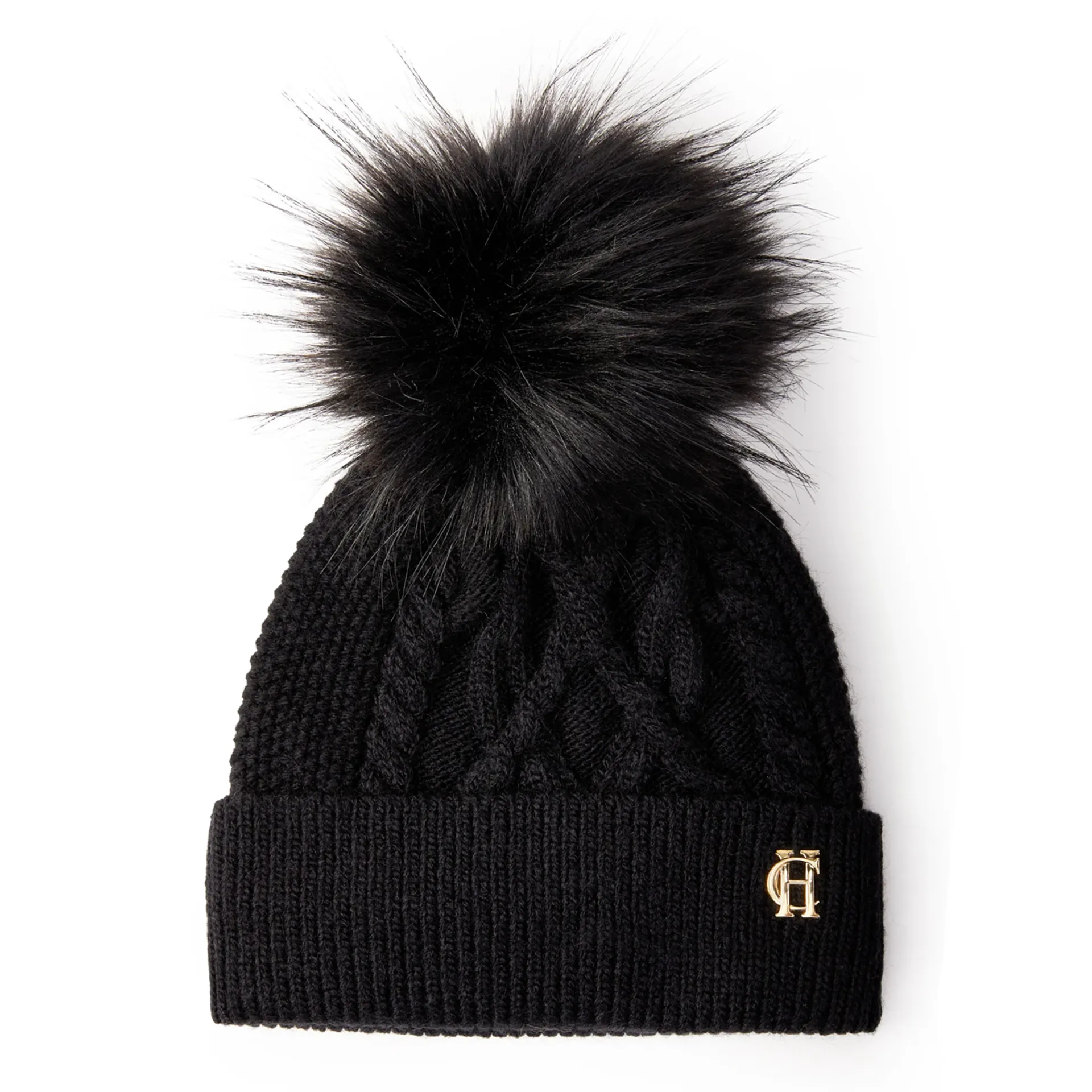 Crafted from a delicate & subtle yarn, this bobble hat has been beautifully designed with a luxurious detachable bobble crafted from faux fur. Created with a cable knit aesthetic & detailed with a subtle HC pin finish.