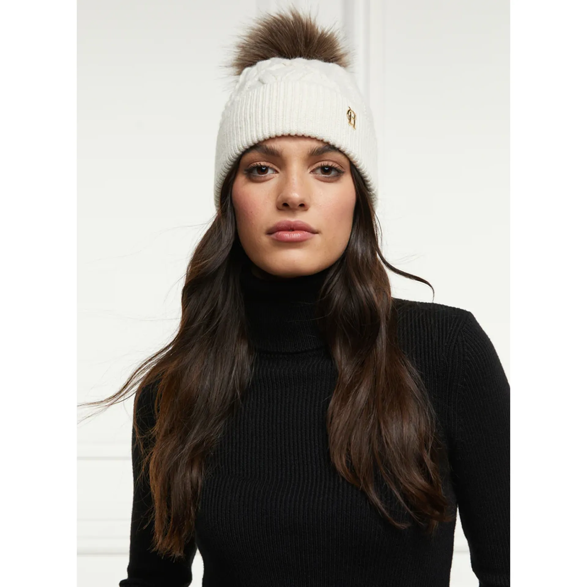 Crafted from a delicate & subtle yarn, this bobble hat has been beautifully designed with a luxurious detachable bobble crafted from faux fur. Created with a cable knit aesthetic & detailed with a subtle HC pin finish.