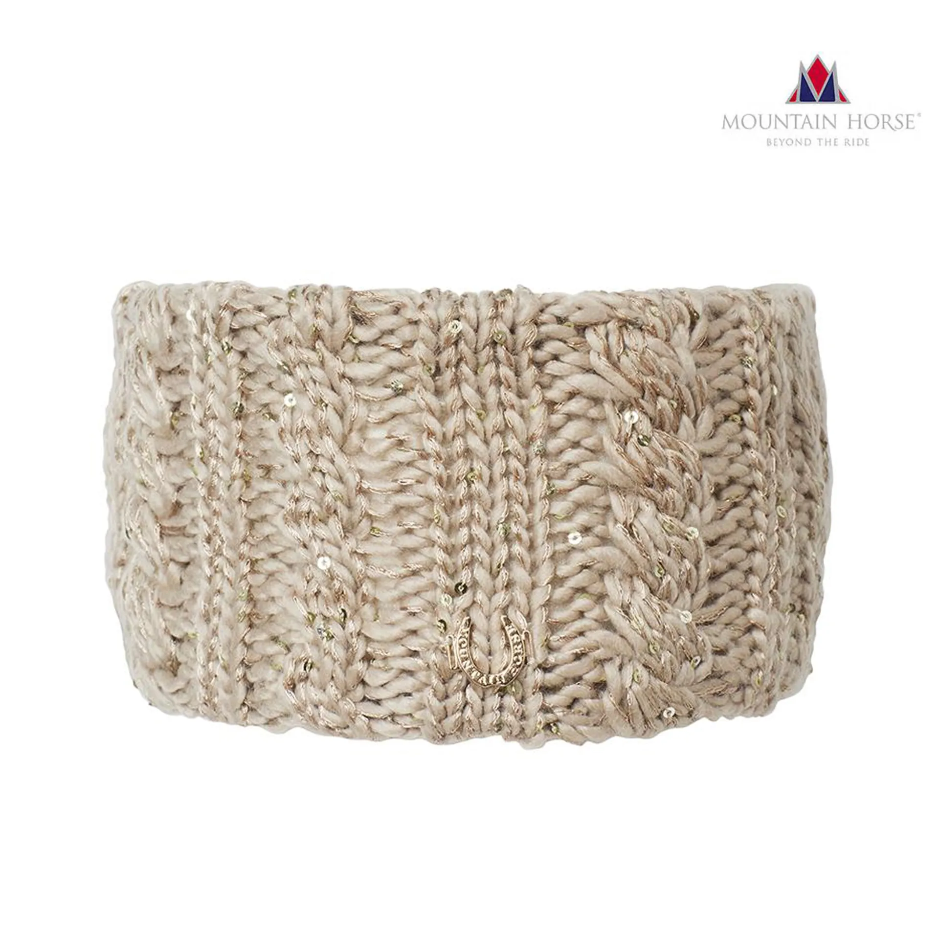 Knitted headband with sequins. MH horseshoe badge & fleece lining for comfort.