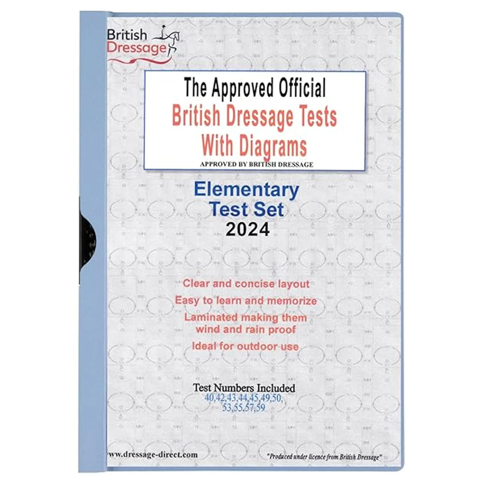 A4 size and in a clear and concise layout.These tests sheets with diagrams adjacent to each movement, are designed to help the rider understand and learn the movements of the dressage test more easily.The visual diagrams make it easier to switch between tests and to refresh the test in your mind before riding it.The test sets are laminated to ensure they are water, wind and tear proof and ideal for outdoor use whatever the weather.