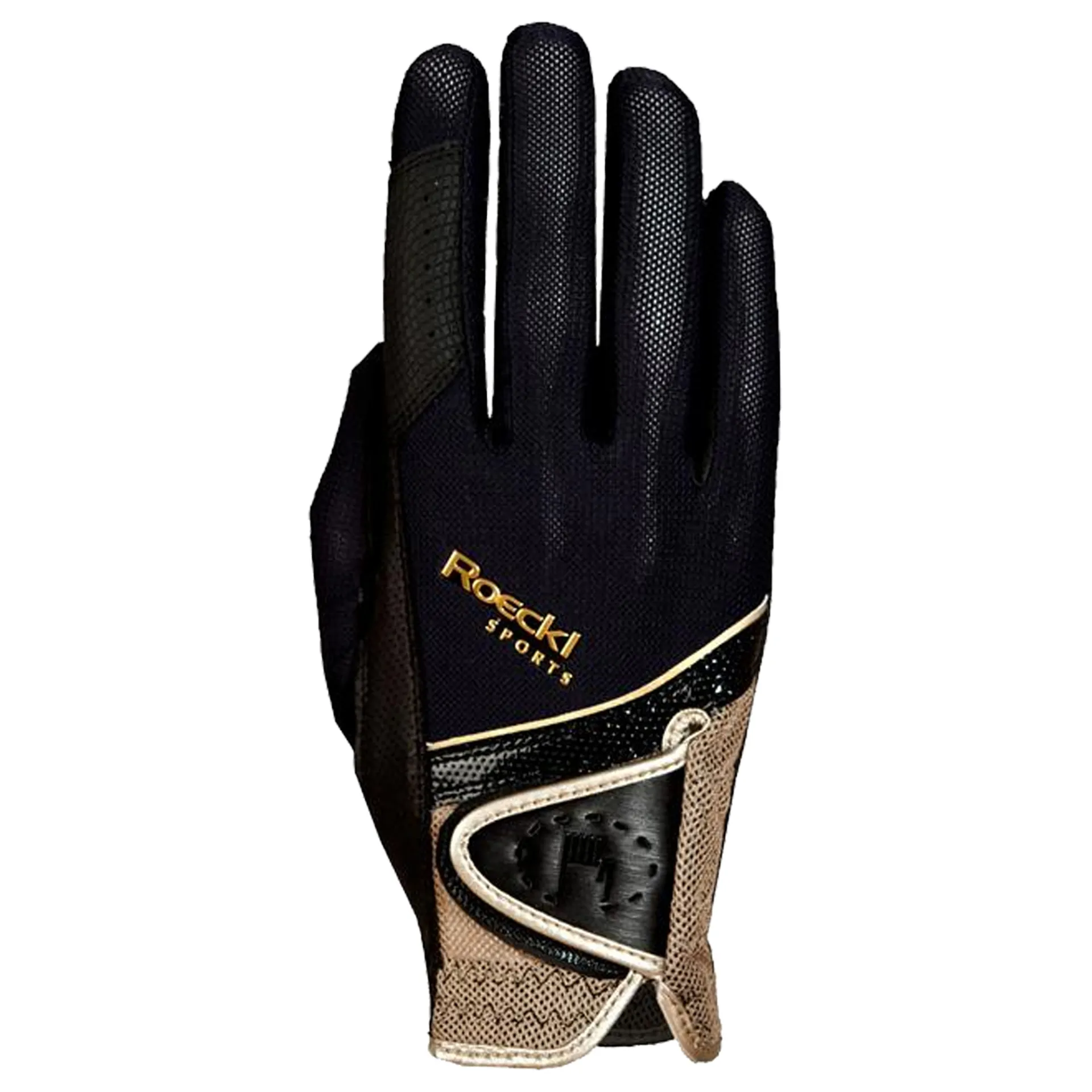 The MADRID represents design and functionality in perfection. The elaborate backhand design will captivate you with its combination of the finest materials. The metallic ROECKL lettering logo and the narrow, color-contrasting border in elegant gold or silver are real highlights. The technical fastener design with the characteristic ROECKL hand logo emphasizes this glove’s modern and sporty look. Yet this model has more to offer than just a great design: the backhand is made from especially light-weight and soft Micro Mesh. For the palm, the Munich-based glove tailors have selected Drytec G5 with Slip Stop, thereby guaranteeing ideal wear comfort, tactility and a perfect grip on the reins. Thanks to ROECKL’s exclusive COMFORT-CUT, an extra trimming on the index finger is not required. The glove is reinforced with trimming in strategic locations for handling the curb bit. In addition, this highlight of the collection is TOUCHSCREEN COMPATIBLE, allowing you to use your iPhone, smartphone or other mobile devices without having to take off your gloves.