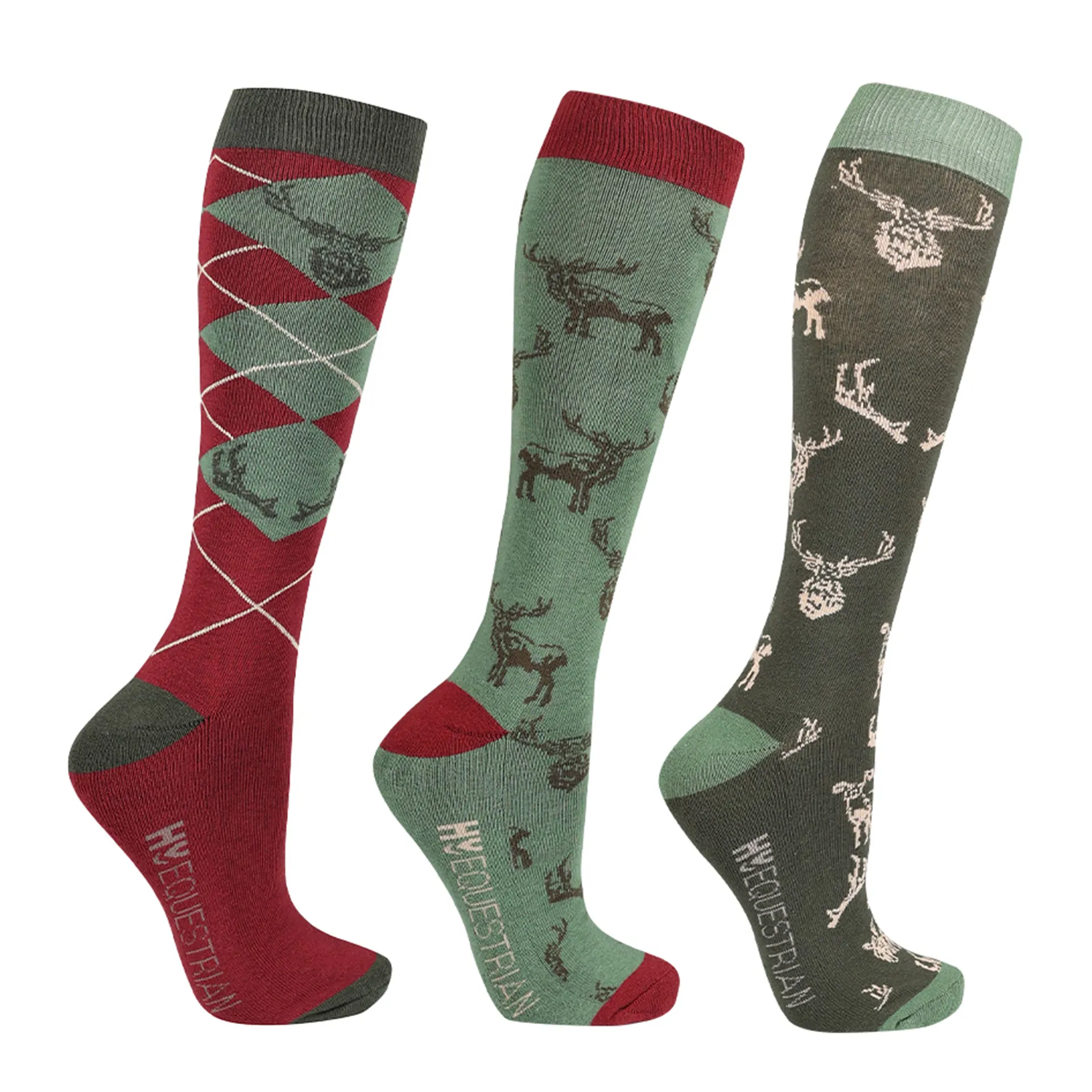 The first features a classic argyle pattern with stag and deer throughout. The second is a beautiful moss colour with repeat antler and stag patterns. The third is thyme green, with the repeated stag head, deer and antler pattern. All with coordinating heel and toe.