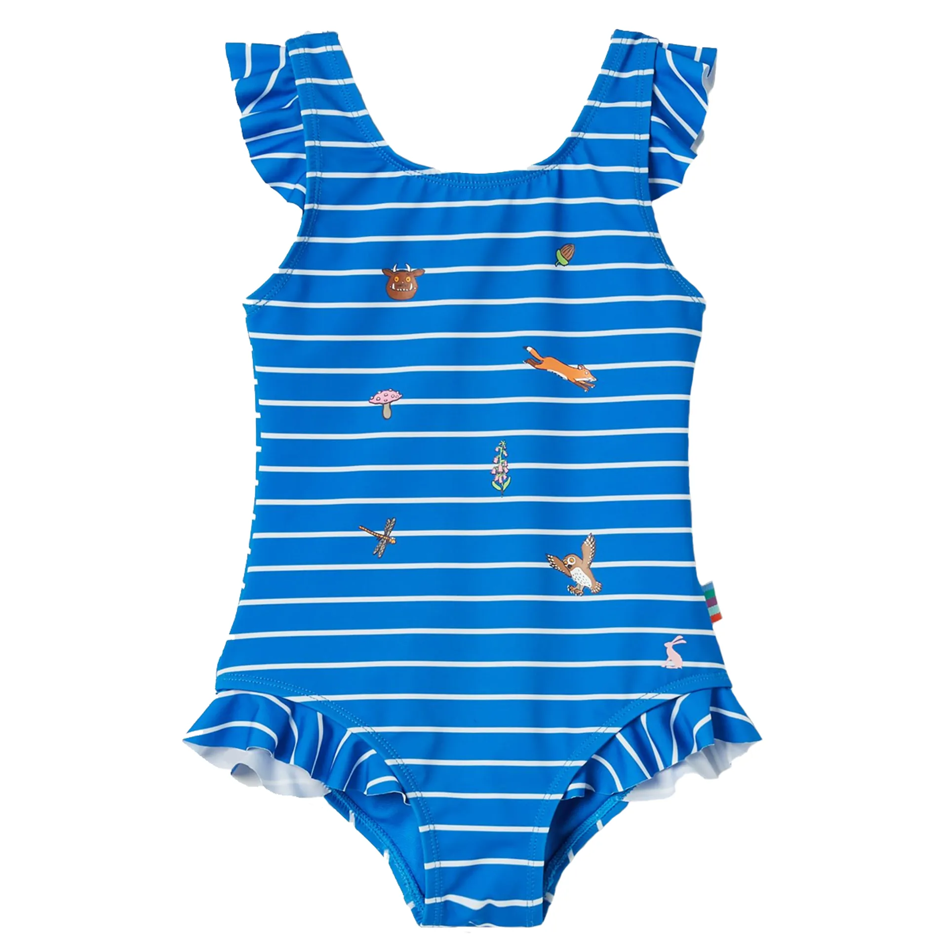 Now your little one can take a dip in the pool or go for a splash in the paddling pool with their favourite characters from The Gruffalo. Part of our official collection with The Gruffalo it's as charming as it is practical. The swimsuit has a UPF (Ultraviolet Protection Factor) of 40+ so it will keep them safe in the sun. It's finished with frilled detailing to the legs and shoulders and comes in a striking blue stripe.