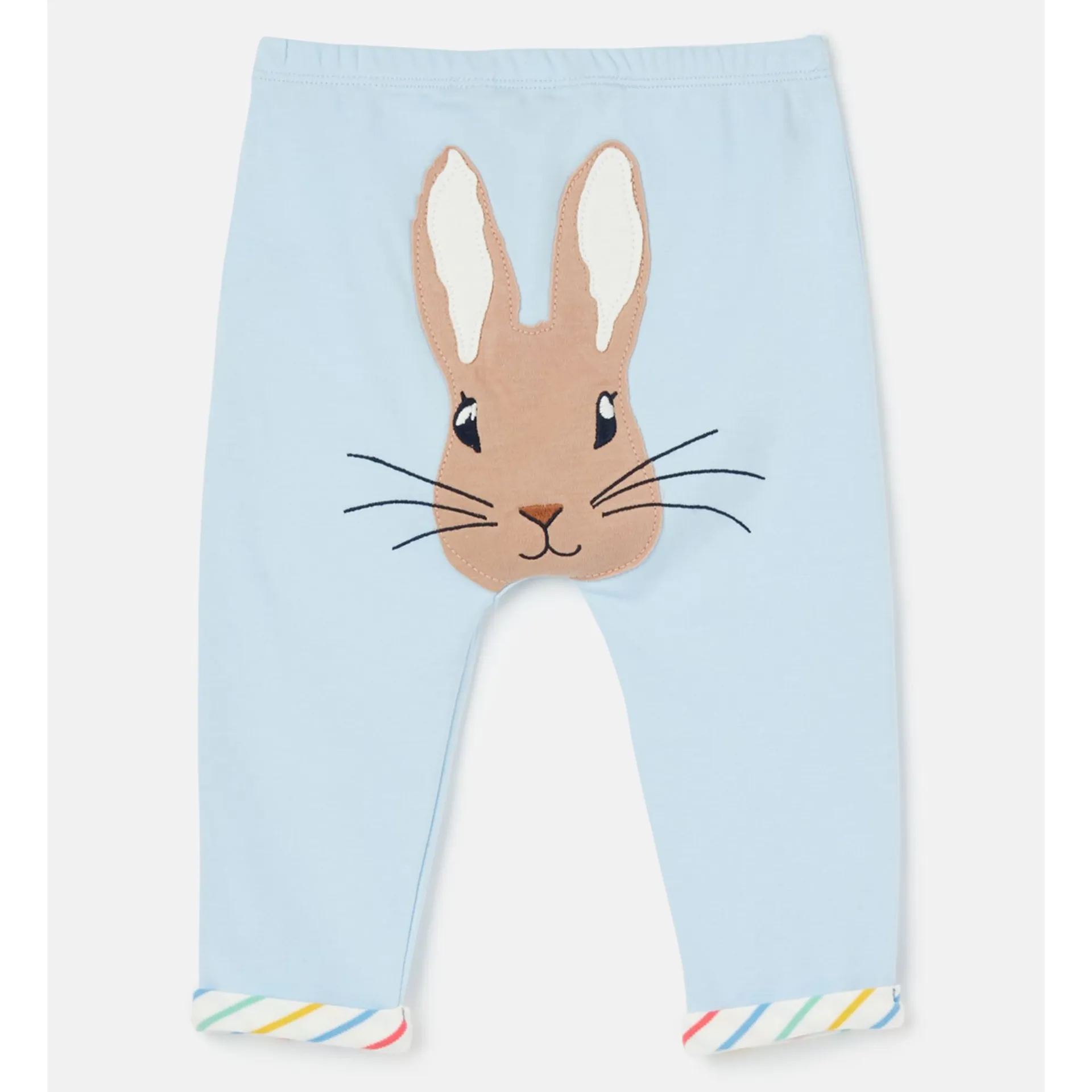 These trousers are part of our official Peter Rabbit Collection. So, everyone's favourite bunny must be hiding around here somewhere… Ah ha, found him! Turn them around to find a super-cute applique to the bum. The trousers have turn up cuffs that reveal a colourful print, they have an elasticated waistband and no front or back rise which helps create a fuller shape.