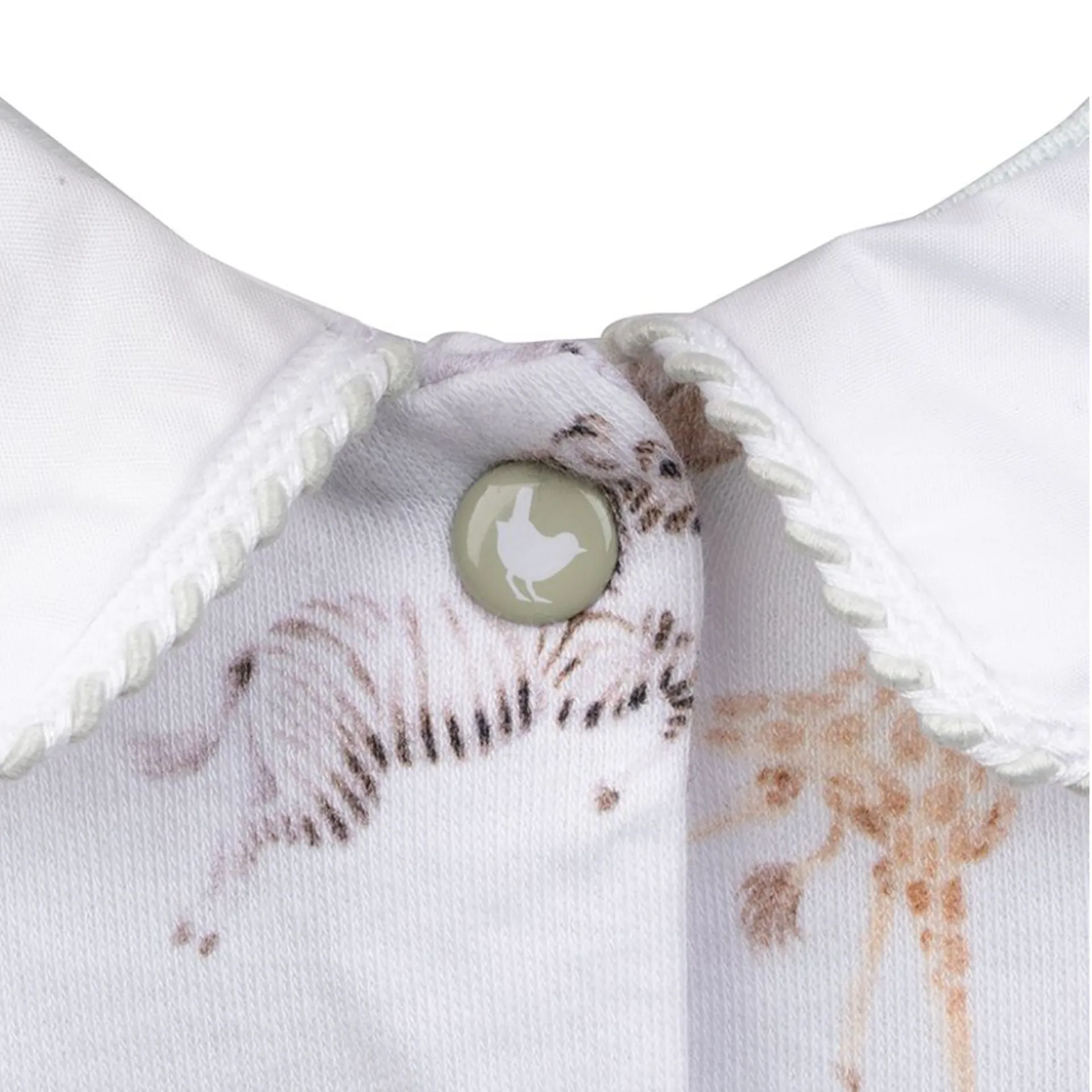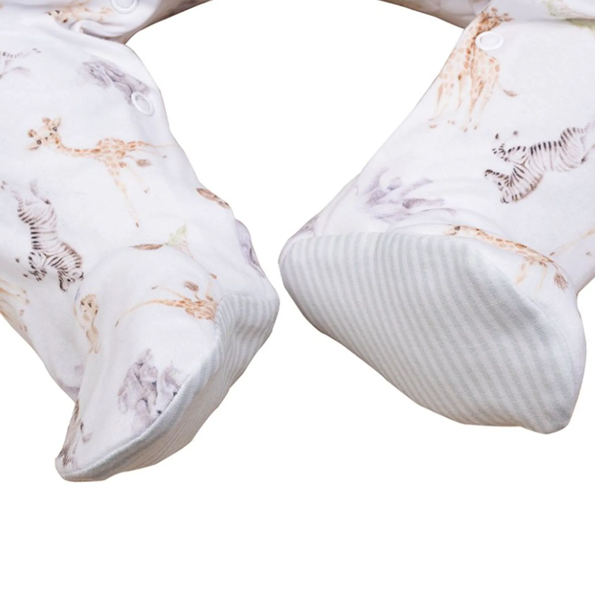 In our gorgeous Little Savannah design this super soft patterned baby grow is perfect for keeping little ones warm and comfortable. Featuring lots of baby animal illustrations on a white background, a Peter Pan collar with complimentary green coloured trim and coordinating green striped feet give an extra special touch. Each baby grow has integral scratch mitts and a full popper fastening with a coloured, branded popper for easy changing.