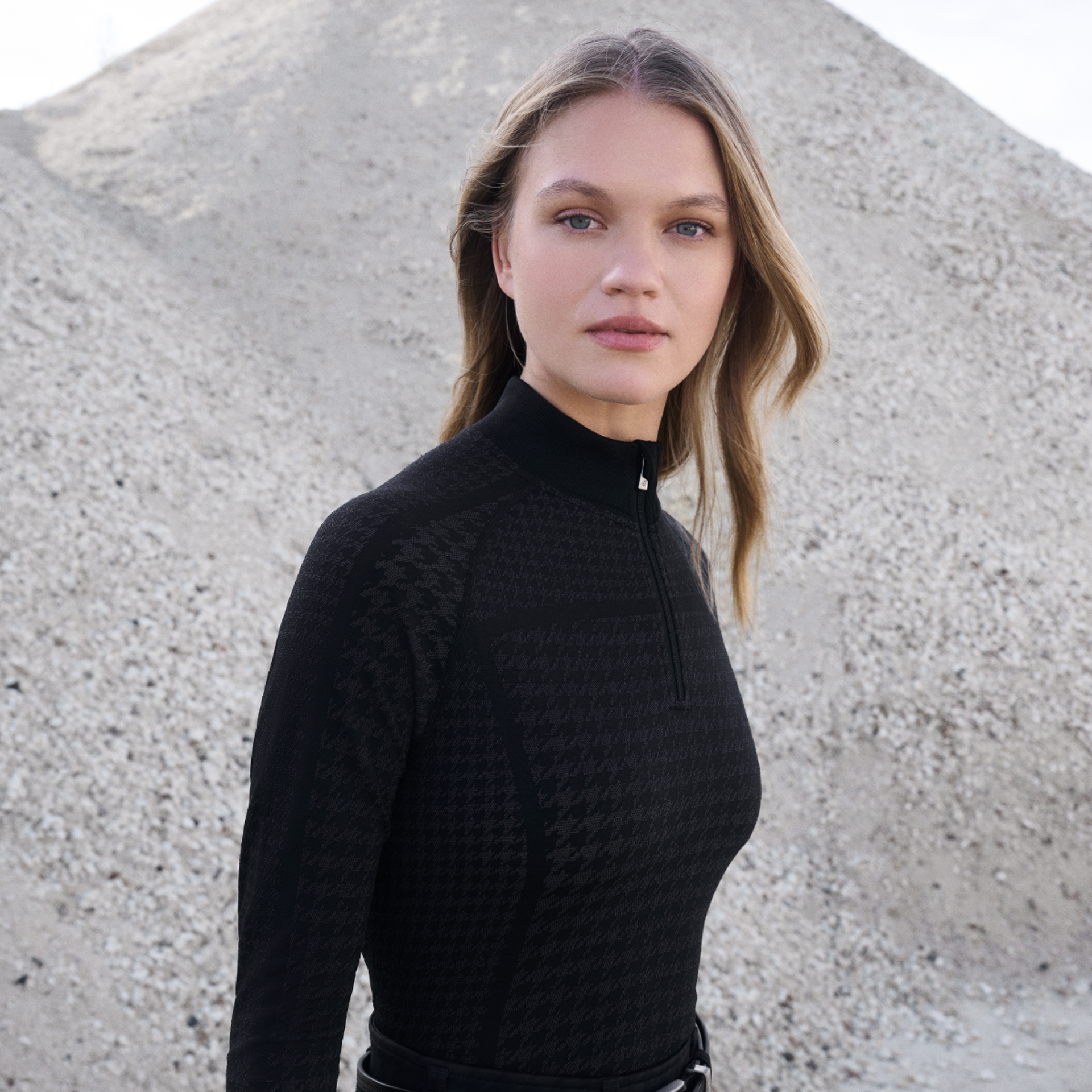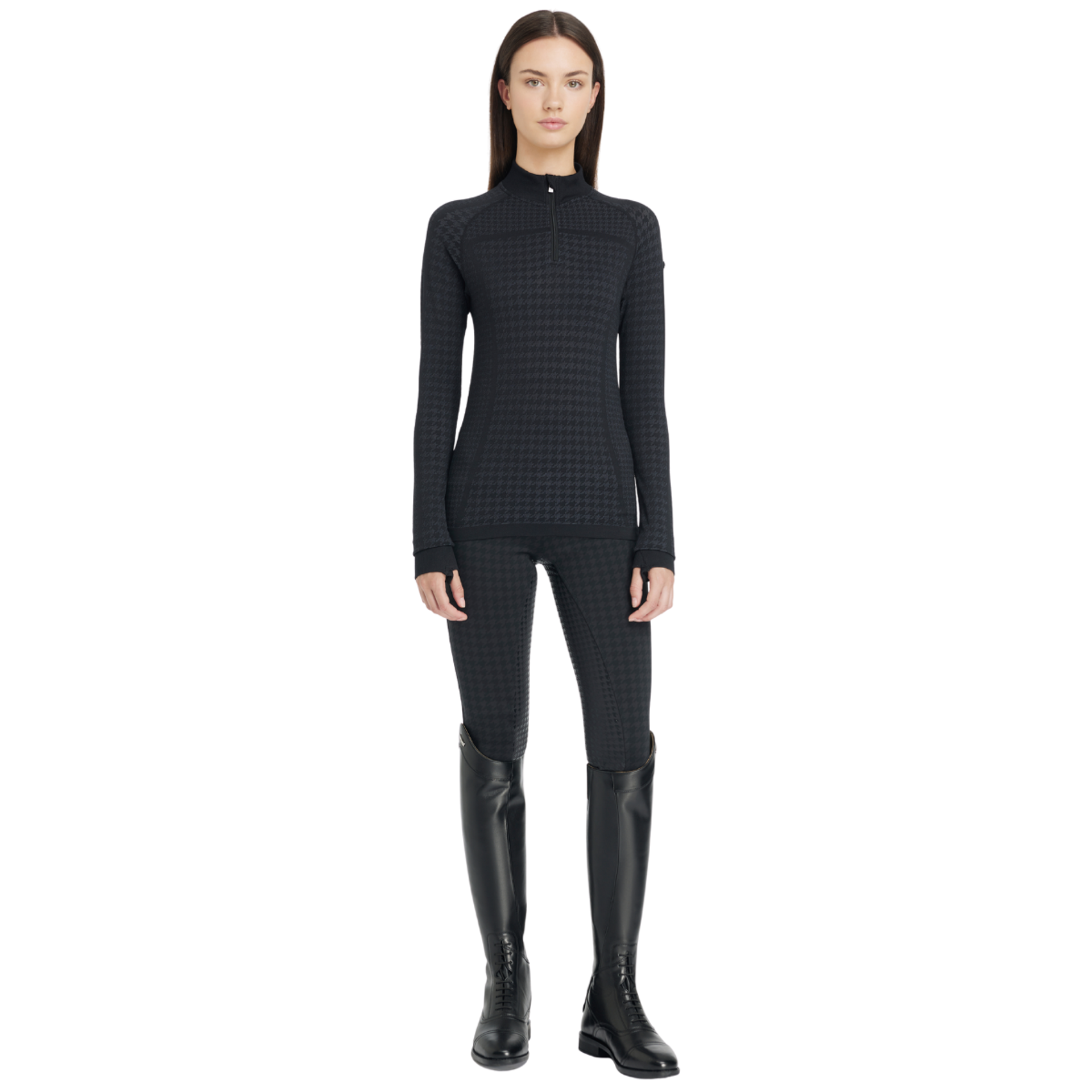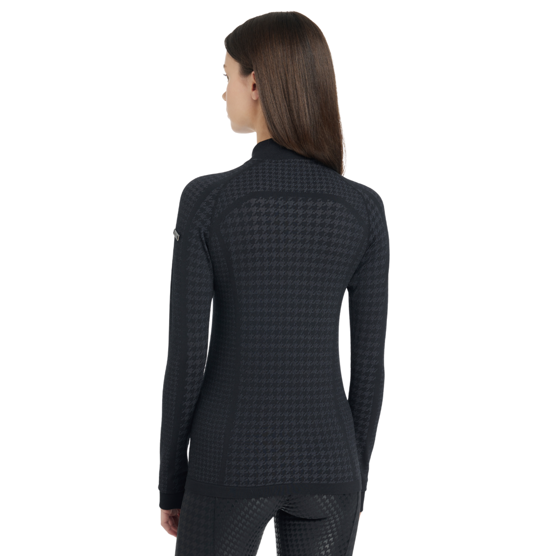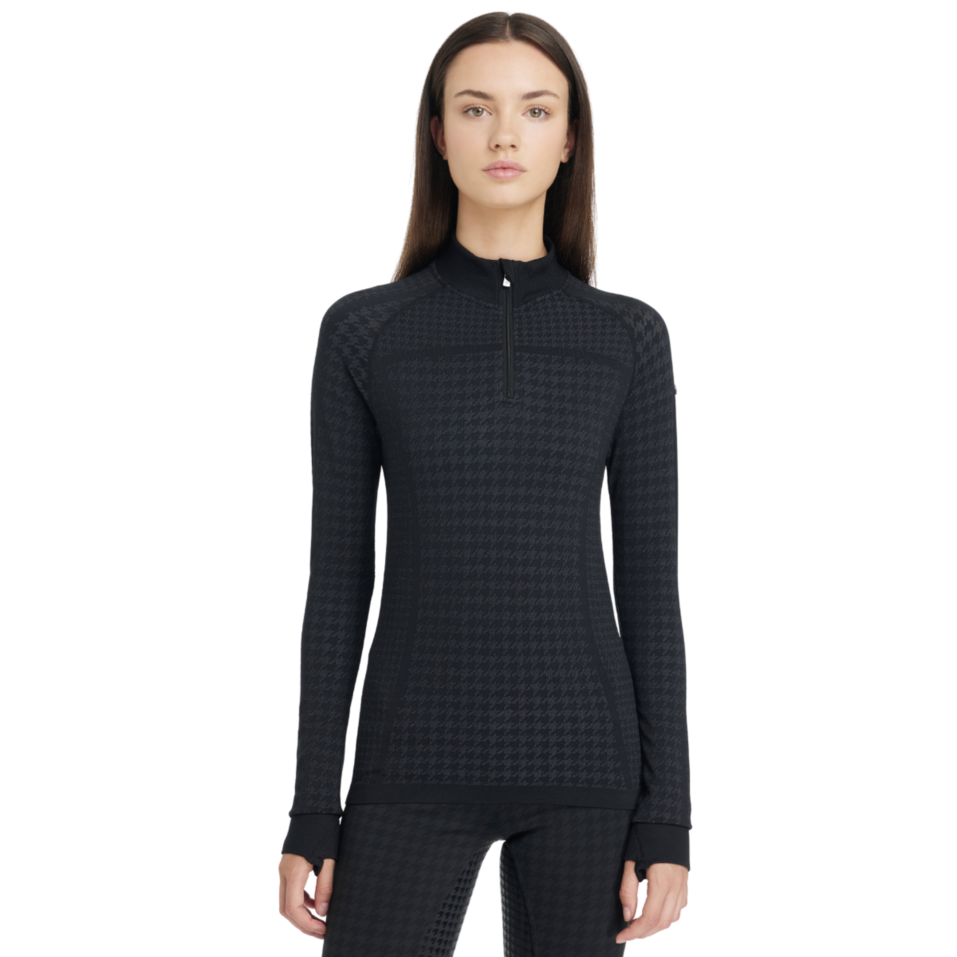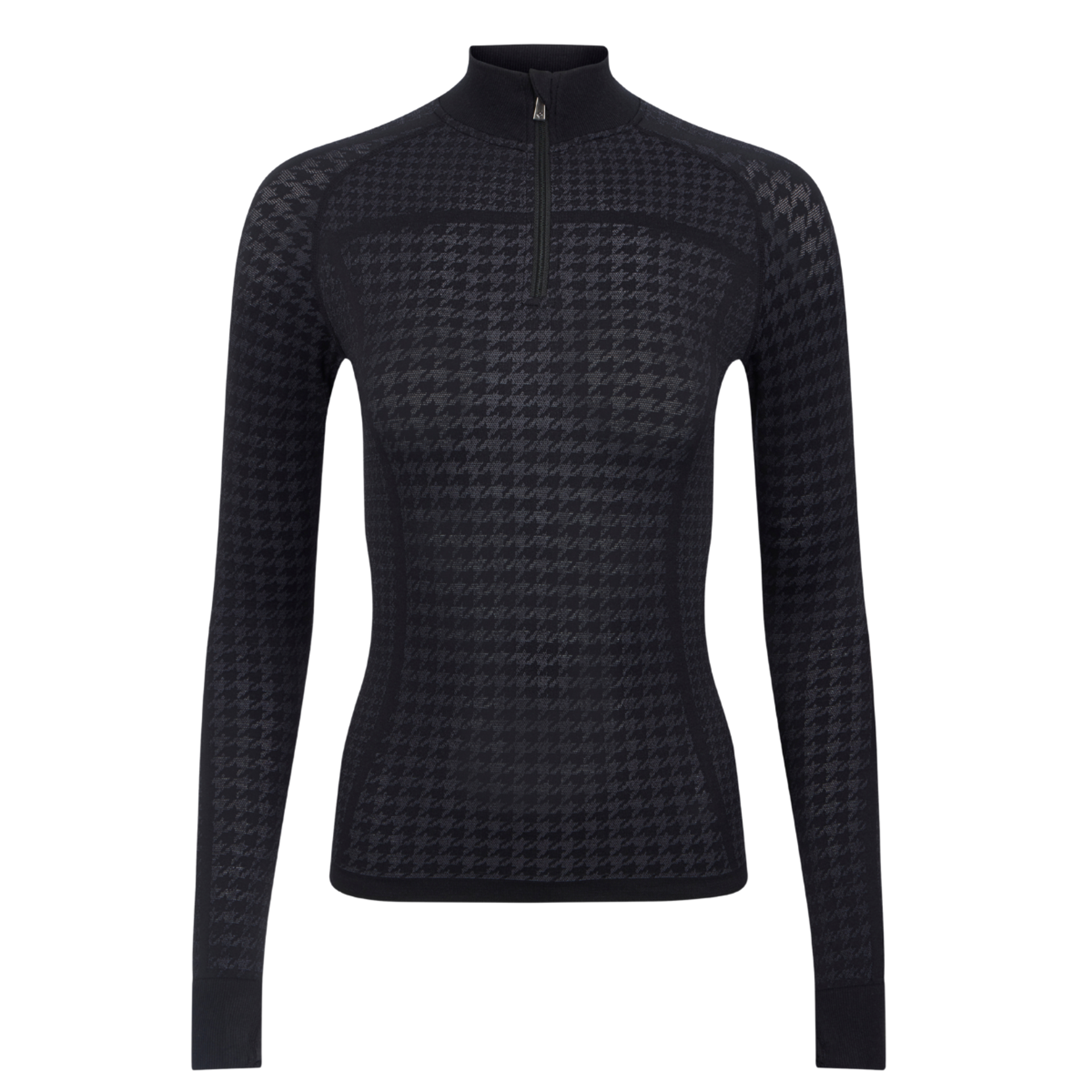 Lightweight and sweat-wicking with a sophisticated houndstooth pattern, it features a ribbed neck and cuffs with comfortable thumb holes.