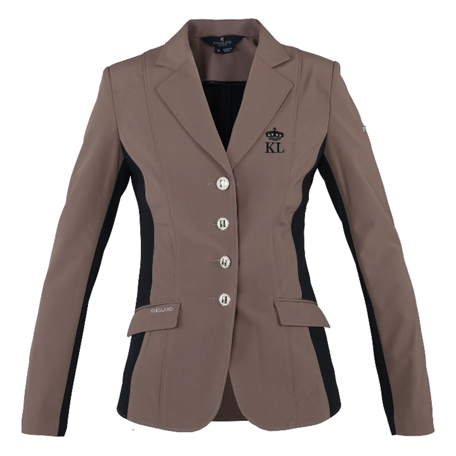 Ladies show jacket in woven softshell fabric. Side panels in mesh. Embroideries on left chest & right pocket, logo buttons. Silicone patch on lower right back. Metal stud on left sleeve. Machine washable 30°c