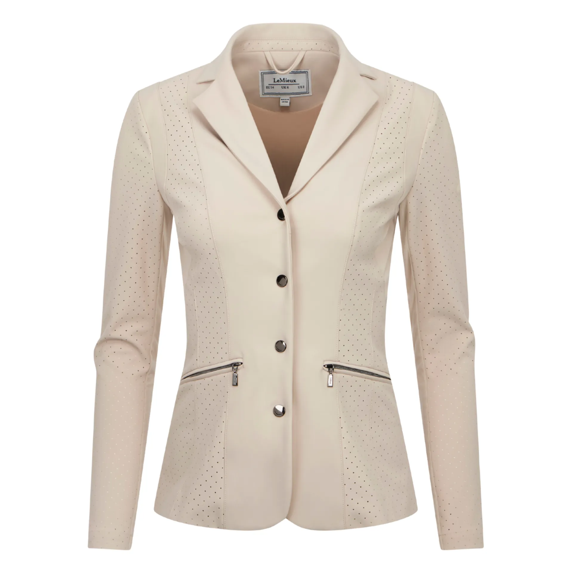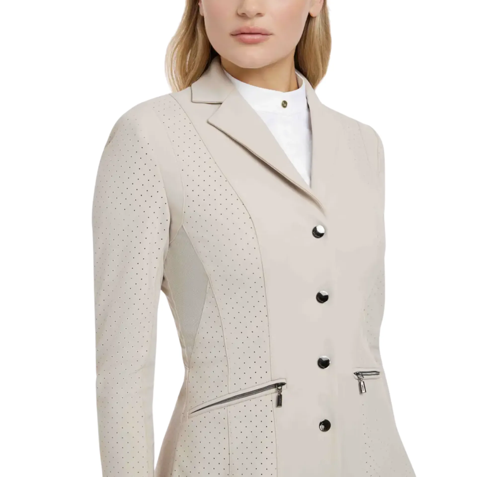 Competing in hot climates can be challenging, but this specialist technical performance jacket makes beating the heat a breeze.It's a lightweight, breathable show jacket designed to take care of the temperature so you can focus on performing your best. Perforated panels and ultra-fine mesh under the arms and armpits ensure ventilation and airflow, no matter how hard you work.With elegant yet sporty contour seam lines and exposed zip pockets, it uses minimal fabric to maximum effect, to fit and flatter your figure as you ride.