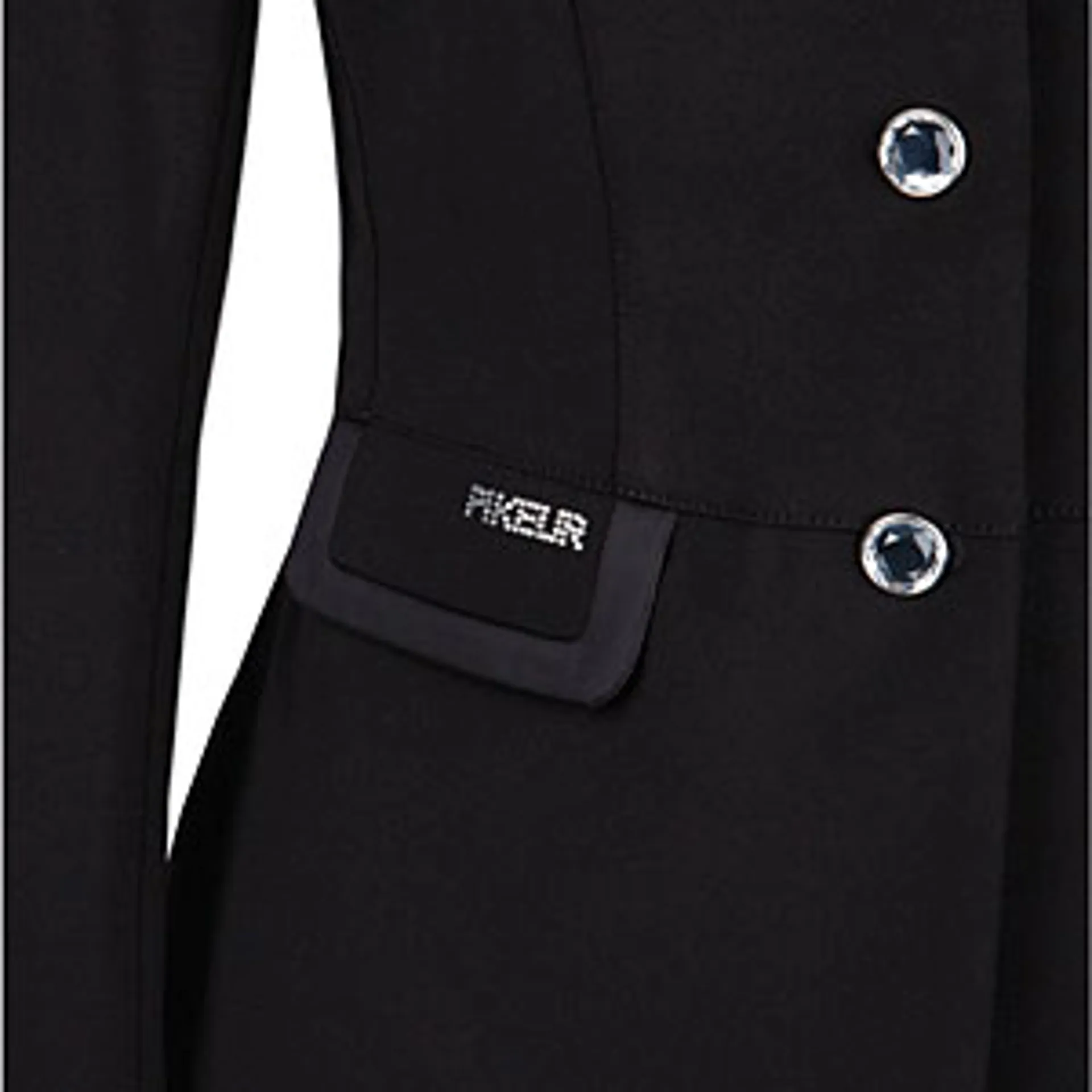 A four way stretch show jacket from Pikeur featuring silver rhinestone buttons to the front and cuffs, diamante Pikeur logo on front pocket flap and satin trim on collar and pockets. A truly luxurious show jacket.