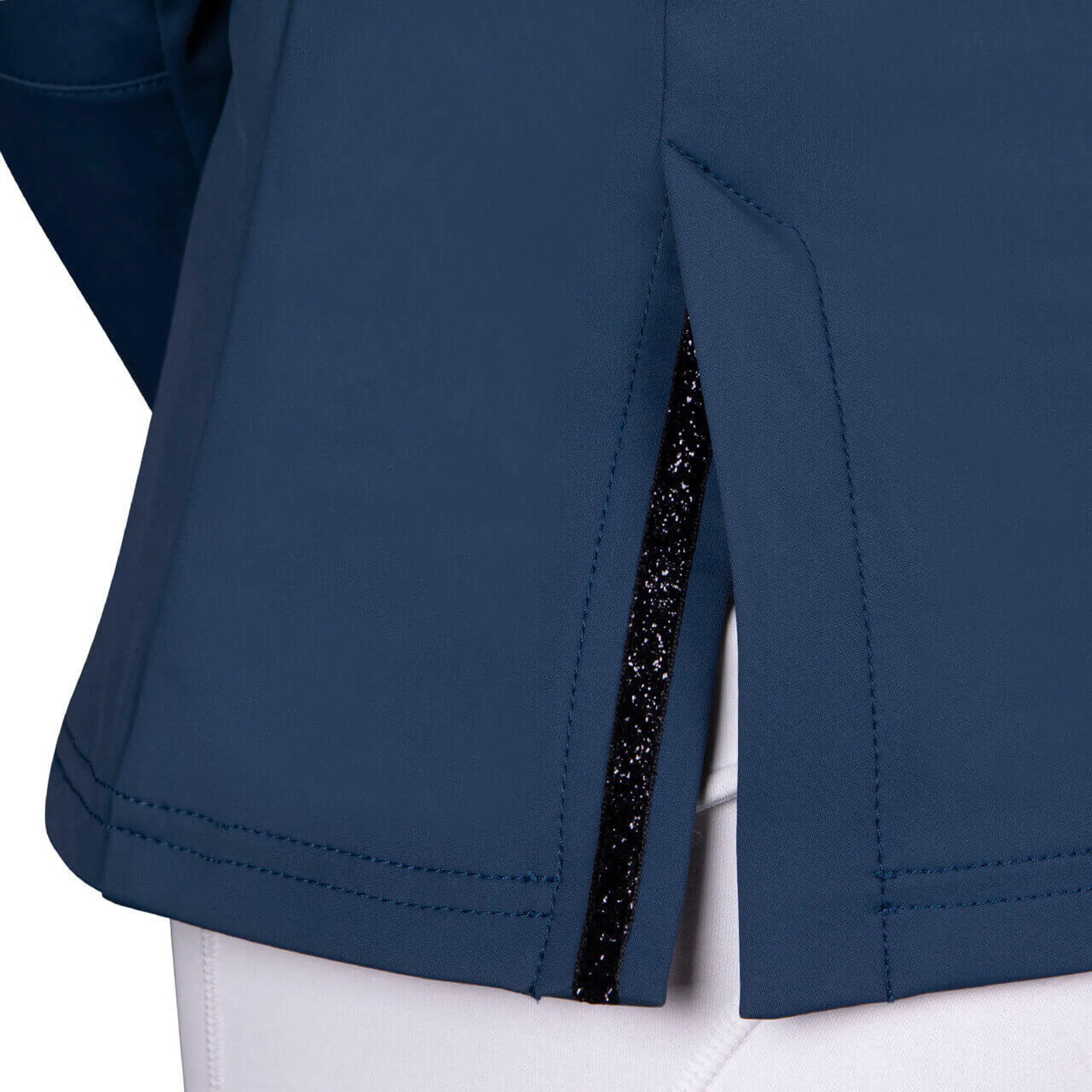 Shine during your competition with this chic competition jacket. The jacket has a concealed zipper behind the button closure so that the buttons won't pull. The stretchy, breathable fabric ensures a comfortable ride and is also water-repellent. The glitter tape on the zip pockets and black faux zip pocket complete the jacket.
