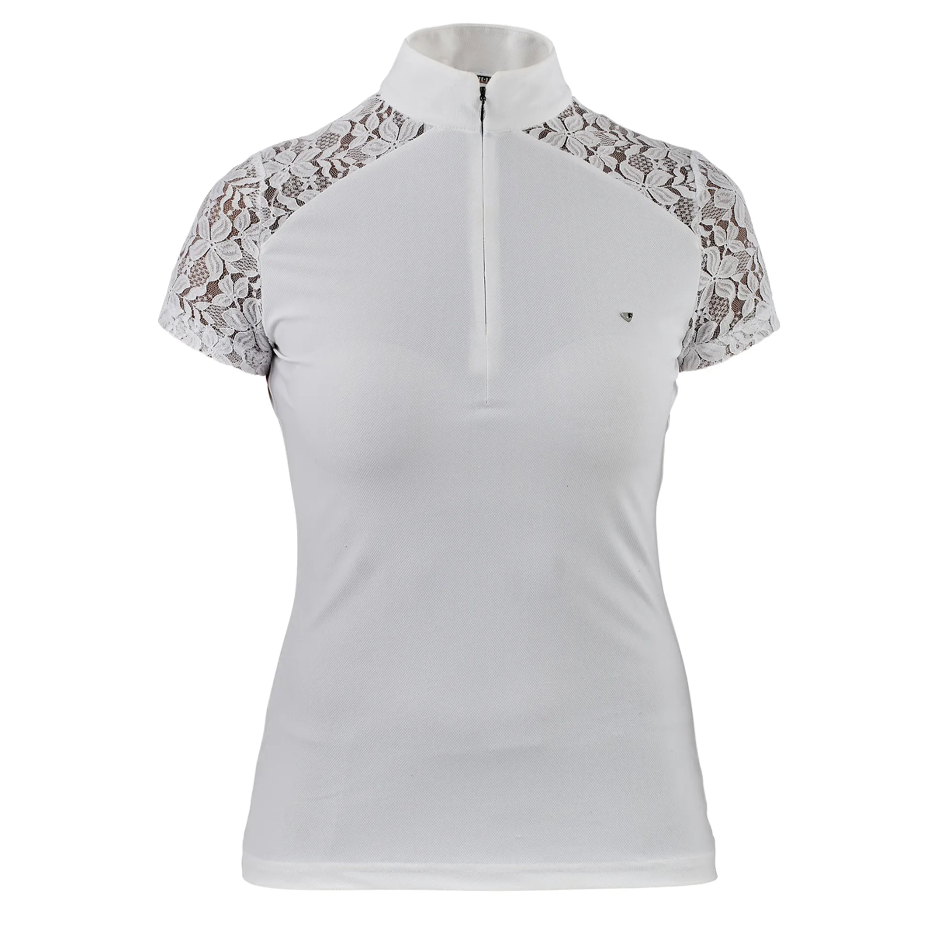 Designed for a professional look, the elegant Ambel show shirt offers excellent technical performance to keep the rider comfortable. The highly breathable pique cloth wicks moisture away and dries quickly to keep skin feeling fresh. Inset lace sleeves offer a light feel, ideal for warm weather riding. A gently contoured shape gives a neat fit, the highline neck features an inset 1/4 zip for additional ventilation. Further detail: main fabric UPF50+, discrete neck zip, 4-way stretch, moisture wicking, highly breathable, comfort seams, signature ribbon tab, Aubrion neck tape, badge and prints.