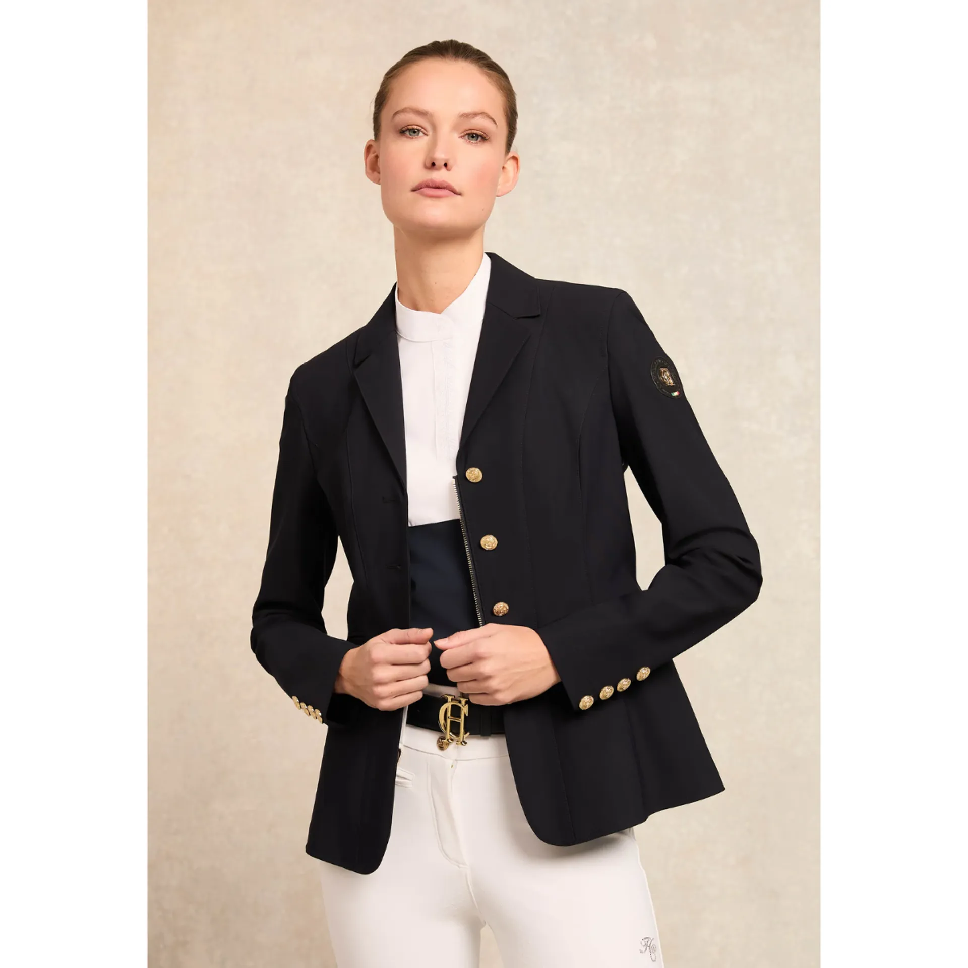 This sophisticated competition essential features a luxurious smooth-touch fabric body, complemented by our signature contrast woven bib, collar, and cuffs. Our distinctive high-build embroidery adorns the placket and cuffs, while concealed snaps ensure a polished appearance. The relaxed fit and technical fabric blend deliver superior comfort and movement in the saddle. A perfect fusion of performance and elegance.