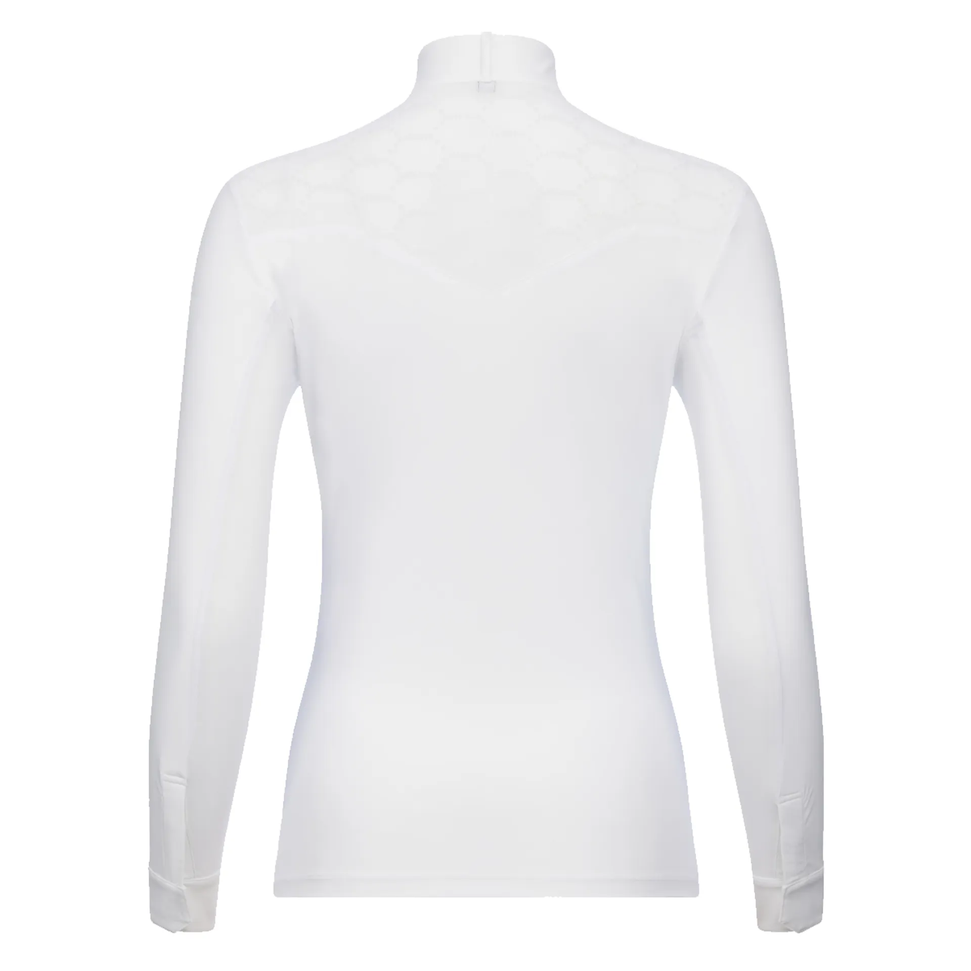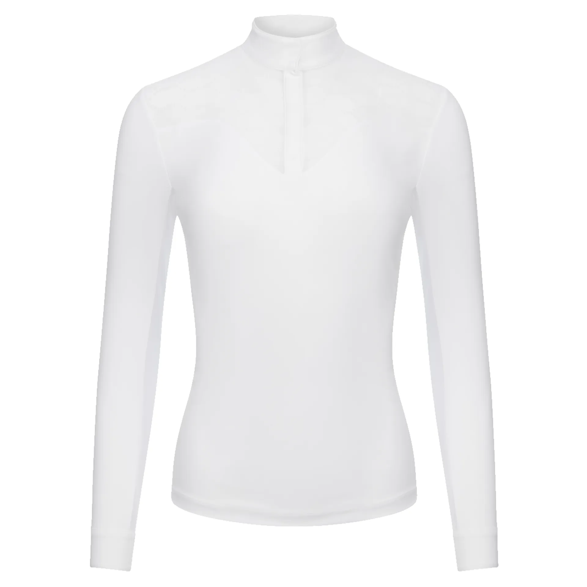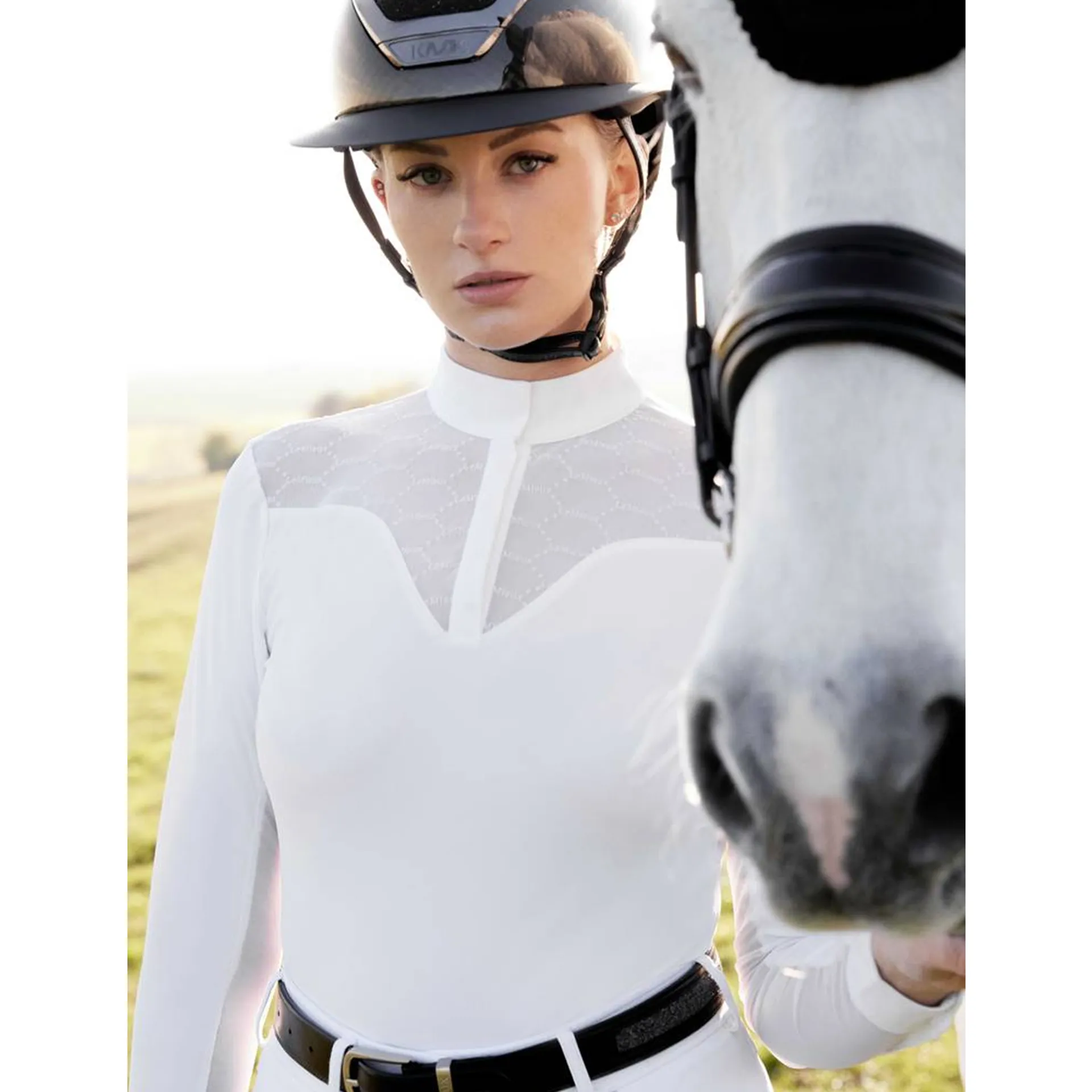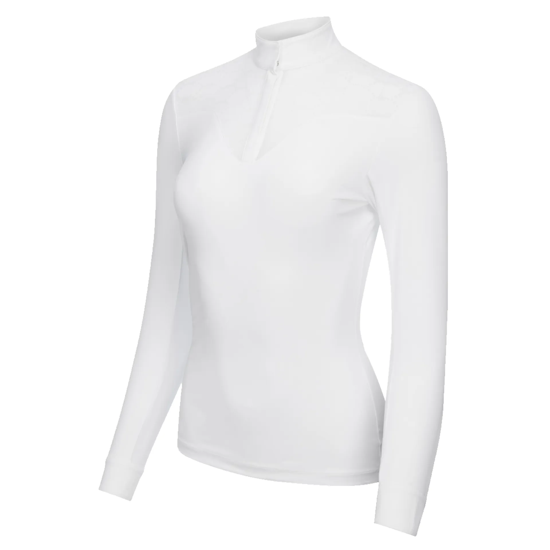 This competition shirt is ideal for performing at your best. It's an elegant long-sleeved under layer designed in performance fabrics.Cut with a flattering silhouette in lightweight breathable crepe fabric, it has soft mesh under the arm and sleeve to keep you cool and comfortable.Feminine LeMieux-pattern flocked mesh covers the chest and back panel for ventilation when the heat is on.The standing collar has subtle LeMieux branding and a magnet placket popper closure.