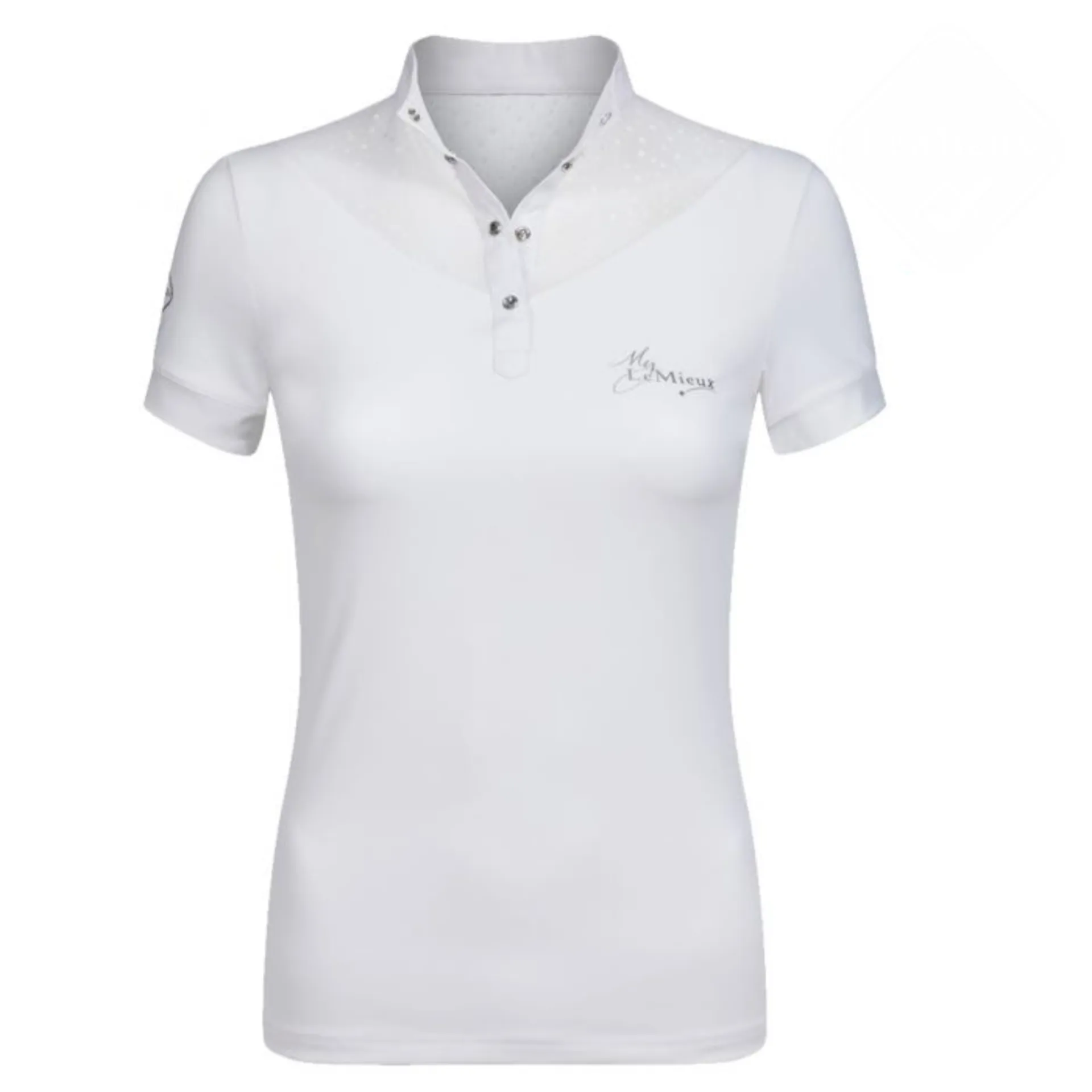 The Amelie competition shirt offers performance and style with a touch of class. Made from luxurious super soft, high stretch fabric that moves as you move, this high-performance base material effectively regulates heat and moisture. Beautiful Italian lace effect panels on the back and front, subtle diamante press stud closures and tailored fit give this shirt an elegant touch. The Amelie Show Shirt is finished with a contrasting white show collar with stock loop.