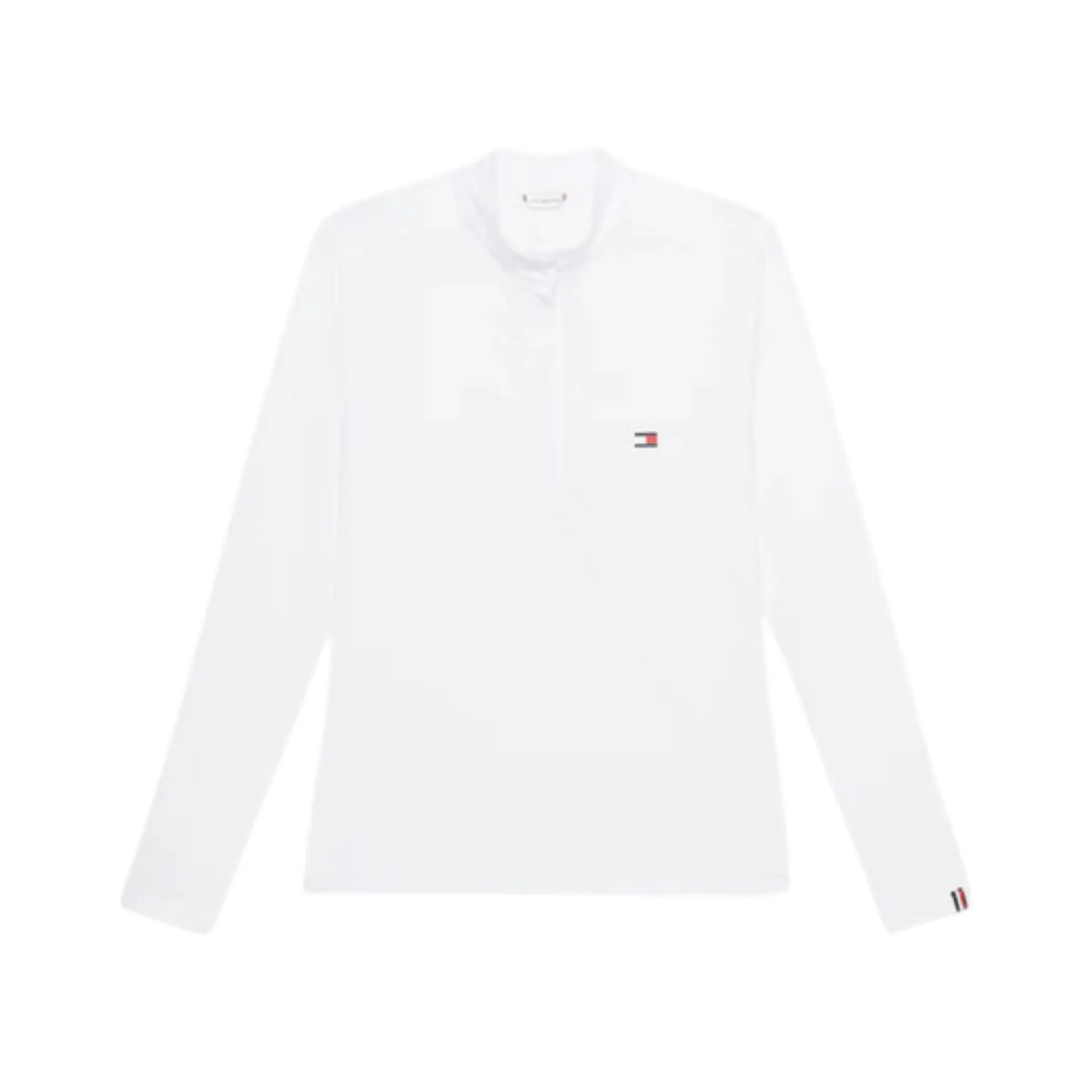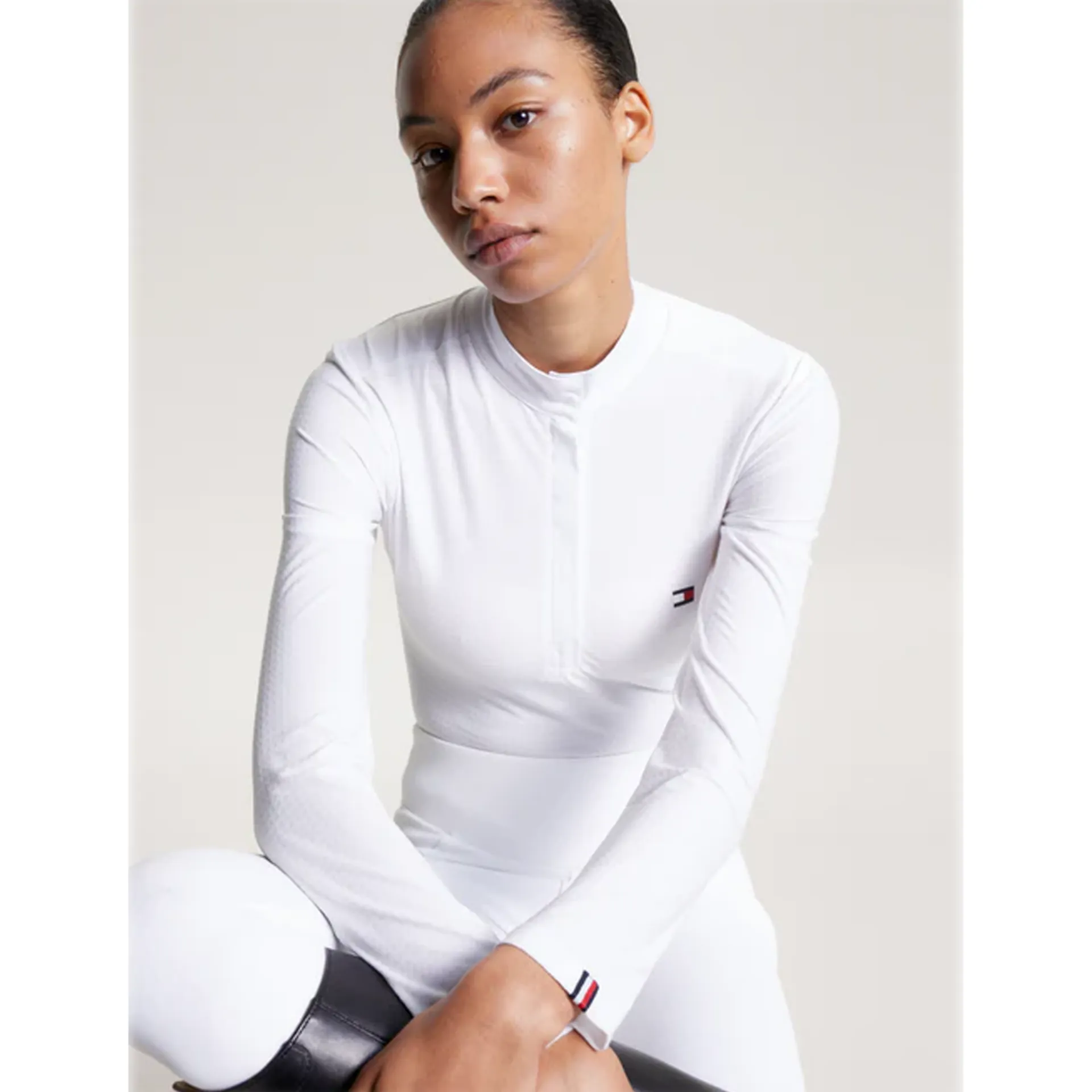 Make a sophisticated statement in the Chelsea Show Shirt. Designed in a 4-way subtly textured stretch fabric that keeps you cool and dry when it matters most and a smart stand-up collar with snap closure. Featuring a hidden zip under the front placket for an easy 'on and off' duty look and feminine keyhole opening at the back of the neck. Iconic flag logo at the chest, global stripe tape at the sleeve hem and contrast fabric on the shoulders and sleeve hems complete the look.