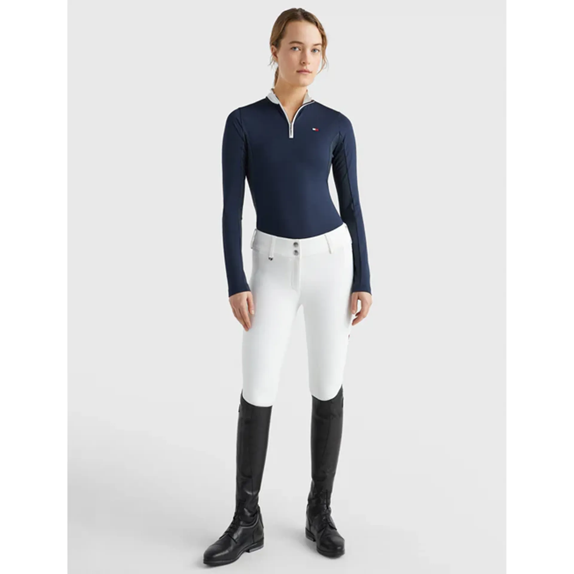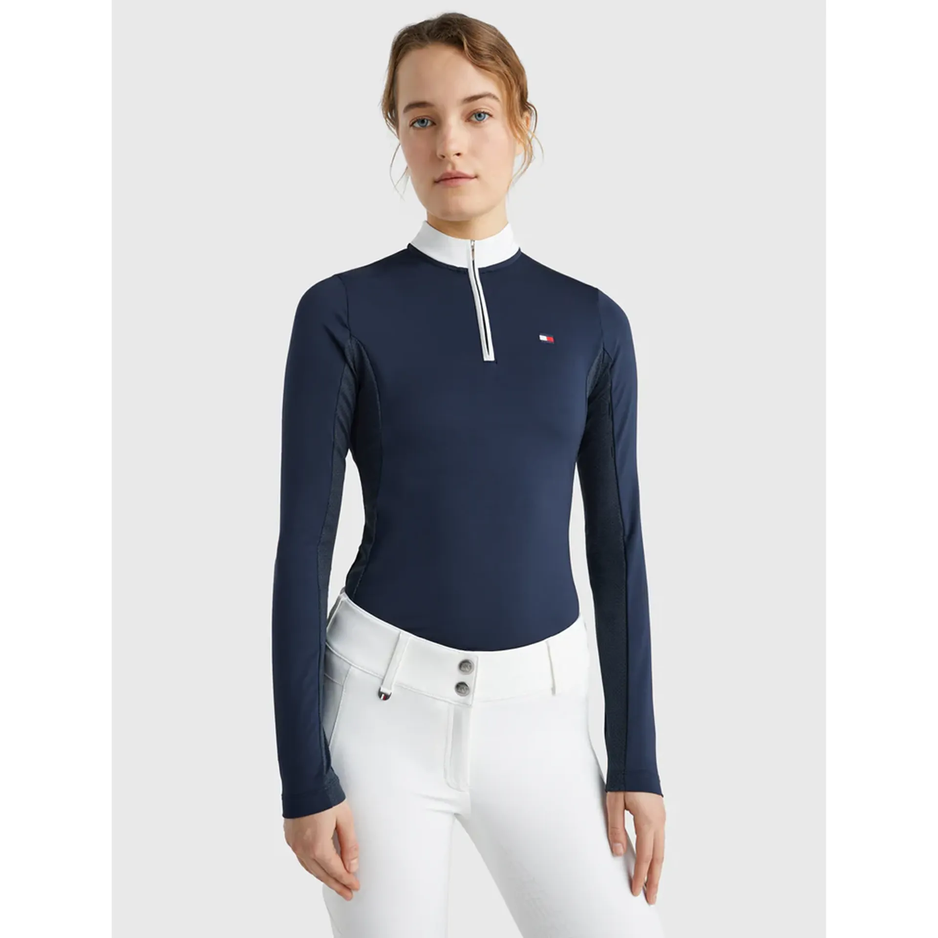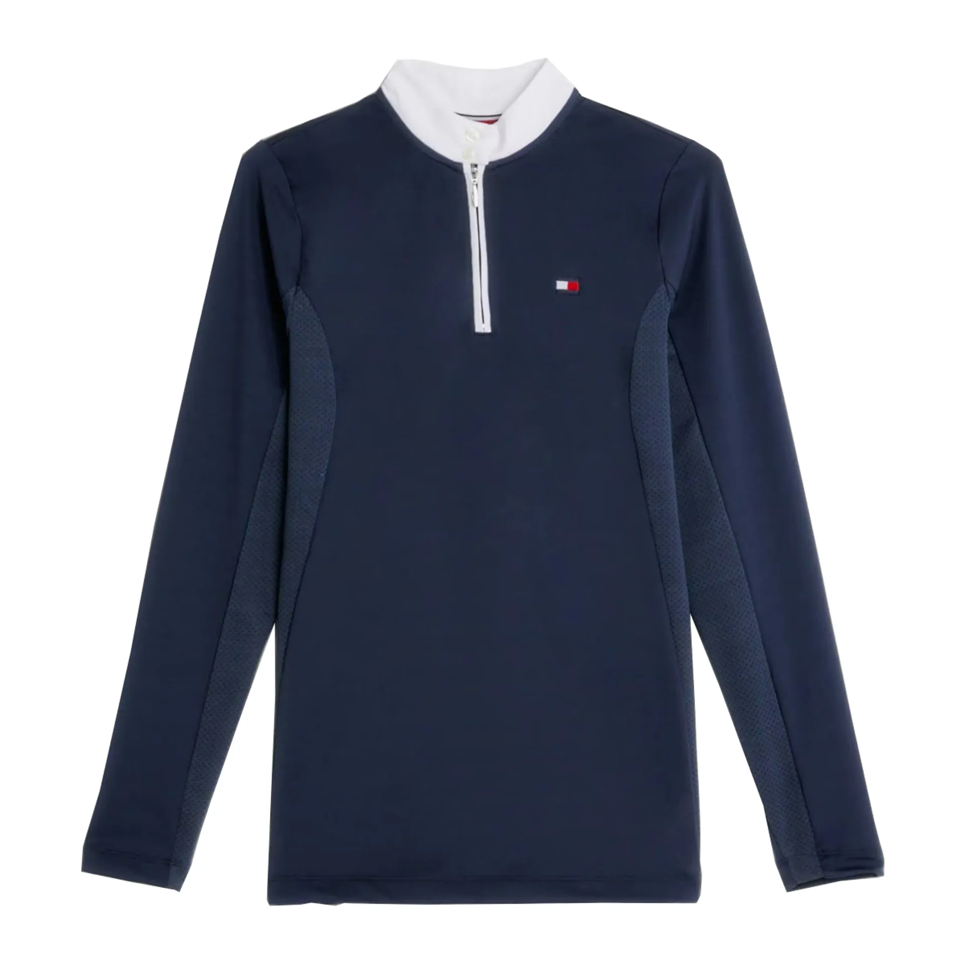 Fresh Air long-sleeved competition shirt with zip and stand-up collar with 2 buttons. Features perforated inserts on the sides and under the arms for more efficient air circulation. Made from a fast-drying, deodorizing fabric. Logo is FEI compliant