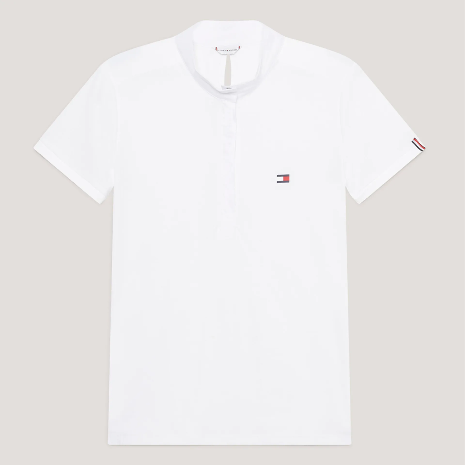 Make a sophisticated statement in the Chelsea Show Shirt. Designed in a 4-way subtly textured stretch fabric that keeps you cool and dry when it matters most and a smart stand-up collar with snap closure. Featuring a hidden zip under the front placket for an easy 'on and off' duty look and feminine keyhole opening at the back of the neck. Iconic flag logo at the chest, global stripe tape at the sleeve hem and contrast fabric on the shoulders and sleeve hems complete the look.