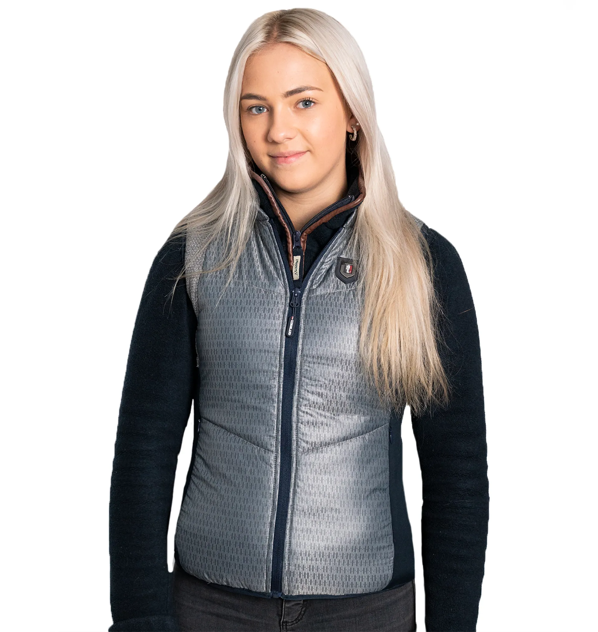The Kingsland Vidalia Ladies Padded Body Warmer with standing collar in shiny Jacquard fabric. Elastic fabric in side panels and mesh on shoulders. Breathable and water repellent. Quality zipper. Two pockets in front. Metal patch on left chest.