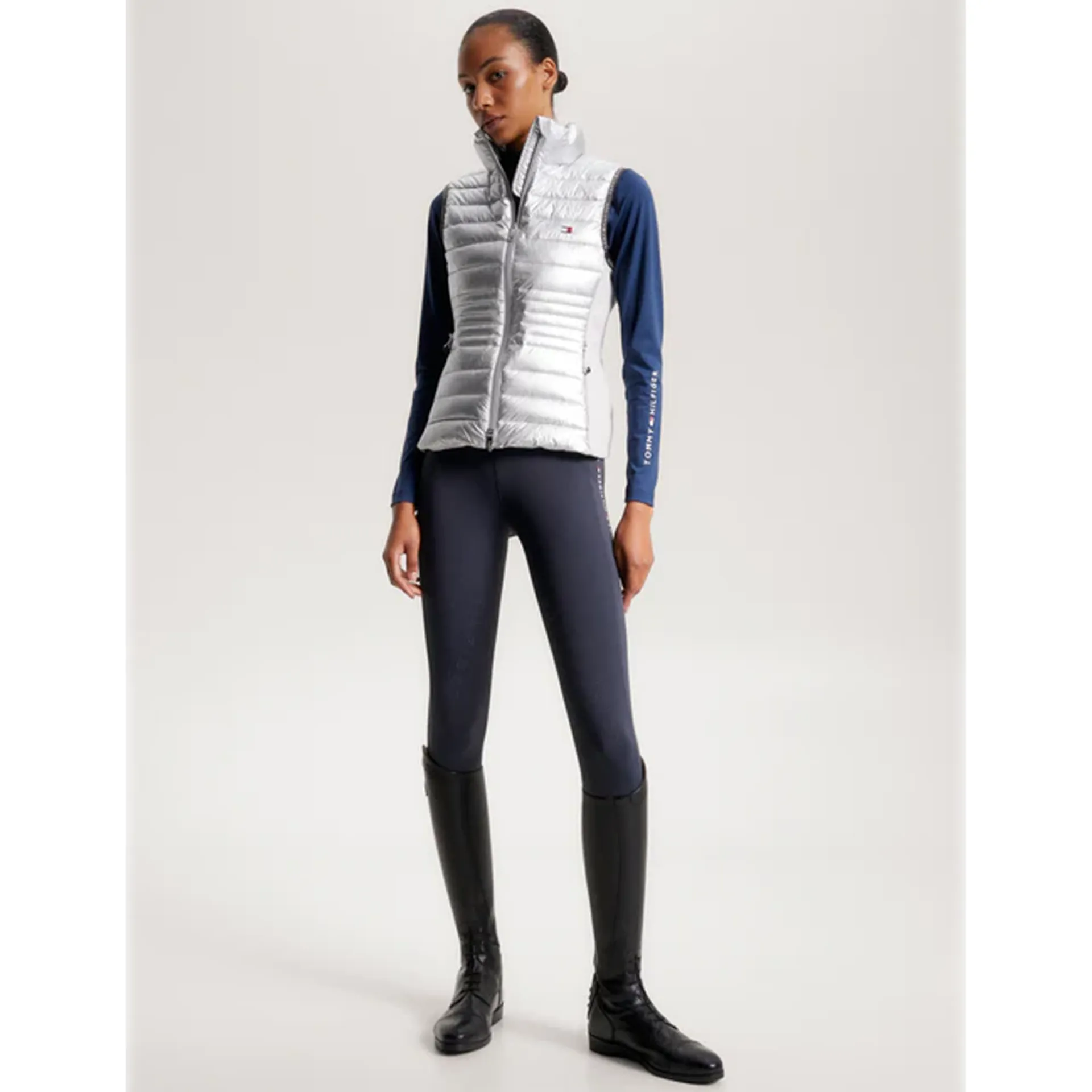 Versatile, sporty, and functional, our latest padded vest features a stretch panel on the sides of the body for extra freedom of movement and comfort in the saddle with added windproof properties. Signature Tommy Hilfiger logo binding trim at the arms and sporty reflective logo print at front chest add extra visibility and shine whilst the zipper is also made in a reflective finish to complete the look. 100% recycled padding inside for the more sustainably conscious equestrian.