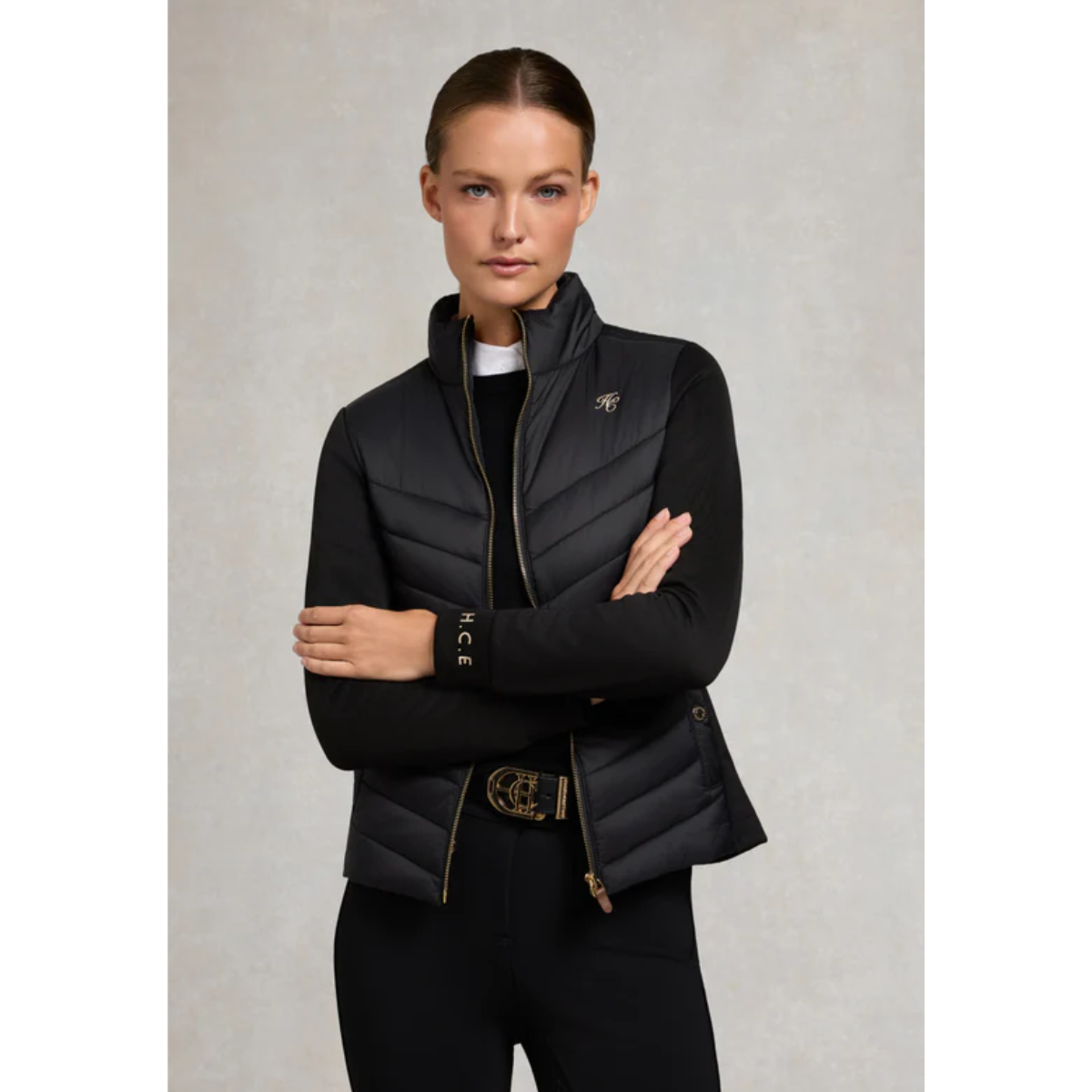 This exquisitely crafted equestrian piece combines luxury with functionality, featuring premium synthetic down fill across the upper chest and back for exceptional warmth.