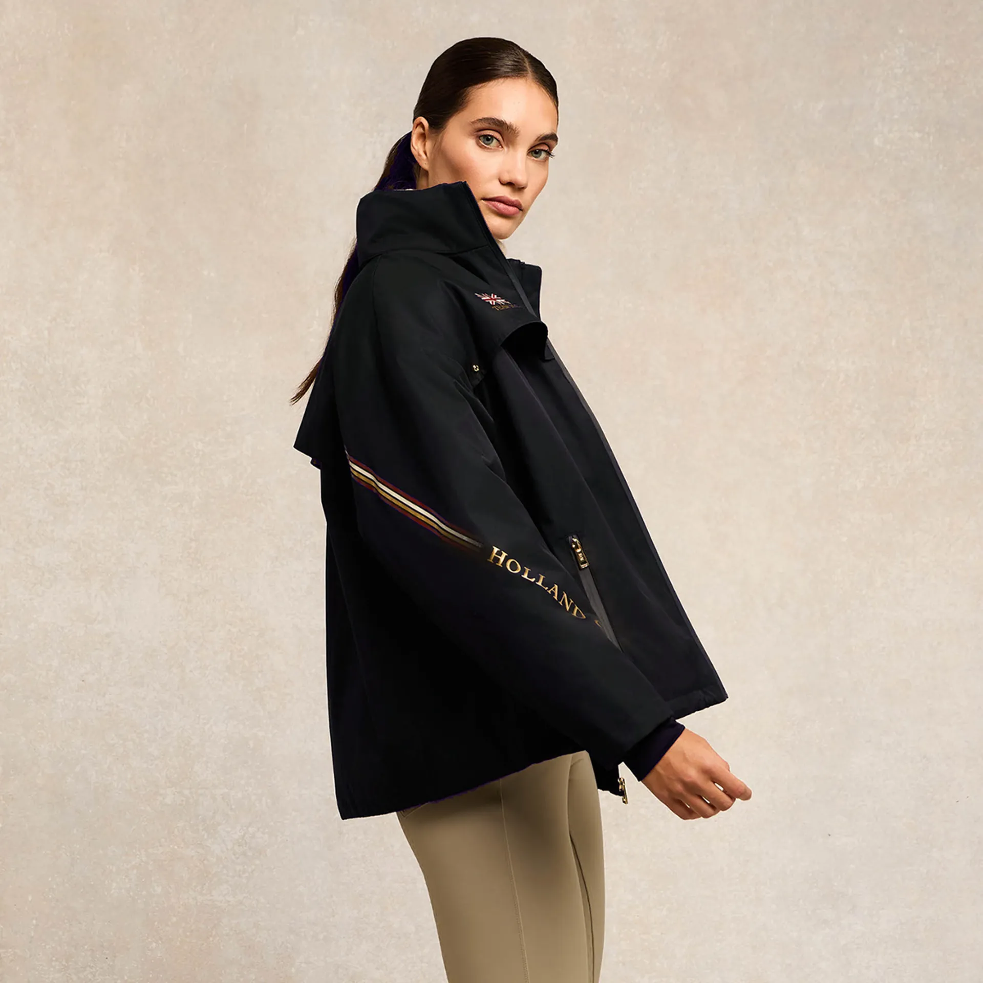 Updated for the season with our exclusive Team Graphics package, this technical jacket effortlessly blends functionality with refined style. Designed with a relaxed fit and drop shoulder silhouette, it showcases high-density embroideries and prints that complement the signature gold metal hardware. Crafted from waterproof fabric, it’s built to handle the elements, featuring a stowaway hood and storm cuffs for added practicality. Branded tape side seams, breathable mesh inserts, and thoughtful detailing elevate this piece into a wardrobe essential for equestrian pursuits and beyond.