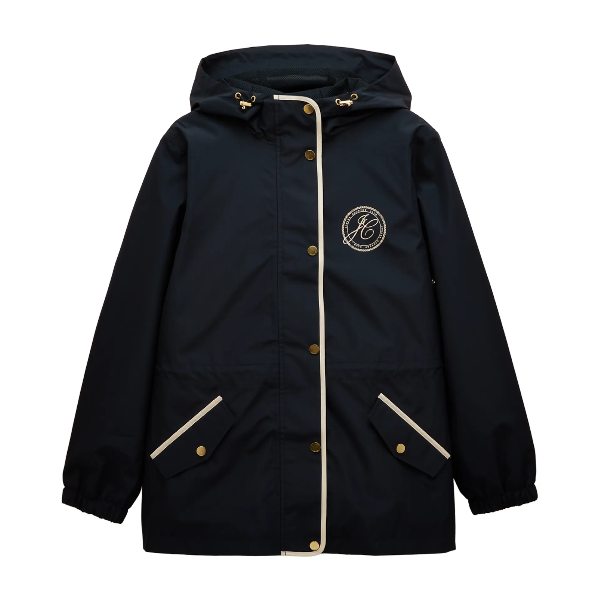 inished with elasticated cuffs and a Joules branded screen print to the chest. Waterproof with taped seams. Packs away into the storm flap at the back. Zip fastening. Hood with adjustable toggles. Adjustable waist with internal toggles. Elasticated cuffs. Two flap pockets with popper fastenings. Joules branded screen print to the chest.