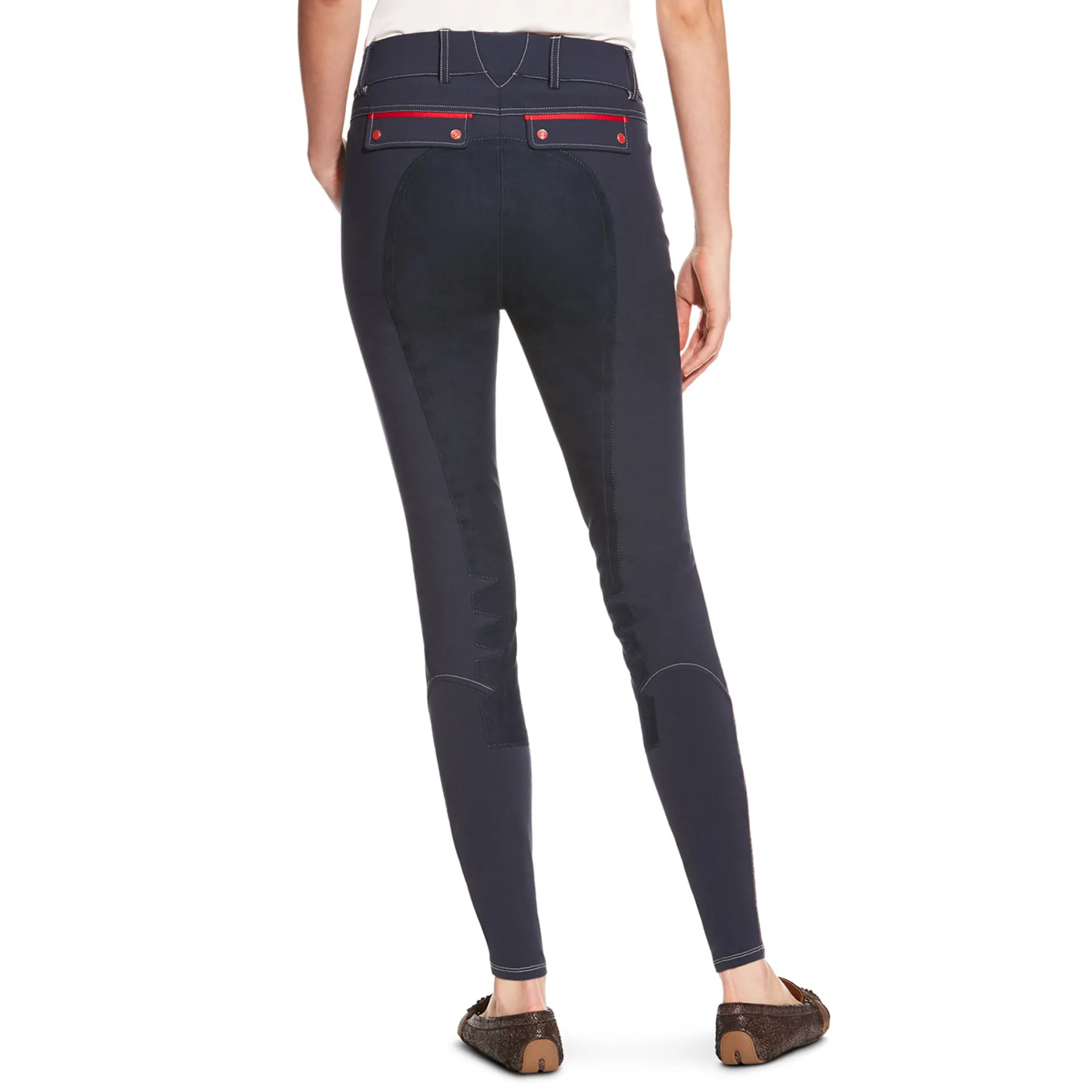 Designed with all riders in mind, the Ariat Olympia Acclaim Full Seat breeches incorporate the patented V3® technology which uses an elastic ‘V’ panel in the back of the waistband offering multi-directional stretch to accommodate riders’ varying hip angles and ensure total freedom of movement when riding. Made from Schller®, a prestige four-way stretch nylon and cotton twill fabric, for maximum comfort and flexibility in the saddle, the Ariat Olympia Acclaim Full Seat breeches feature a stretch Clarino™ full seat and contrast colour detailing at front and back pockets. To ensure the perfect fit - no matter what leg shape - the exclusive Calf Fit System™ is also utilised in the Ariat Olympia Acclaim Knee Patch breeches to provide the wearer with a smooth, comfortable and adaptable fit without the risk of rubbing seams or irritation from bulky closures. This snug fit ensures a smooth line under long boots and chaps and accommodates any leg shape. These breeches include the FEI™ logo, positioned within the pocket.