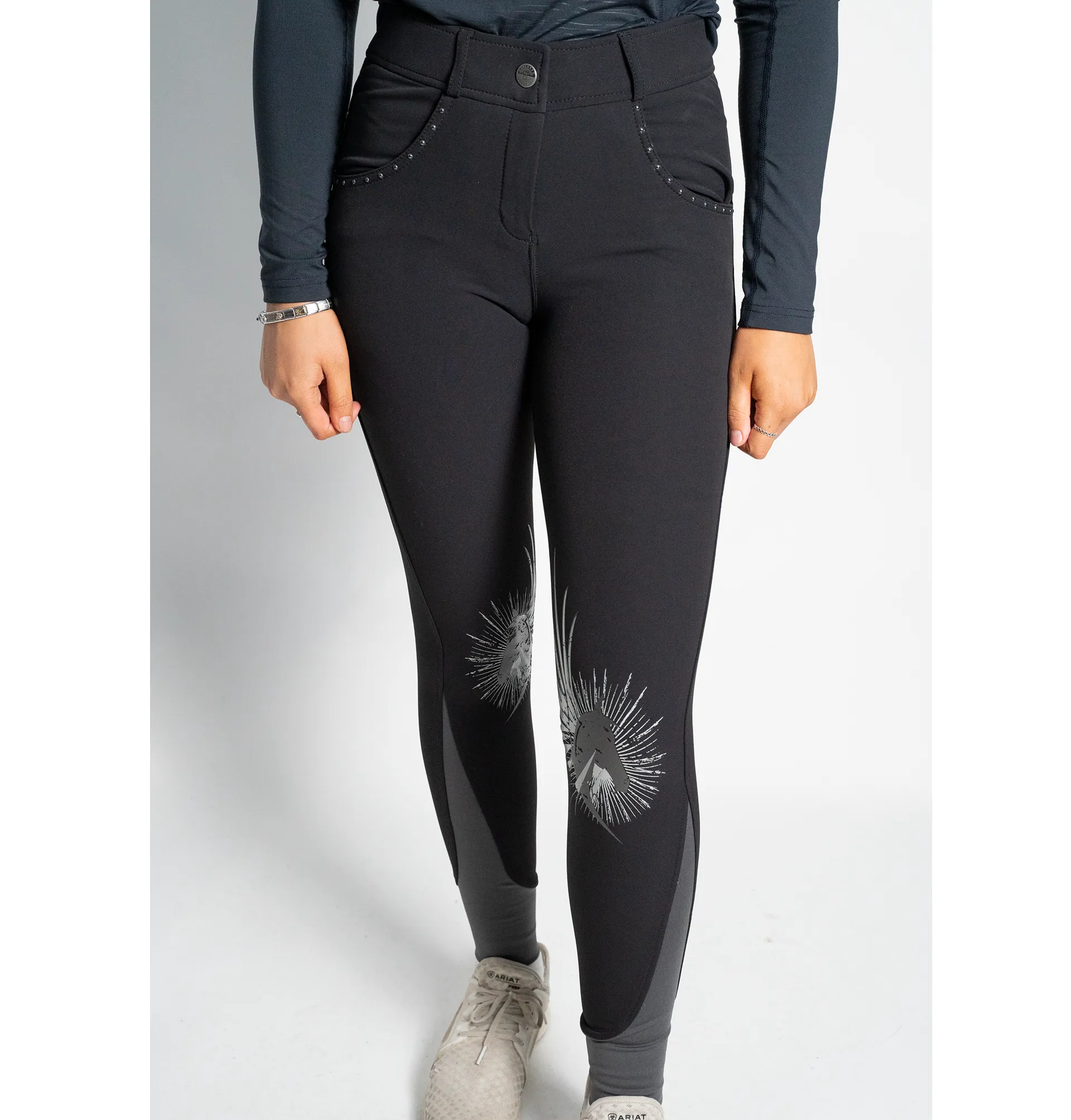 The Esperado Show Star Ladies Grip Breeches are made from a technical fabric which allows complete freedom of movement for the rider. It features an attractive horse print silicone design on the knee which provides grip as well as looking great! There is pretty crystal detailing around the front pockets and further Show Star branding on the rear pocket as well as across the rear of the waistband for those who do not want to wear a belt but wish to have a bit of detail! The bottom of the legs feature elasticated cuffs for superior rider comfort.