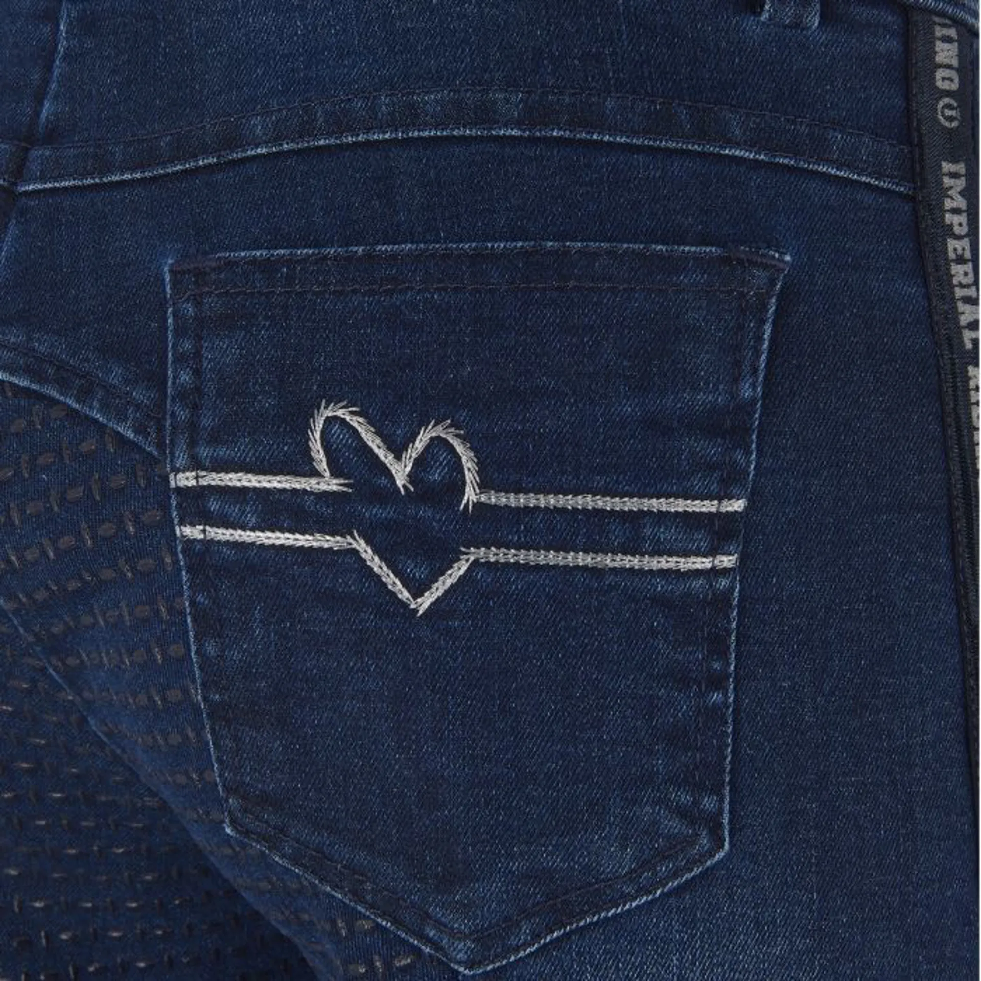 5-pocket denim breeches. The sideseam is taped with silver text, also the backpockets have cute silver embroidery detail
