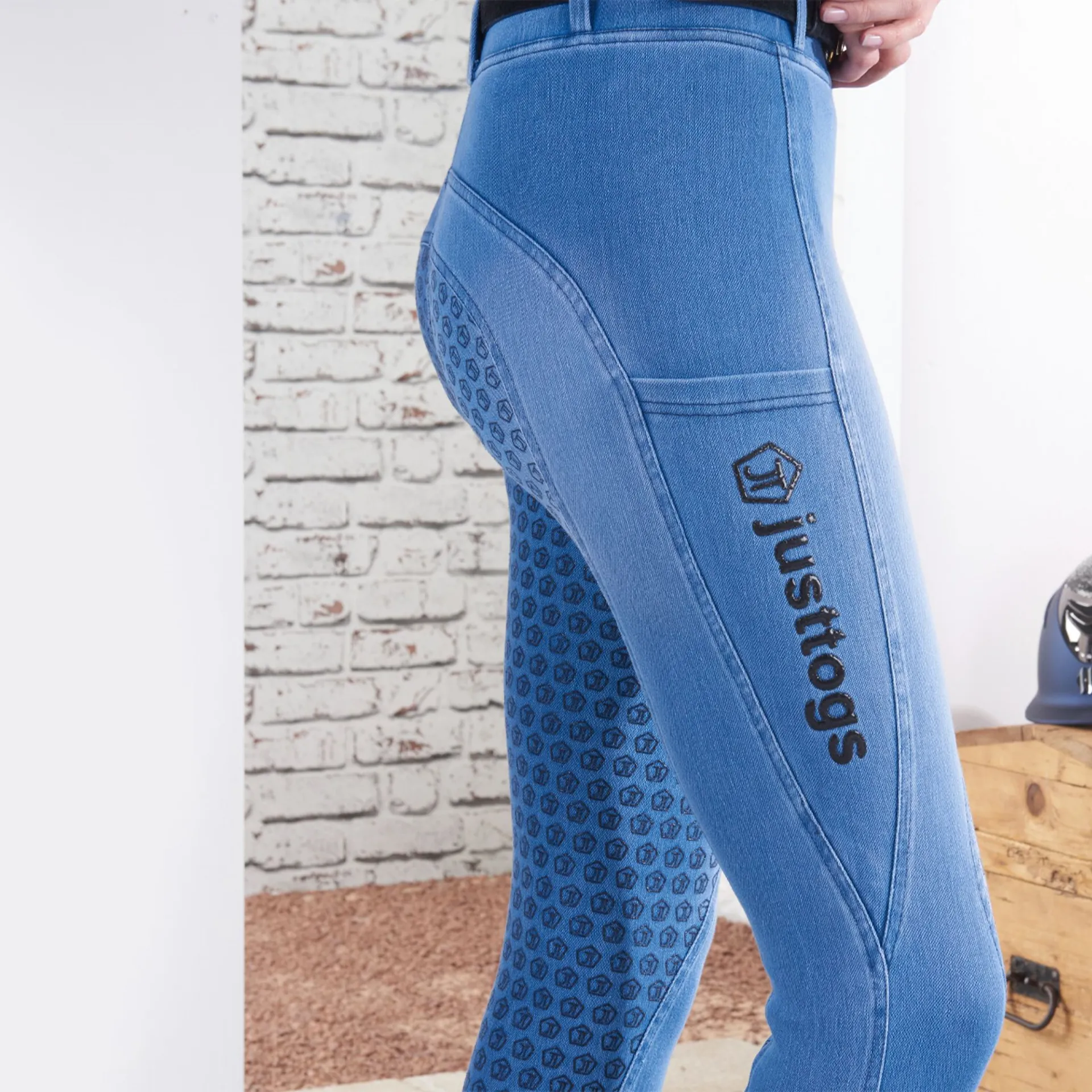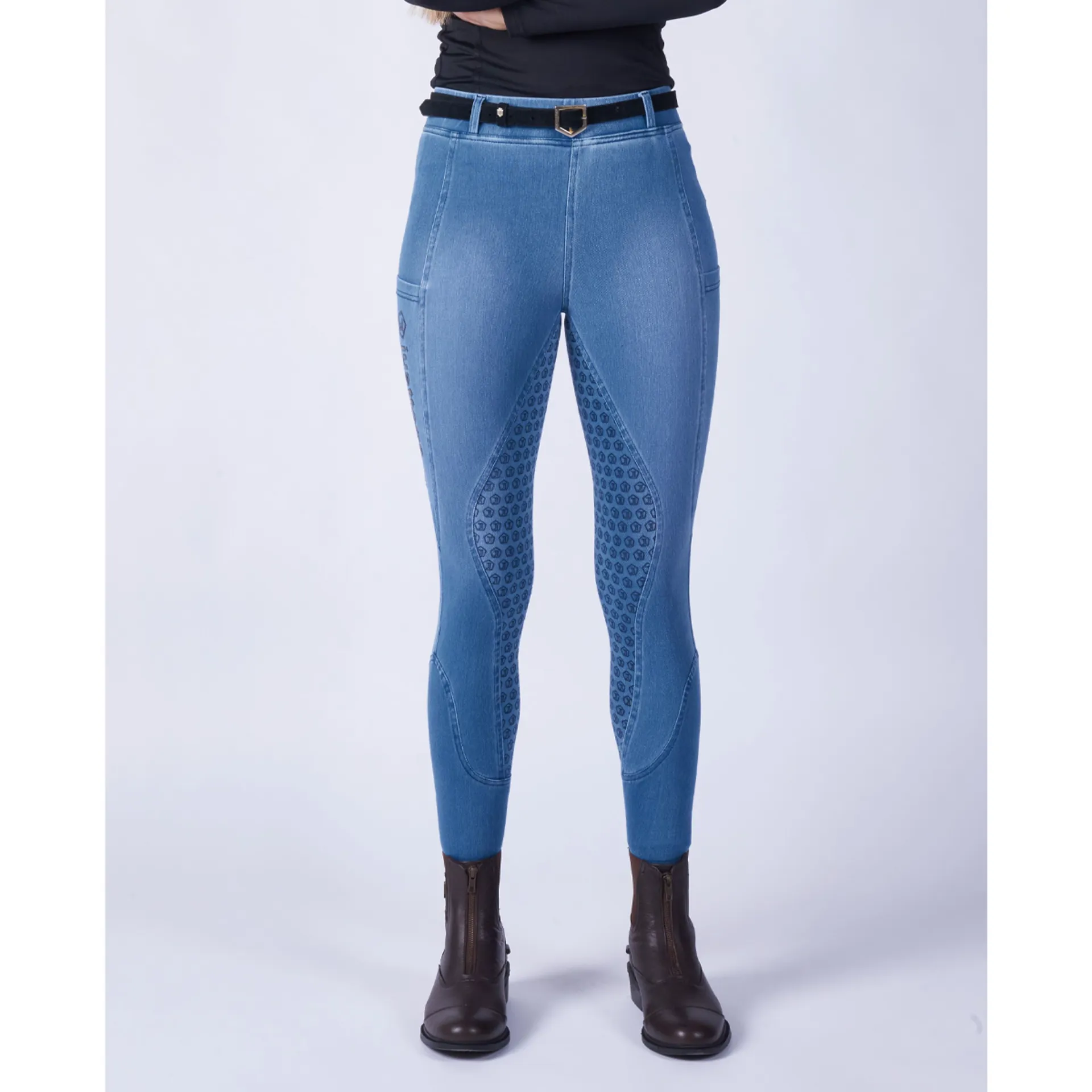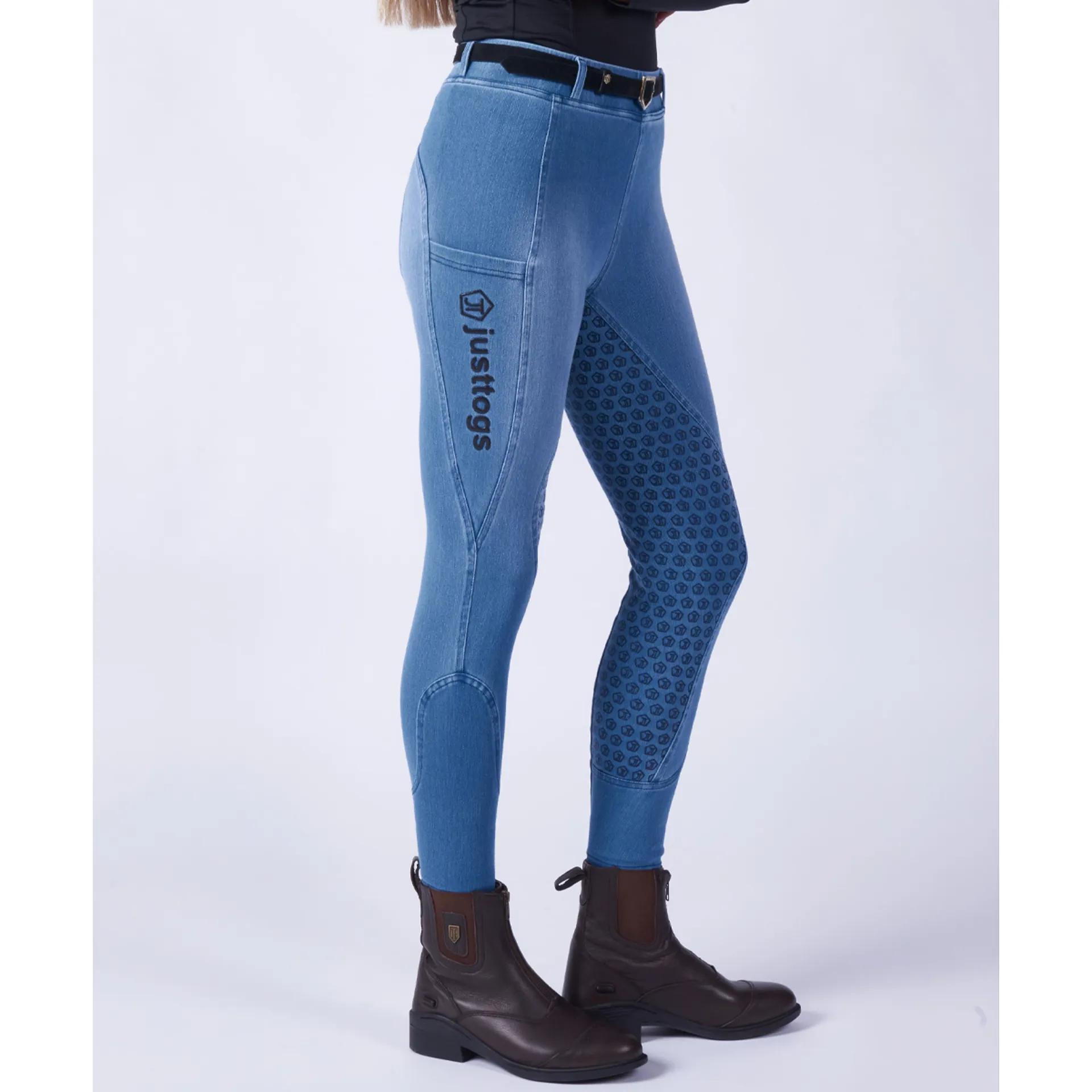 These tights give you all the practicality of a riding tight with a chic high street style.Extremely comfortable and super stretchy for those equestrian tasks whilst looking on-trend High elasticated waist with belt loops for extra support. With a pocket on each leg and a full silicon seat finished in a beautiful stonewashed denim.