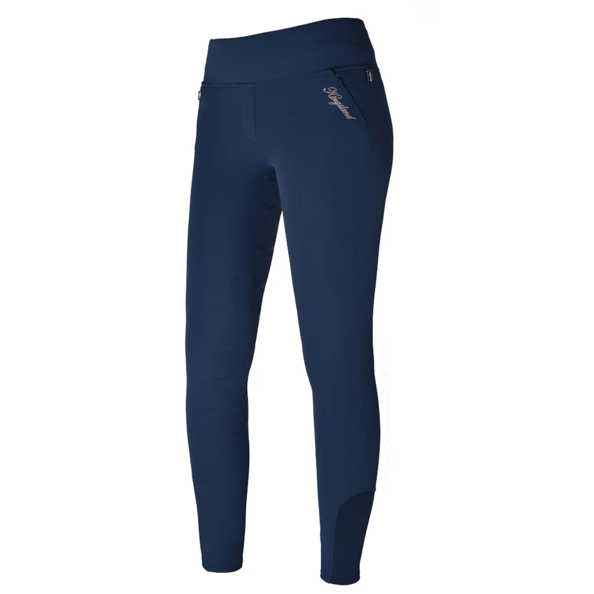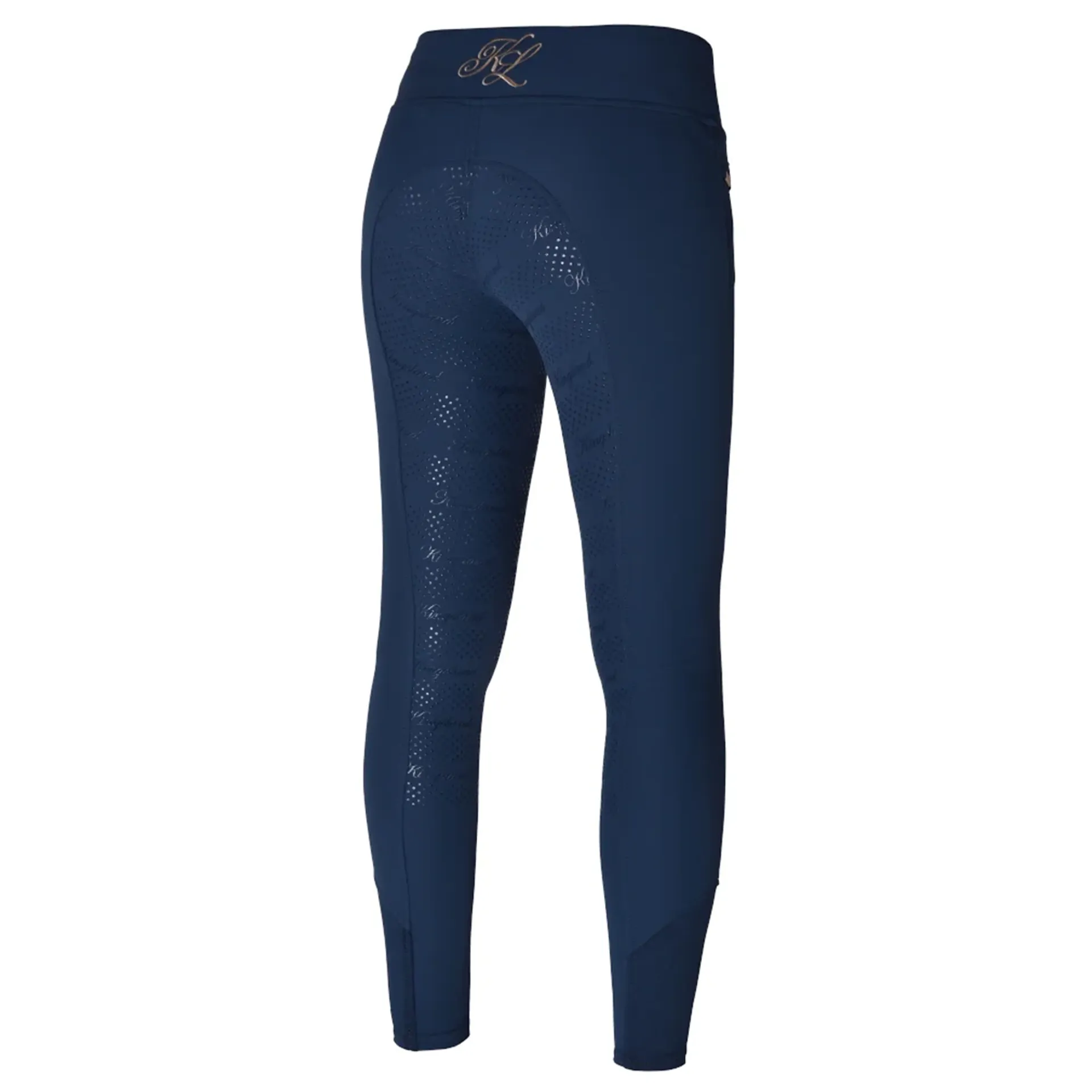 Mid waist rise breeches with high waistband in soft technical fabric with powerful 4-ways stretch. Water repellent, breathable, dust and grease repellent. Full grip with KL dot pattern. KL print on side panels. High Lycra socks on bottom calf’s. Kingsland embroidery in center back. KL embroidery in front. Corporate metal hook in side.