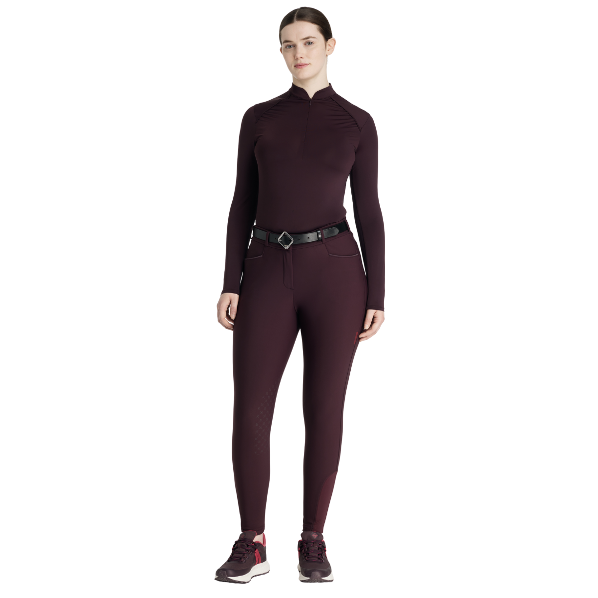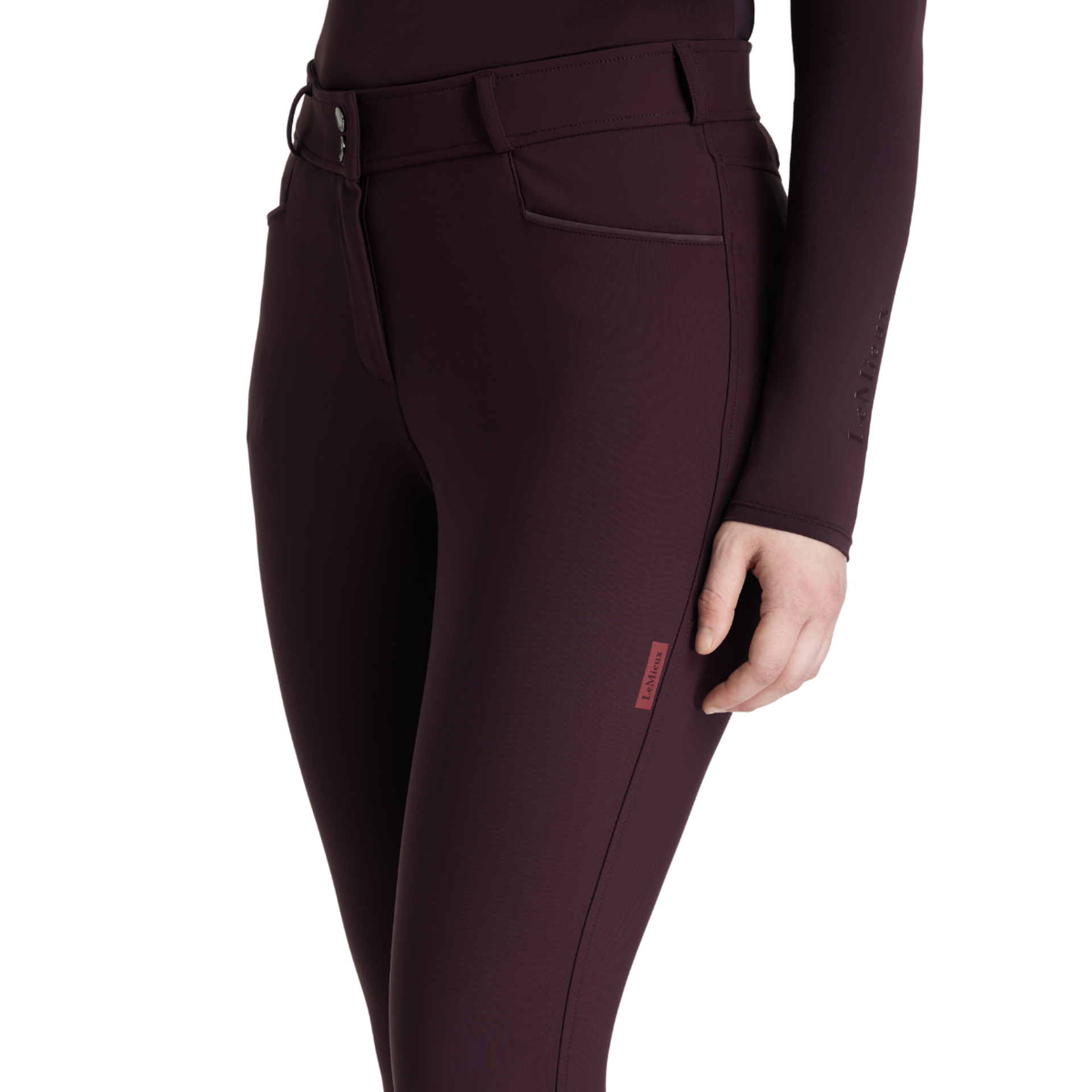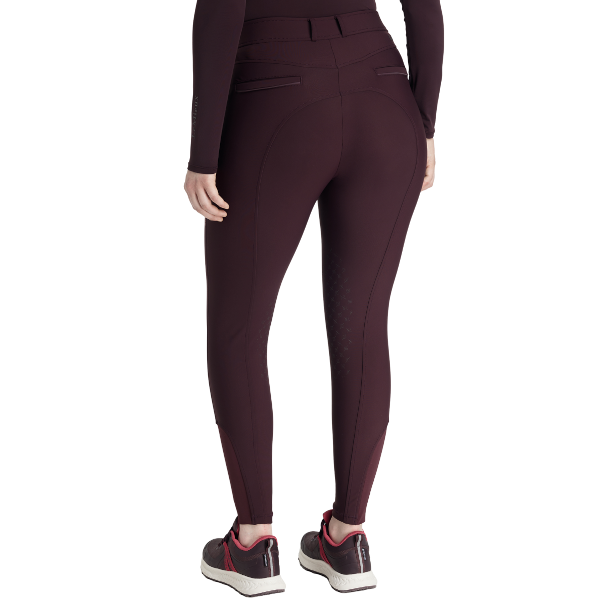 Smart square front pockets with tonal reflective details, a seamless-feel design, and a soft and flexible four-way adaptive stretch keep you moving in comfort. Belt loops, faux back pockets, and a fly front are classic breech styling details. Offered in full seat and knee grip styles, they deliver stability and security in the saddle, according to your preference.