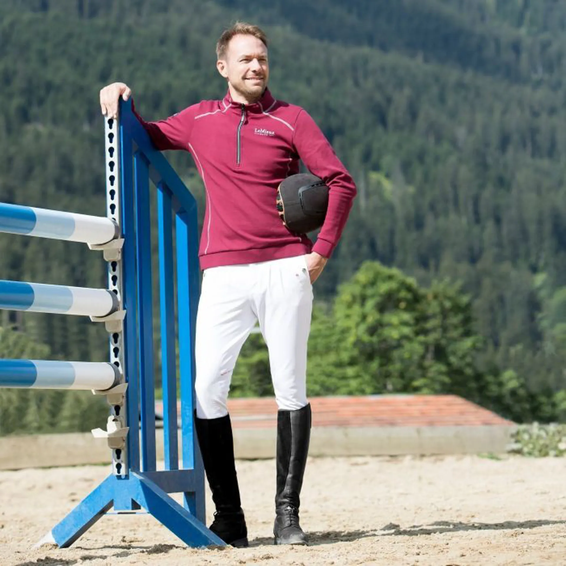 A range of mens breeches with a stylish cut and design. Generous upper pleats and silicone grip ensures comfort and stability. A breech equally at home in the ring or for every day riding.