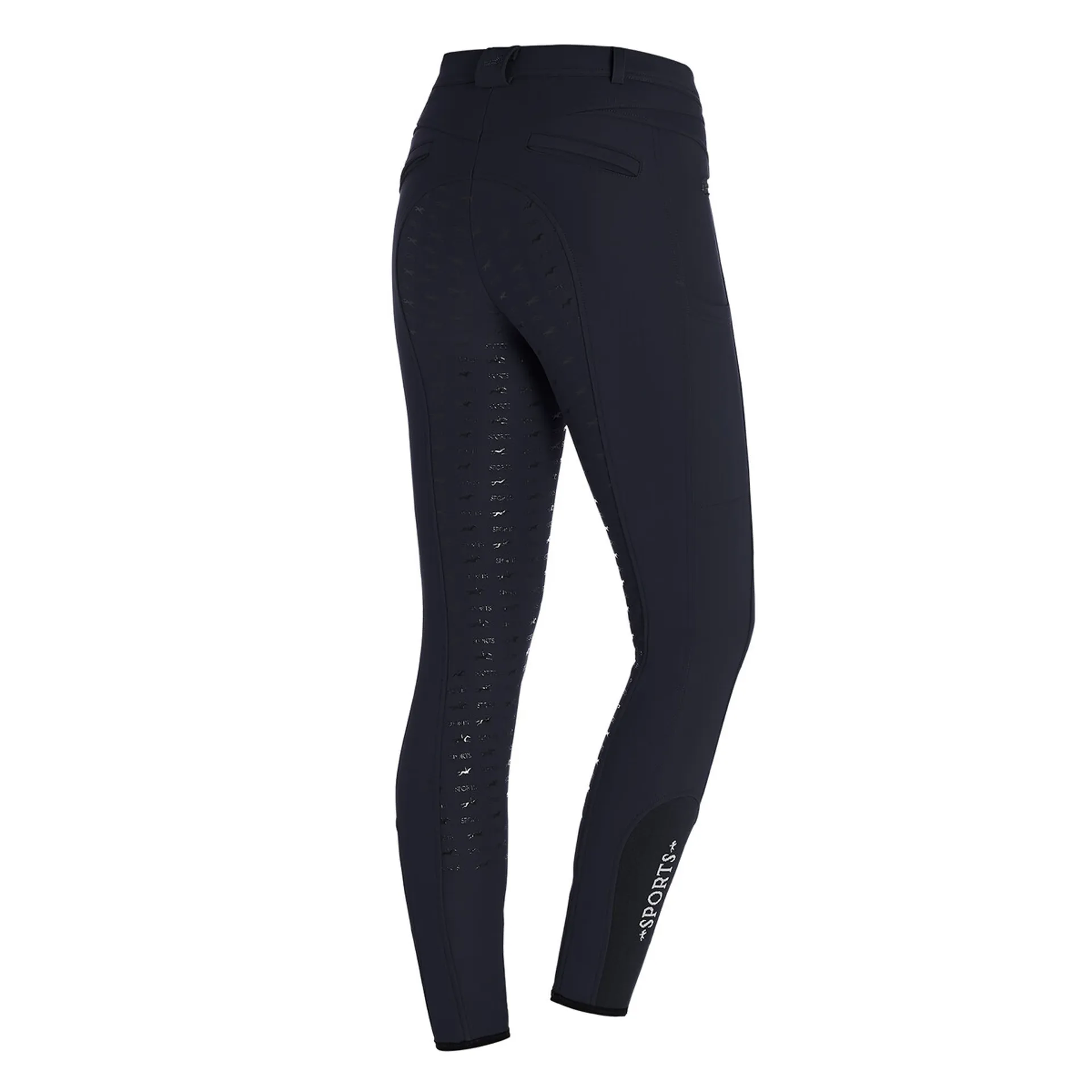 Cold days can come – because with the premium winter breeches Julina FS Sytle by Schockemöhle Sports low temperatures won´t harm you anymore. The warm design made from stretch material provides a lot of freedom of movement, nevertheless, it retains its shape and is figure flattering. The necessary grip in the saddle is provided by a non-slip full seat silicone print. A mobile phone pocket at the side and elastic leg gathers are ranked among the functional details. The logo rhinestone motif plus two welt pockets at the back make the pants also visually convincing.