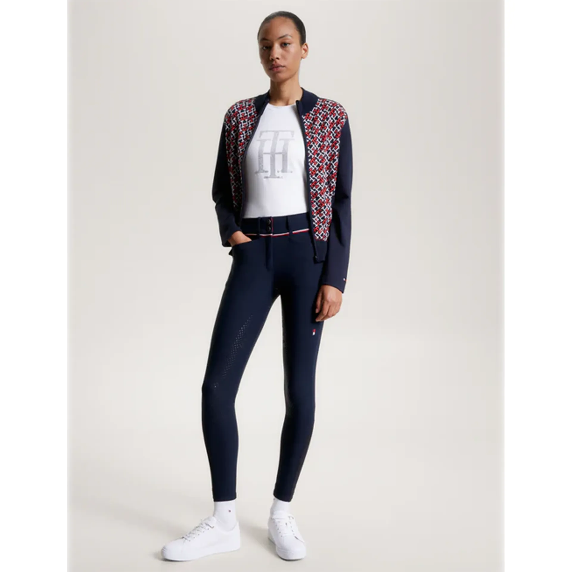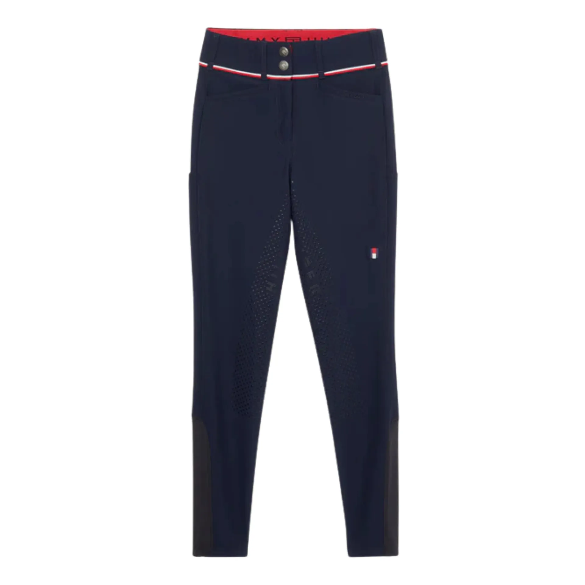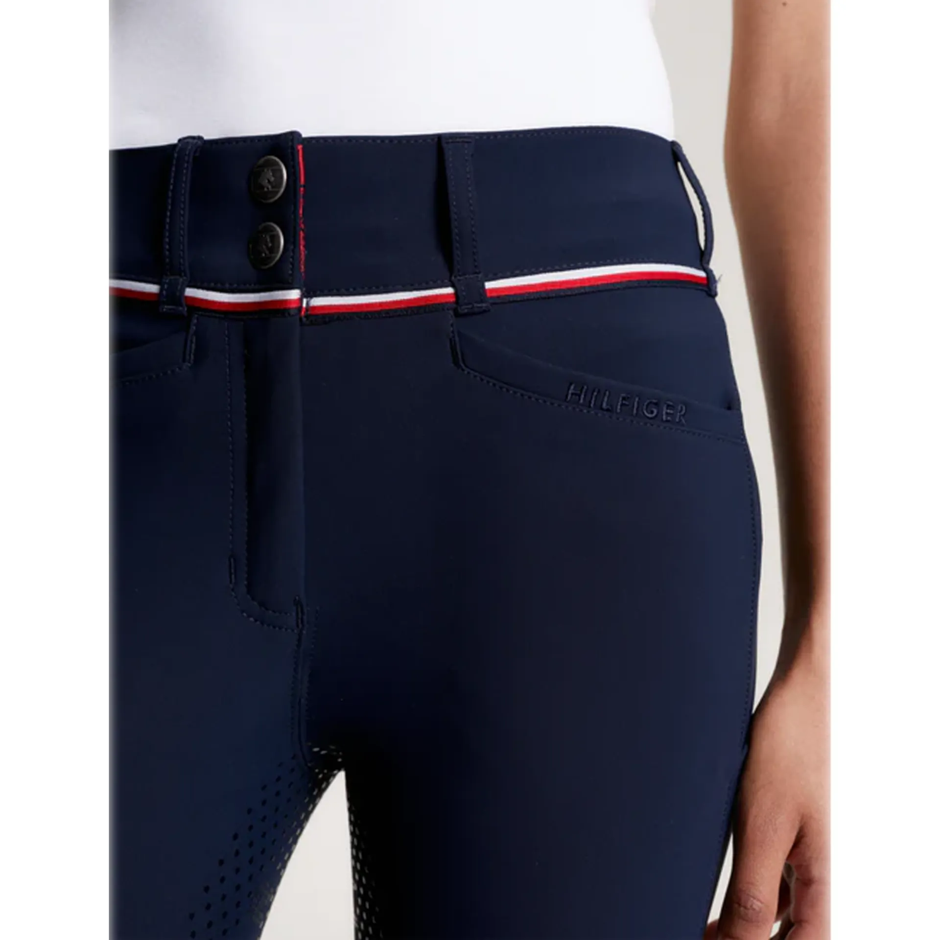 The Geneva Breeches are designed in a technical power stretch water repellant performance fabric with a higher and wider waistband for maximum riding comfort. Soft jersey hem for a sporty shape and a thinner layer under your boots. Features an embroidered logo on the left thigh, Global Stripe tape at waistband, 'Hilfiger' embroidery on front pocket, and full silicone seat for a secure grip in the saddle. Fantastic performance fabric with multiple functions including quick drying, wicking properties, UV protection and 4-way power stretch.