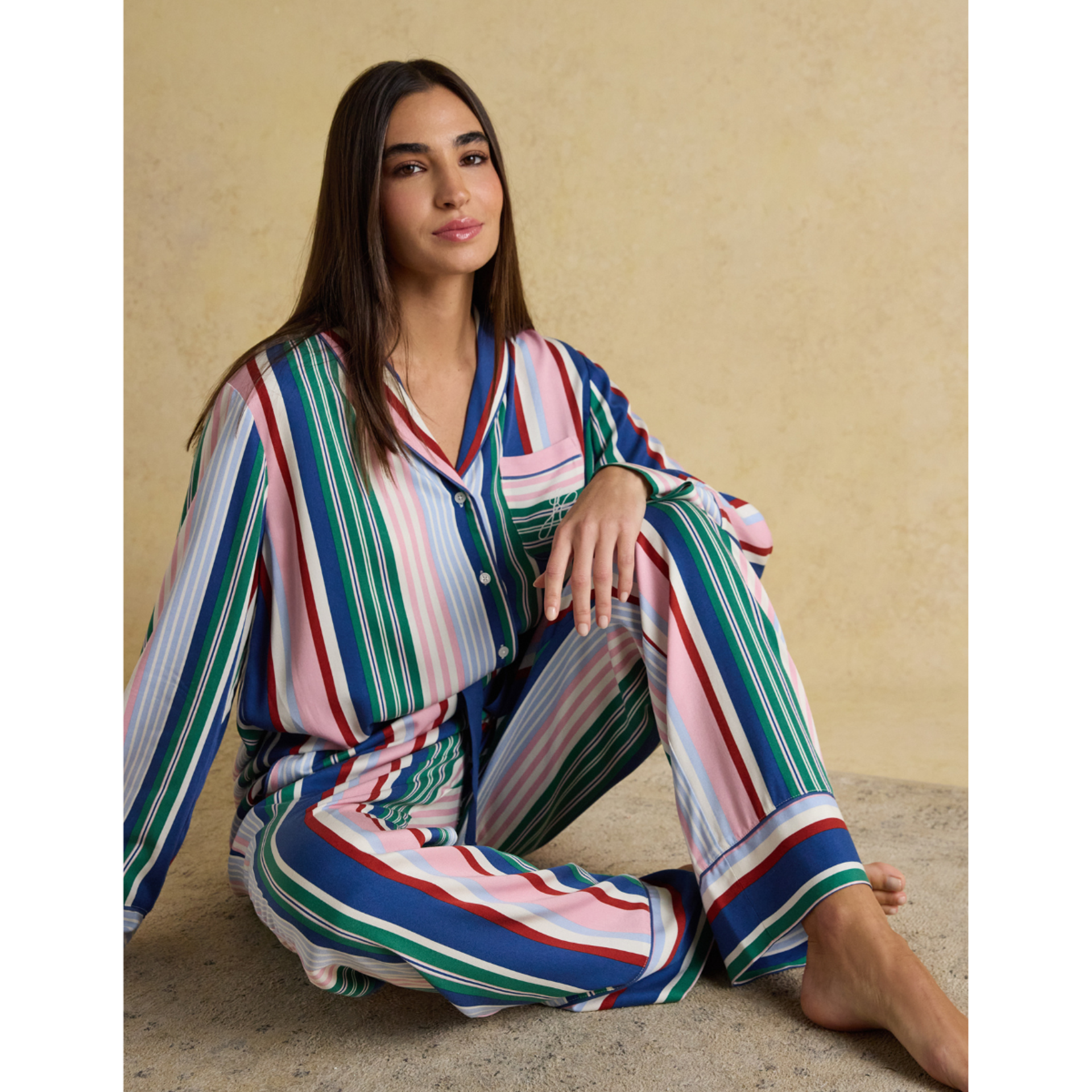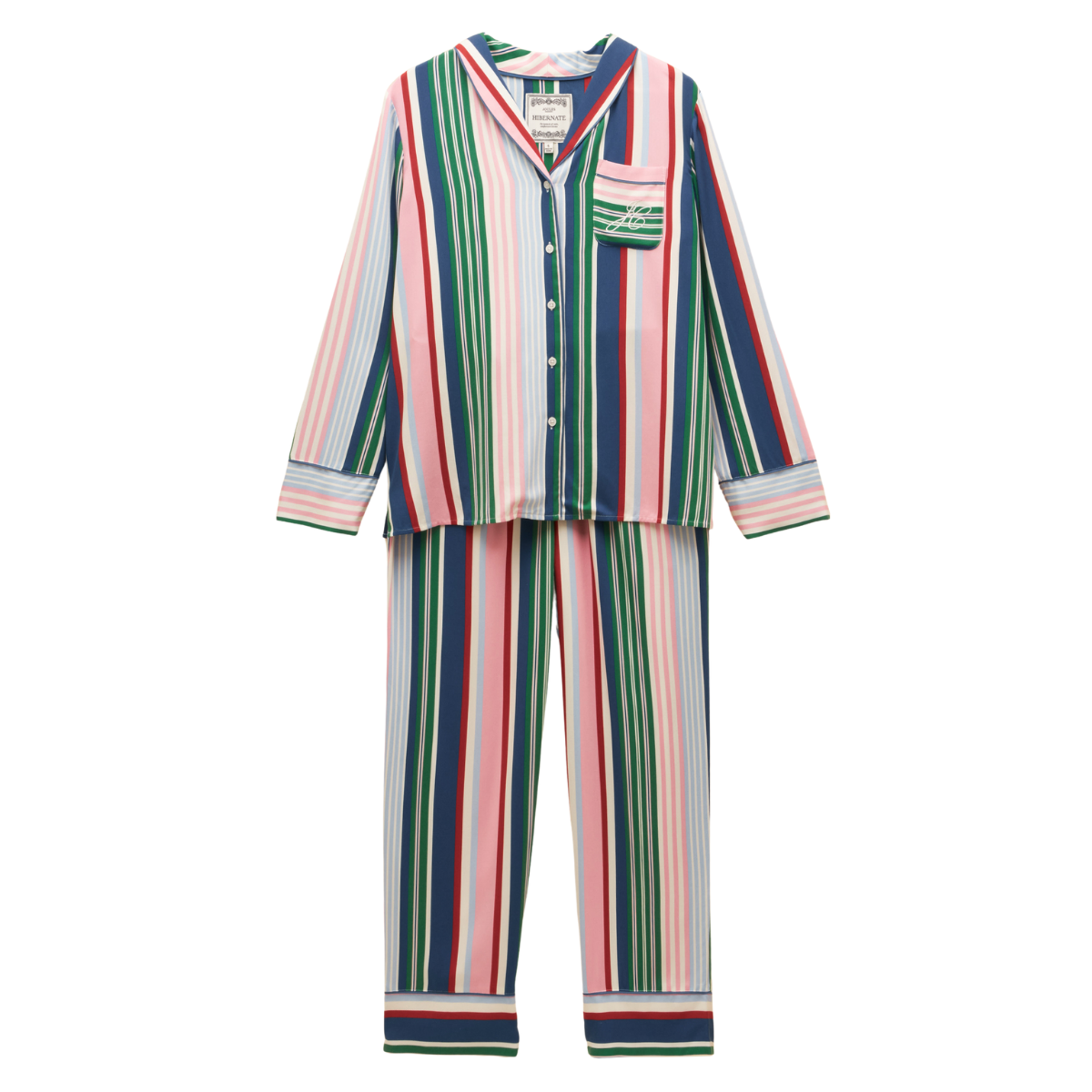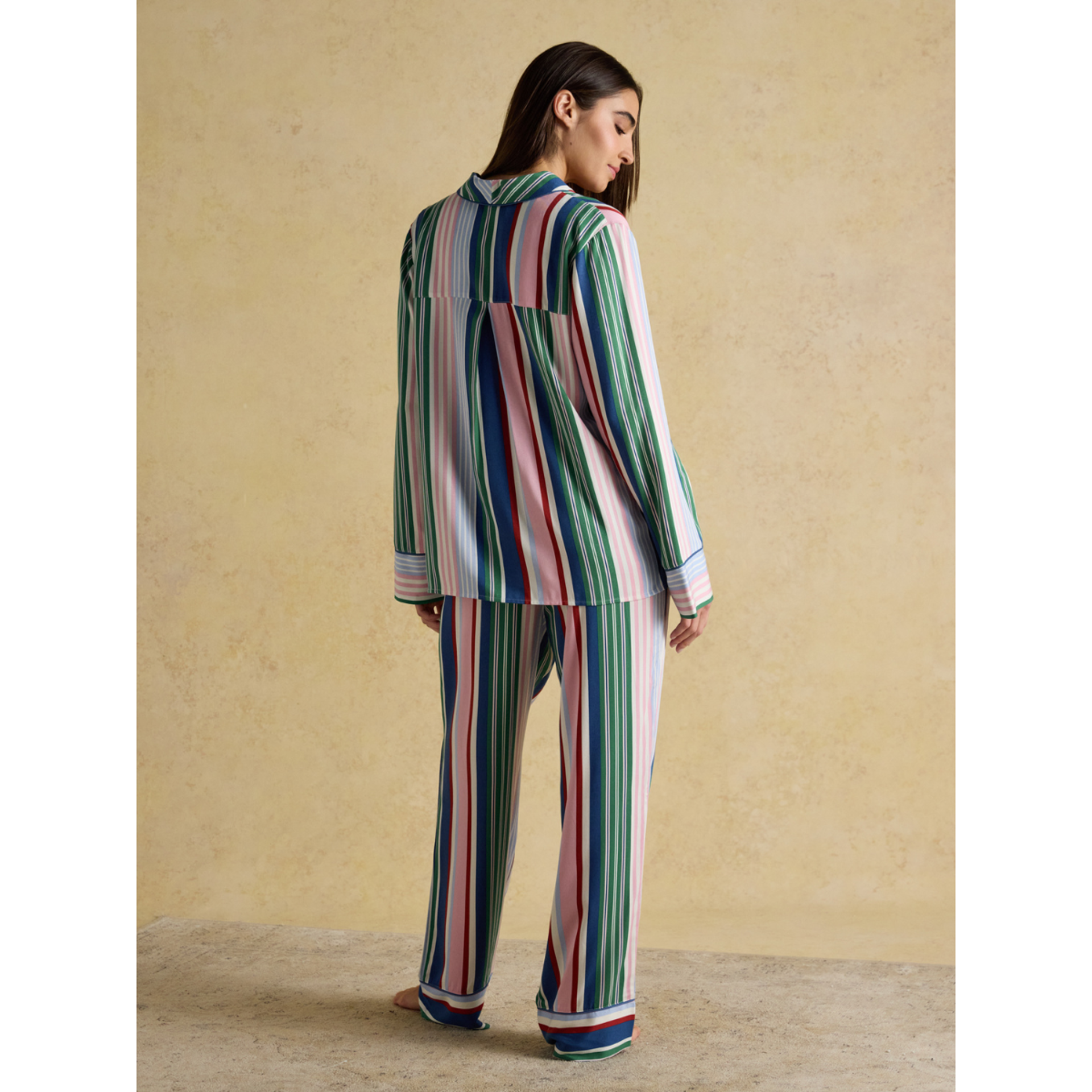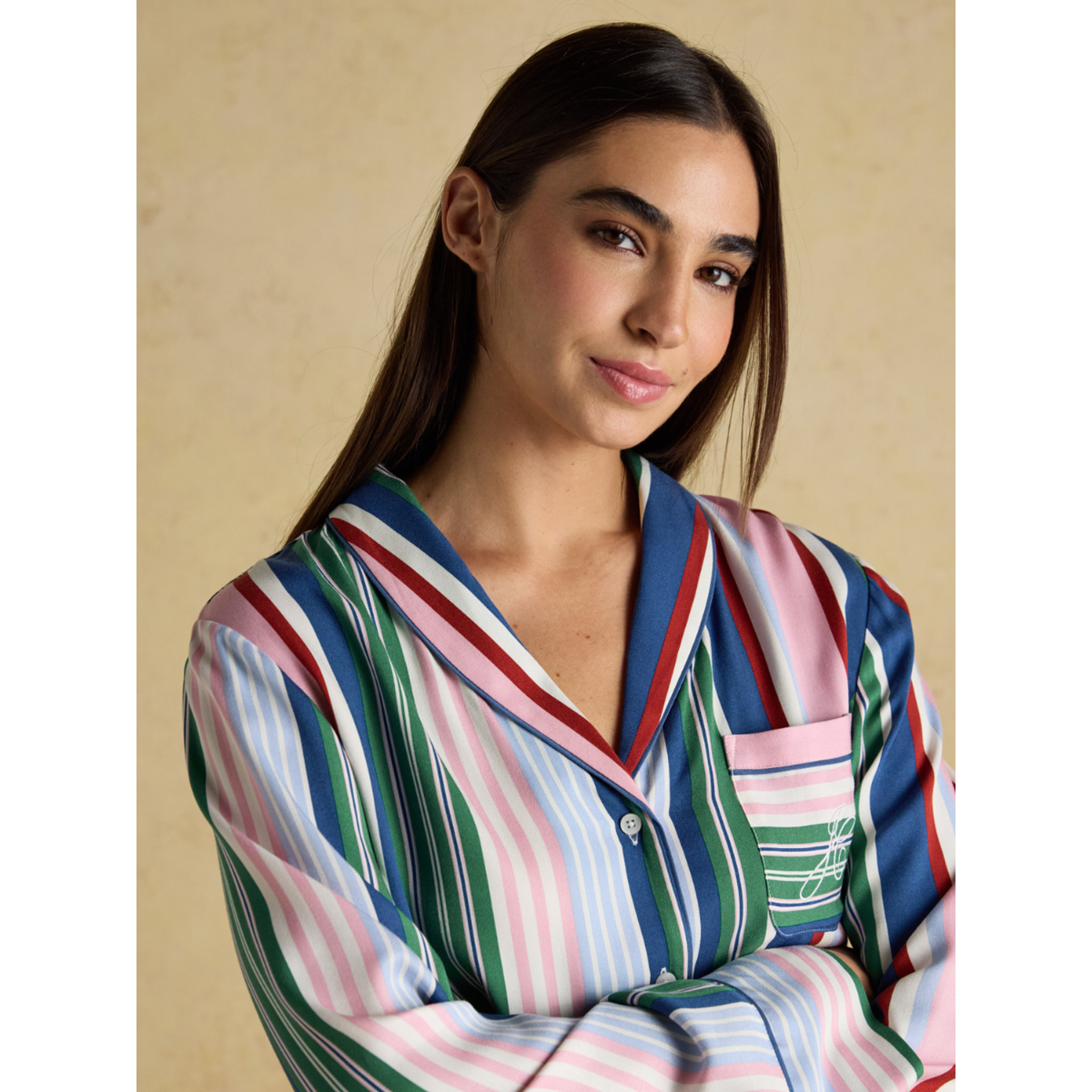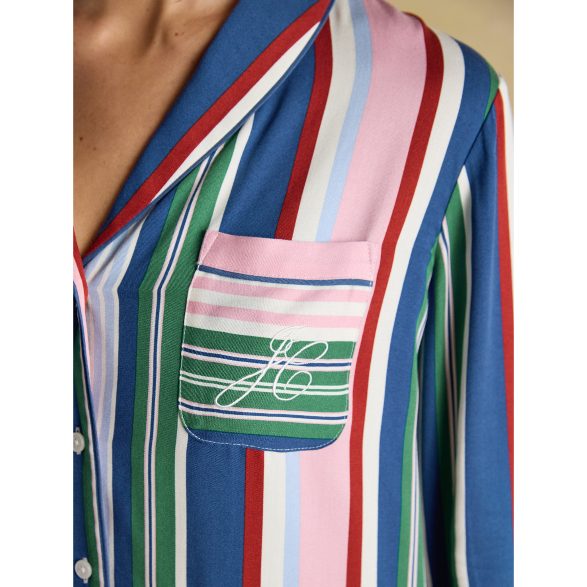 Sleep soundly and lounge in style with the Alma Pyjama Set. A timeless two-piece designed with comfort and those little Joules details that make all the difference. The shirt features a flattering shawl collar neckline with piped edging and a button-down front for a classic finish. Long sleeves, cuff piping, and a chest patch pocket add to its relaxed charm, while subtle side splits and a pleated back yoke ensure an easy, comfortable fit.