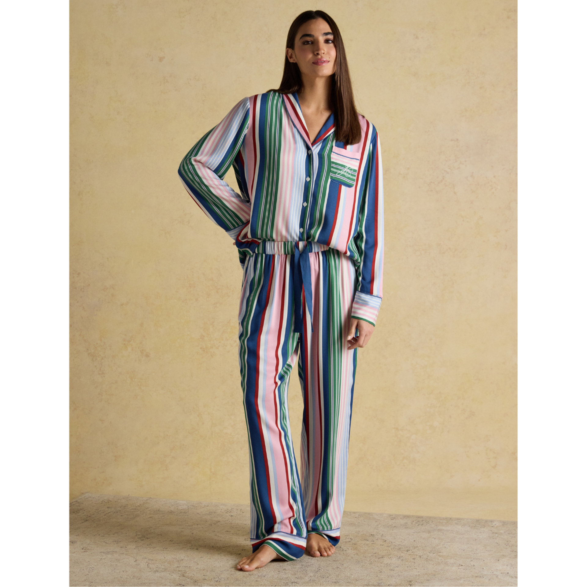 The trousers are just as thoughtfully designed, with a soft elasticated back waistband and a ribbon drawcord at the front for the perfect fit. Complete with printed Joules branding for a signature touch. Slanted side pockets, full-length legs, and piped cuffs complete this effortlessly stylish bedtime look.
