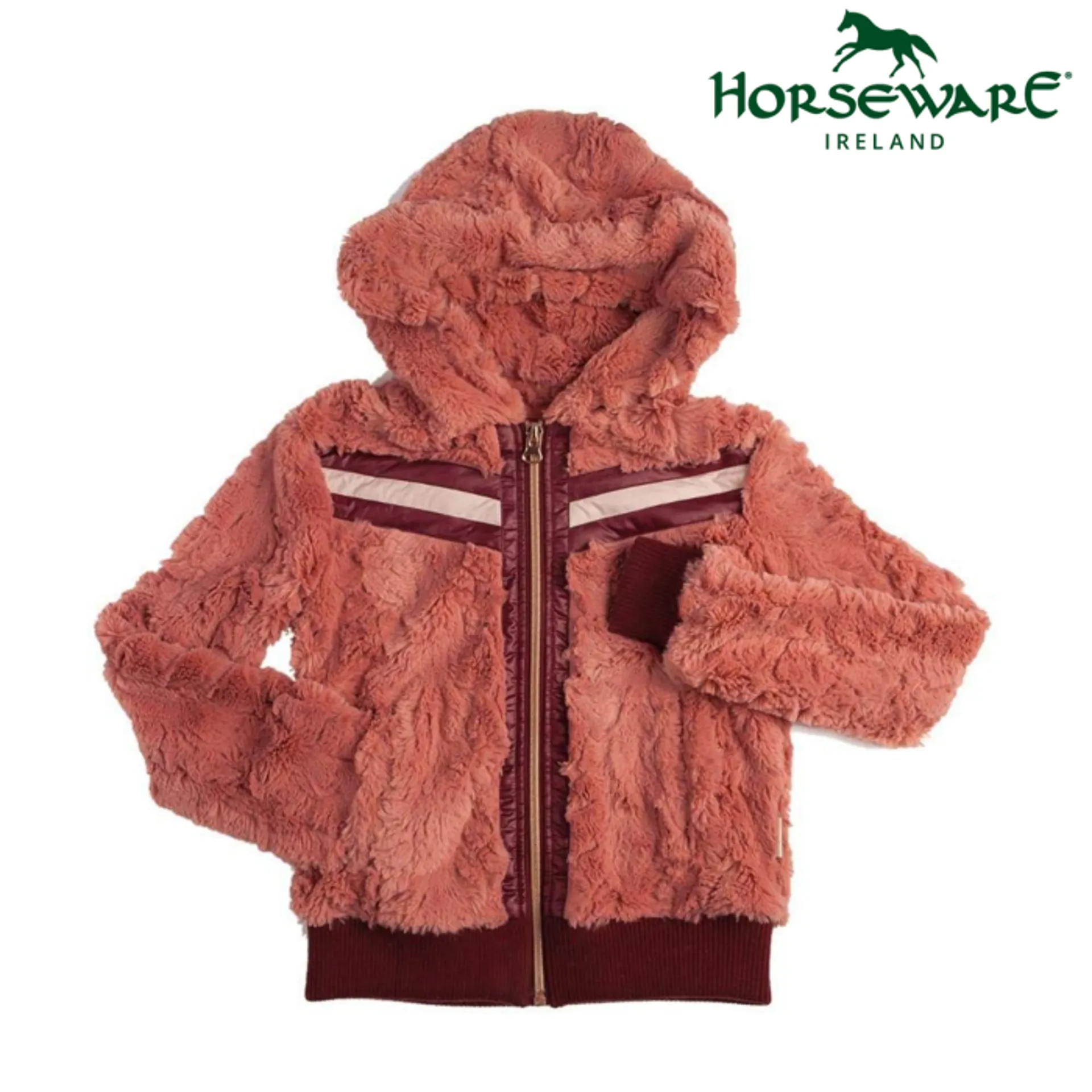 The perfect addition to a young equestrian's wardrobe. The adorable jacket has a luxurious soft and dreamy feel both inside and out that provides optimum comfortability and warmth. This jacket features sporty contrasting stripe detail and on-trend rose gold accessories. The Horseware Girls Super Luxe Faux Fur Hoodie Dusk Pink is machine washable.