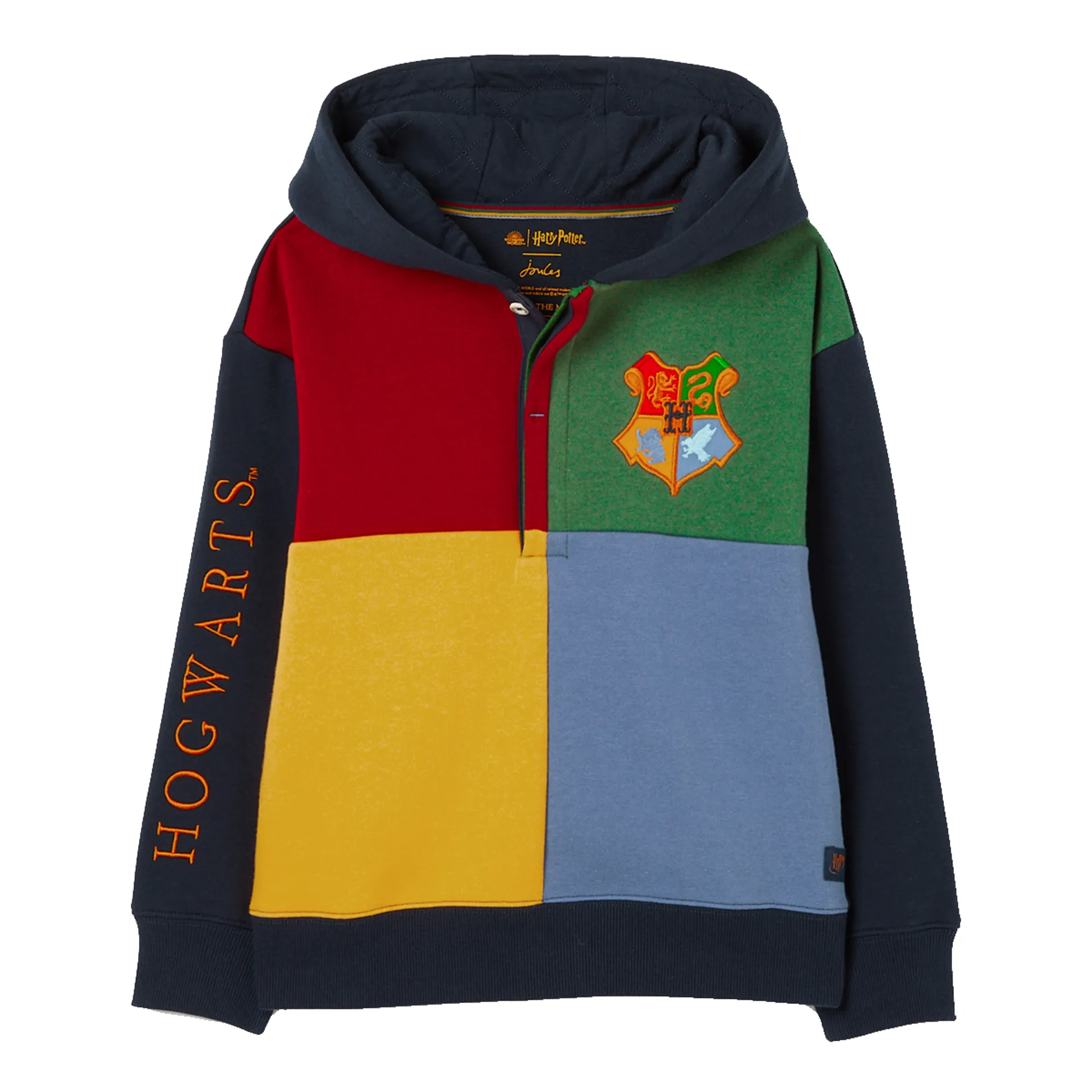 Inclusive of all Hogwarts™ houses, this hoodie is the ultimate style for any little one that considers themselves the biggest Harry Potter™ fan. The four house colours are boldly represented on the body of the jumper with 'Hogwarts' embroidered to the right arm (as worn) and the school crest has pride of place on the chest. Its concealed button placket and relaxed fit makes it a practical layering piece, while the hood with quilted lining adds a cosy element. It's finished with a ribbed hem and cuffs, a woven logo brand label and contrasting trims. Part of our official Harry Potter™ collection.