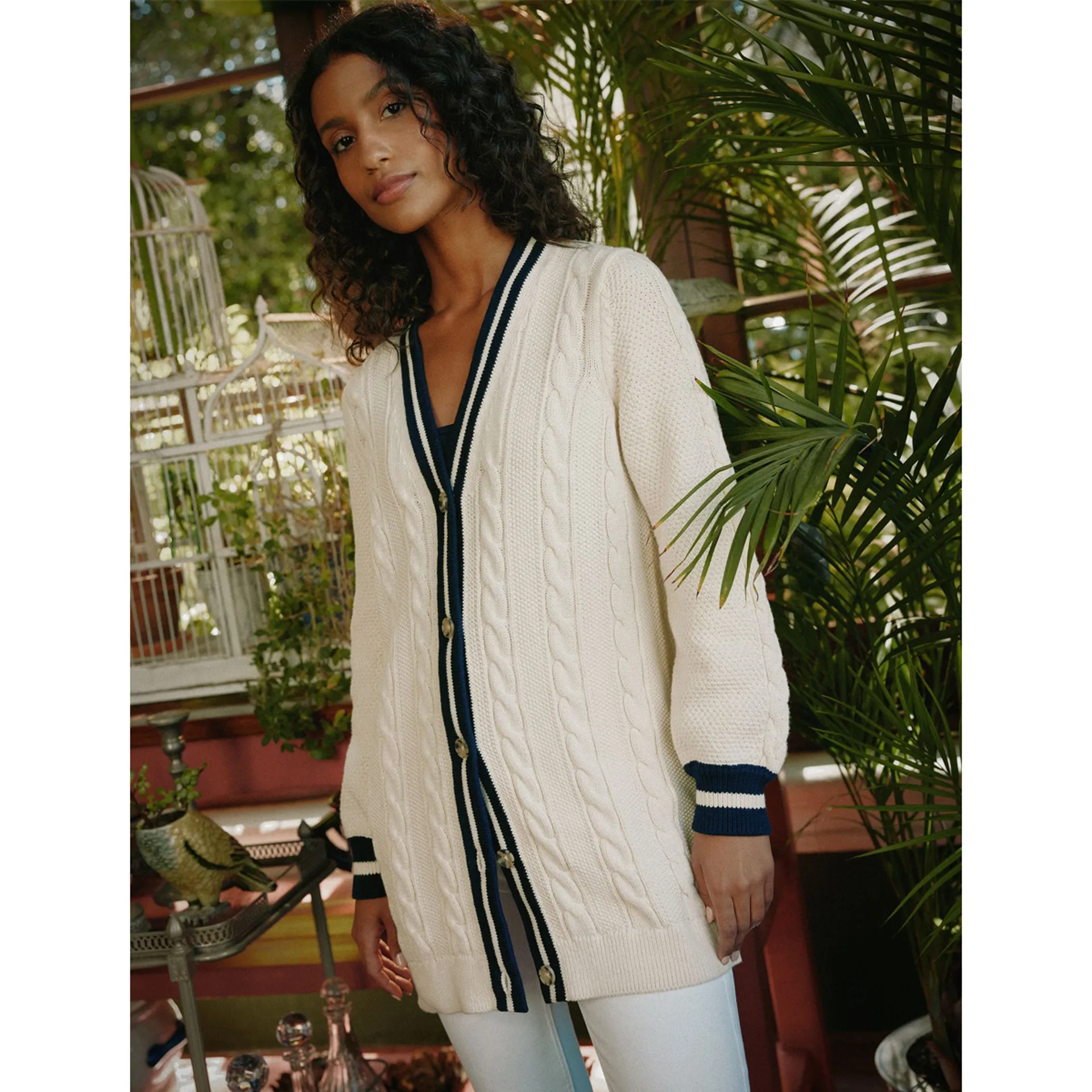 Question(s) answered about Joules Ladies Gamepoint Longline Cable Knit Cardigan - Creme Navy