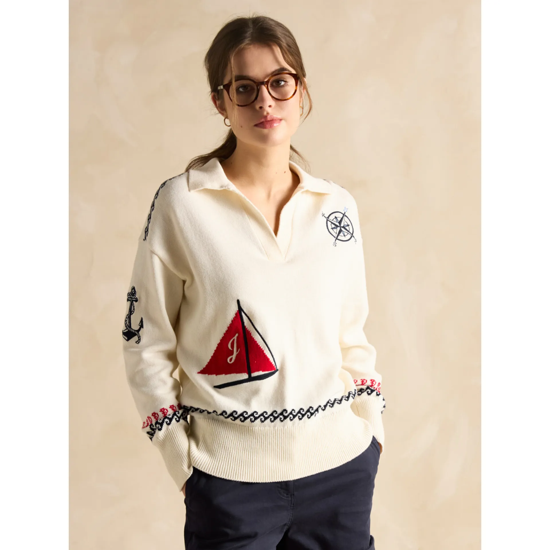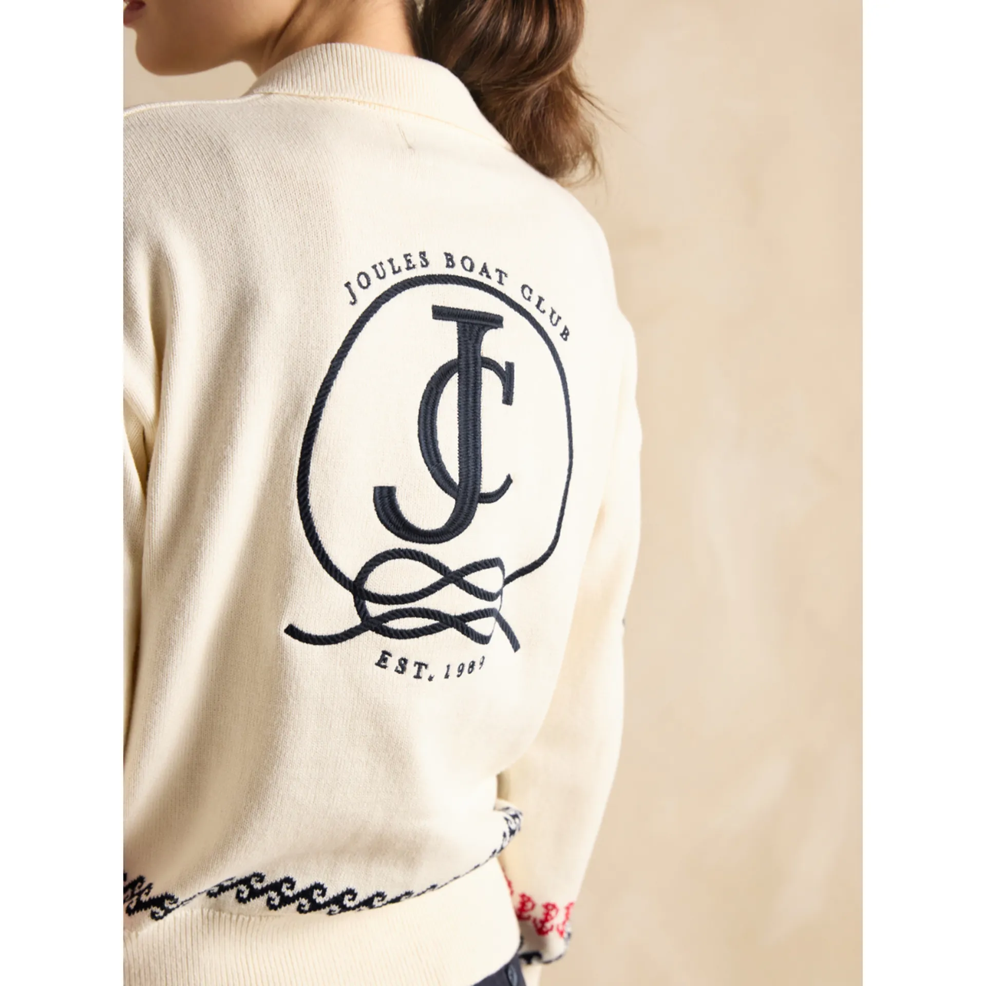 An anchor features on the right sleeve, a sailboat at the front and a compass to the chest. Turn it around for a large-scale Joules Boat Club embroidered emblem. For an extra coastal touch, intarsia wave and anchors have been added to the shoulders, hem and cuffs. It's finished with deep ribbed hem and cuffs. 100% cotton. Boxy fit through the body. Wide sleeves with deep ribbed cuffs. Open collar. Dropped shoulders. Intarsia and embroidery details to the front and back.