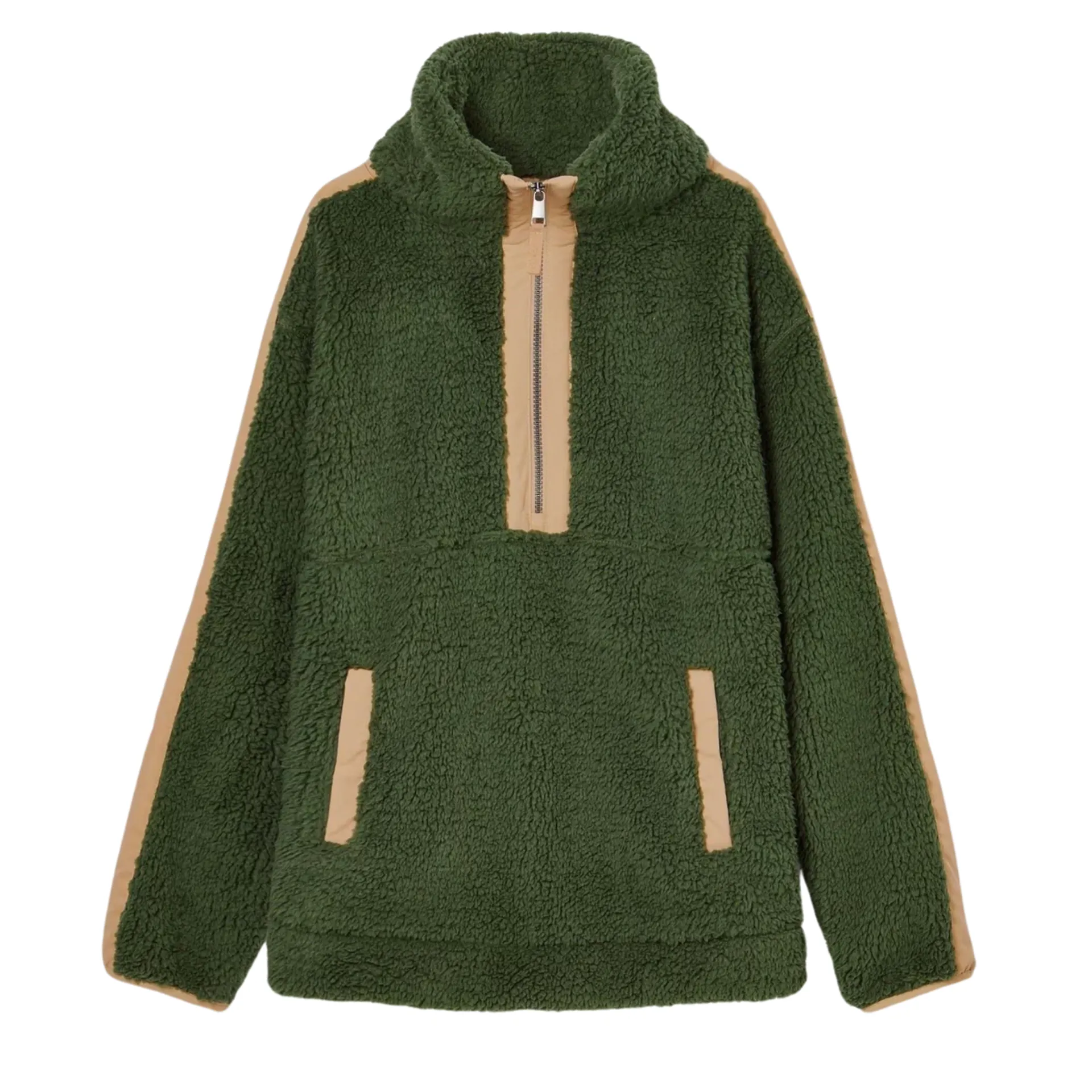 The cloud-like borg fleece fabric in green was adored by all, so of course that has stayed but it is now complemented by woven panels to the sleeves, pockets and zip placket for a sporty, 'athleisure' edge.