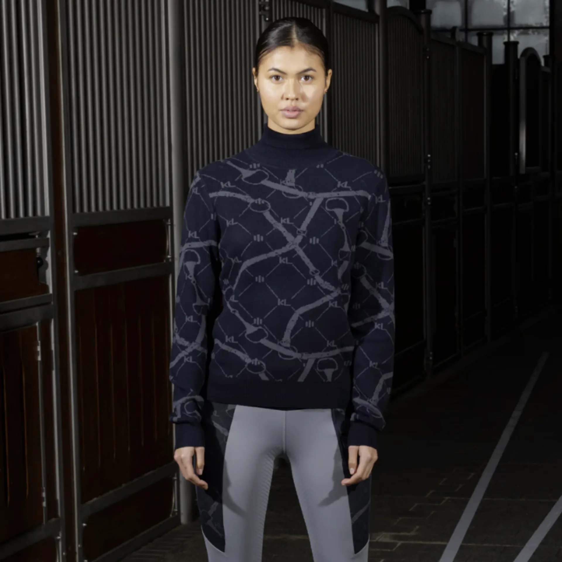 Knitted pullover crafted from the softest viscose blend, featuring an all-over print with a strong equestrian aesthetic. It is lightweight, moisture-wicking, and stretchy.