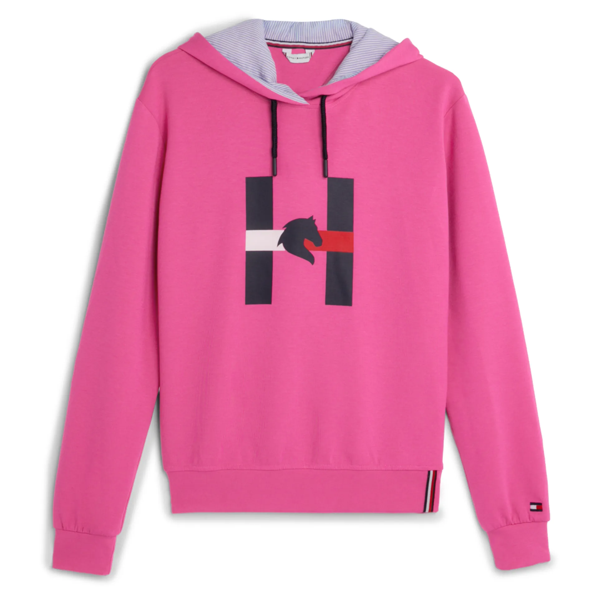 Hoodie with ribbed waistband and cuffs. The hood is lined with the Tommy Ithaca Stripe look and has drawstrings with rubberized closures. Features Hilfiger embroidery over the outer hood area and H Horse graphic print on the chest.