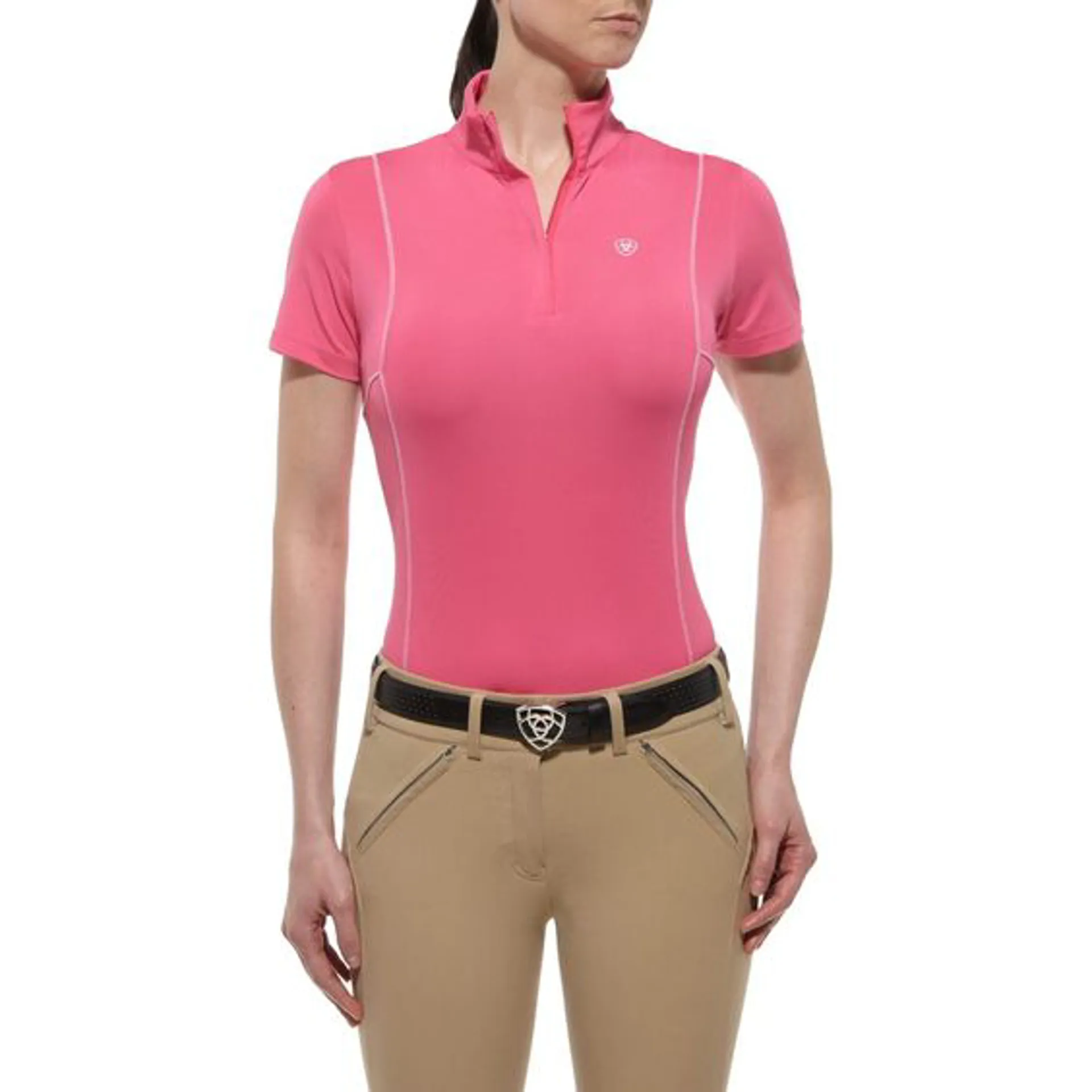 Ariat® Ladies Cambria 1/4 Zip Polo Shirt in Pink Paradise. The Ariat® Ladies Cambria 1/4 Zip Polo Shirt is a stretch jersey style top made with breathable mesh full length of the back and side panelling. The polo is made using MMT™ technology moisture movement technology which enables moisture to be pulled away from the skin to the outside to help keep you dry and comfortable.Machine Washable.