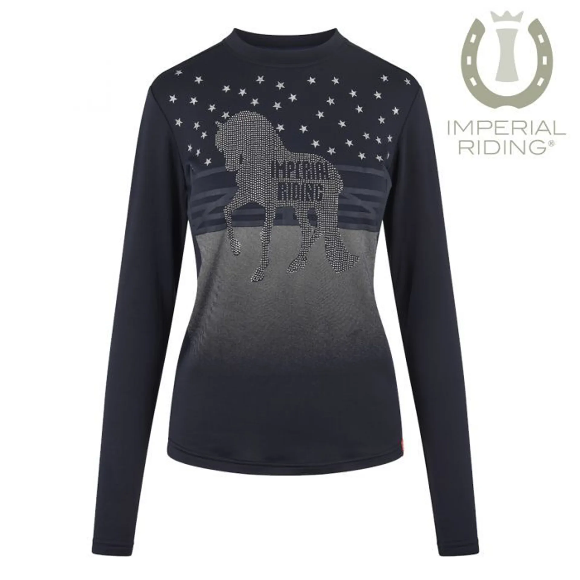 The shirt has long sleeves and a round neckline with a small collar. A stunningly beautiful print “horse under the starry sky” with glittering stars and fine pearl embroidery embellishes. Ombre colour effect towards the hem. The motif and the applications on the front give this shirt a stylish look, and they make it a true eye catcher. This shirt has a feminine cut with a long back which has a rounded hem at the back.